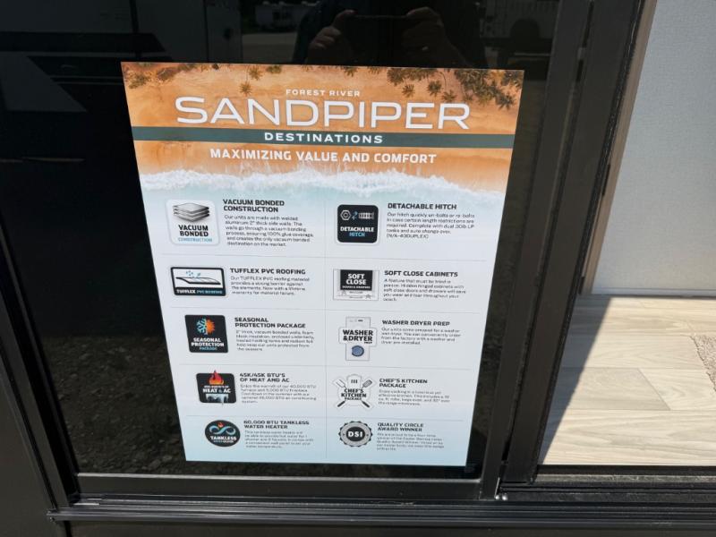 The Sandpiper Destination Trailers by Forest River are ready for extended stays at the location of your choice! The cambered powder coated frame with rust prohibitor will help extend the life of your RV and the Underbelly Armor will protect your trailer and provide better insulation. There are also color matched exterior fiberglass sidewalls outside, along with rain gutters with extra long drip spouts to prevent black streaking, and an exterior porch light just like at home. The Destination Package includes features to make your trips hassle-free, like the two 15,000 BTU A/C units, on-demand water heater, and Chef Collection three burner 24" range. A commercial style kitchen faucet and designer backsplash is included with the Extended Stay Package, as well as solid surface countertops, and a stainless steel apron sink with a strainer to name a few comforts. Available options include a central vacuum system, stabilizer jacks, plus dual pane windows and more!