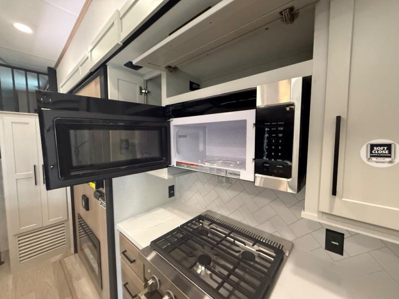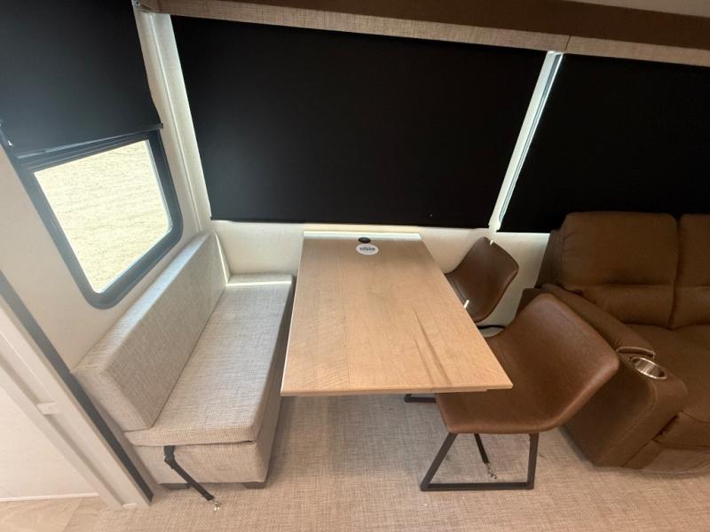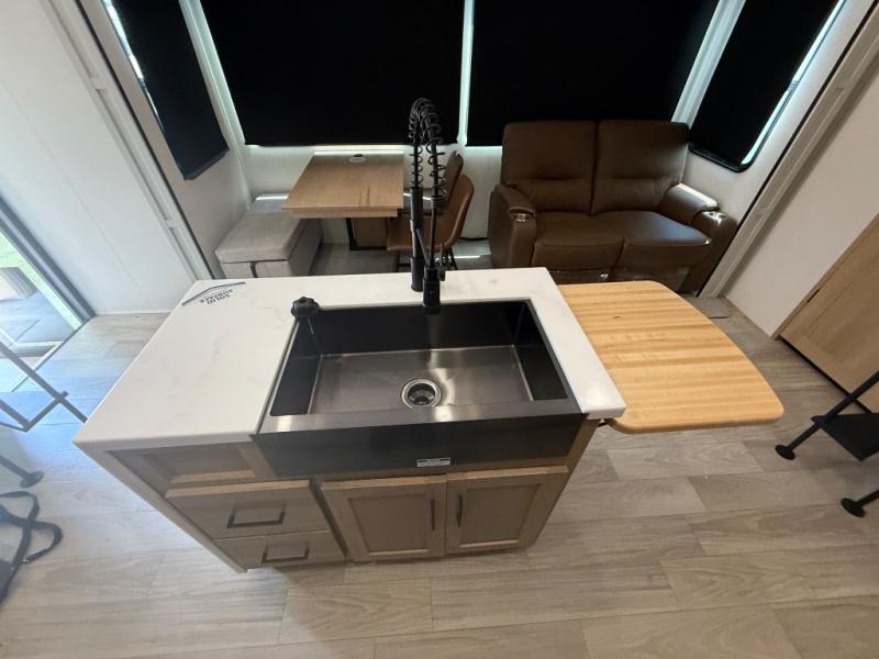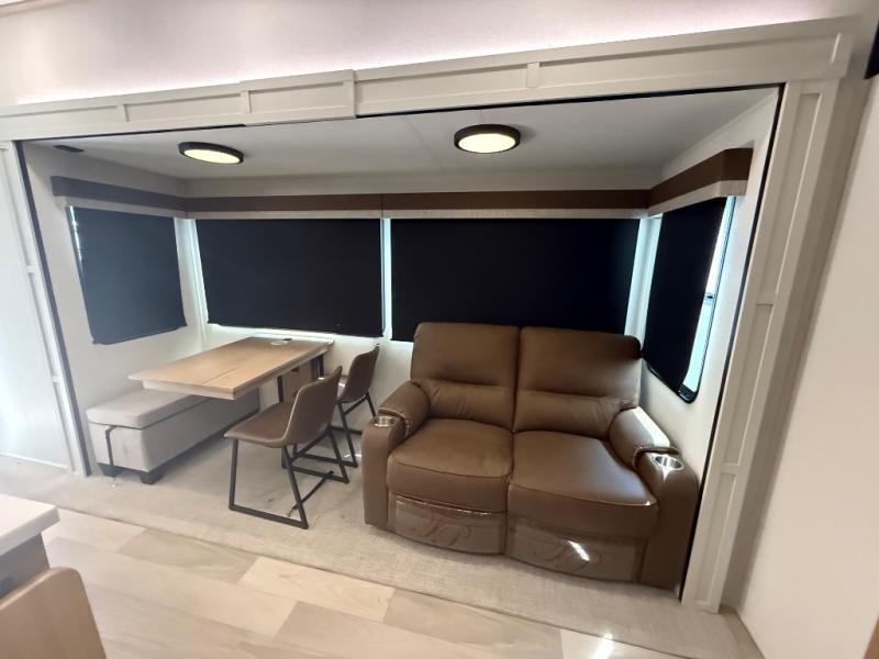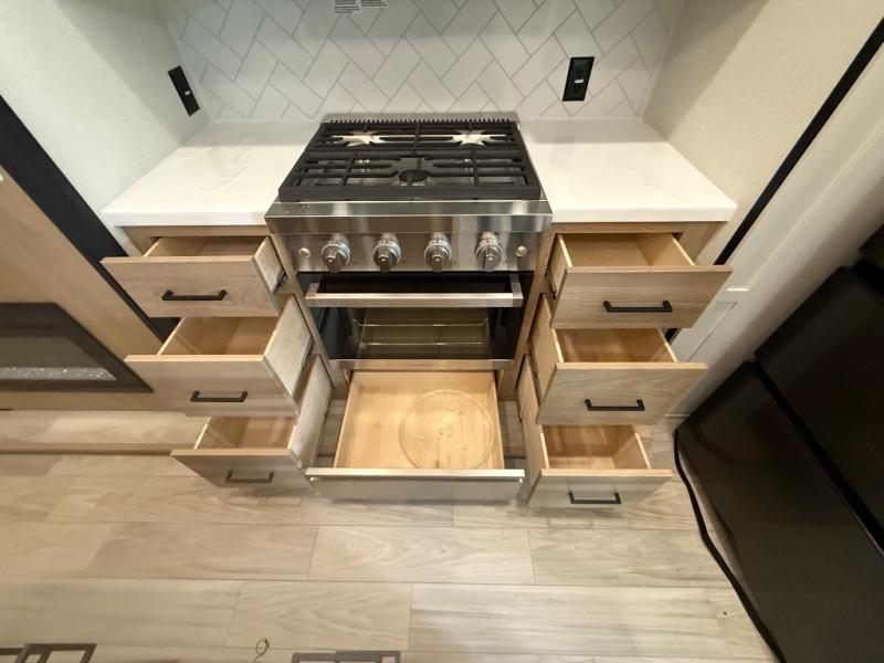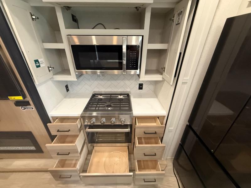 Kitchen Amenities: Equipped with a 19 cu. ft. 12V stainless steel refrigerator and a Chef Collection 3-burner, 24" range with drawer, facilitating home-like meal preparation.