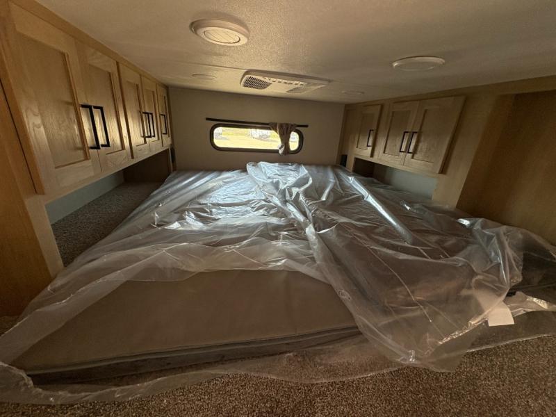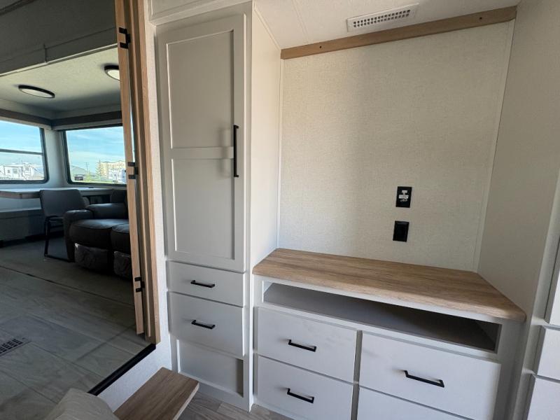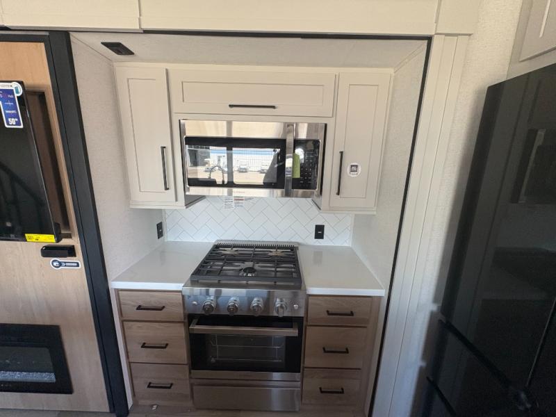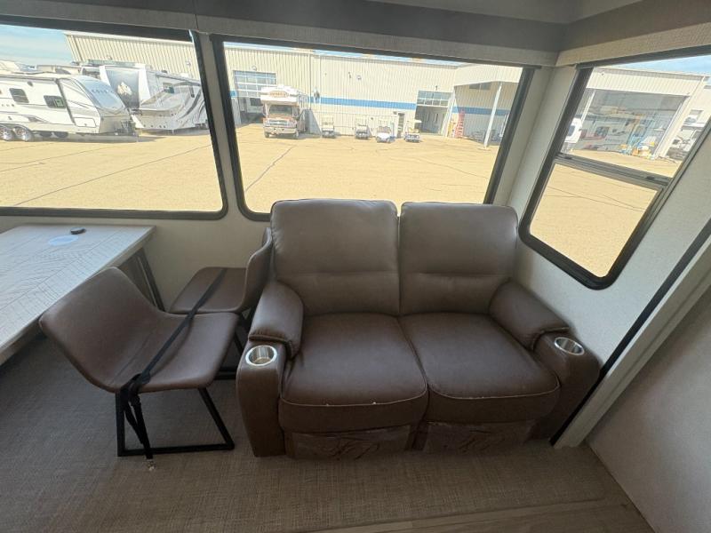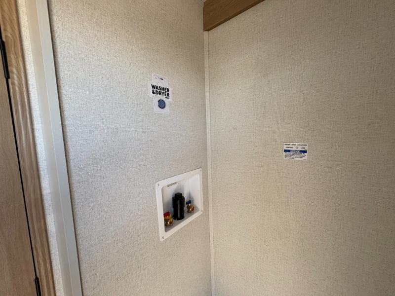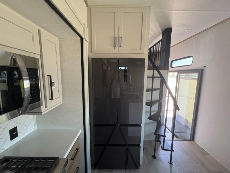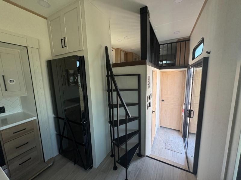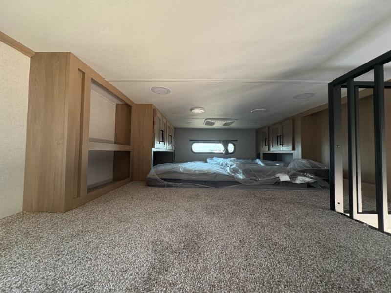 You won't believe the comfort and convenience found in this destination trailer. There are two private bedrooms; one up front with a queen bed slide out and storage space, and one in back with a queen bed slide out and a half bath! There is even washer and dryer prep here if you want to add those appliances and the second entry door is found here so you can easily slip out in the morning. Above each of these rooms is a loft area three total bunk mats, storage cabinets, and TV prep in the front loft if you want to add entertainment. Everyone can meet in the combined kitchen and living room that includes dual opposing slides, theater seating across from the 50" flat screen TV and fireplace, plus a free-standing dinette with chairs and bench seating. The chef of your group will love the large kitchen island with a countertop extension, a 16.2 cu. ft. 12V refrigerator, a hidden pantry, and more!