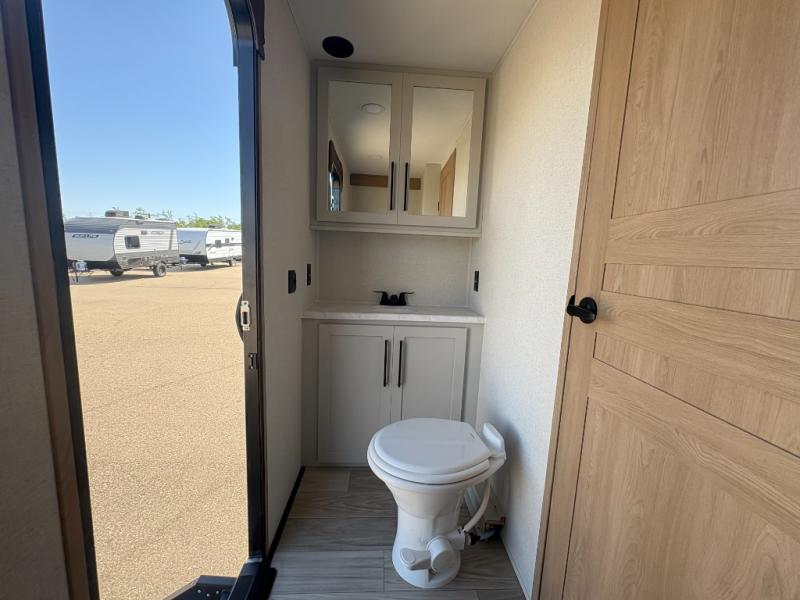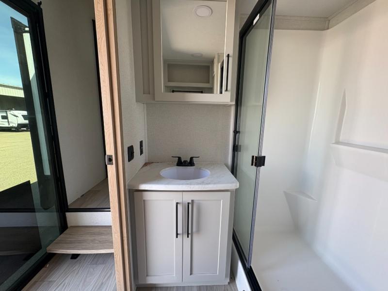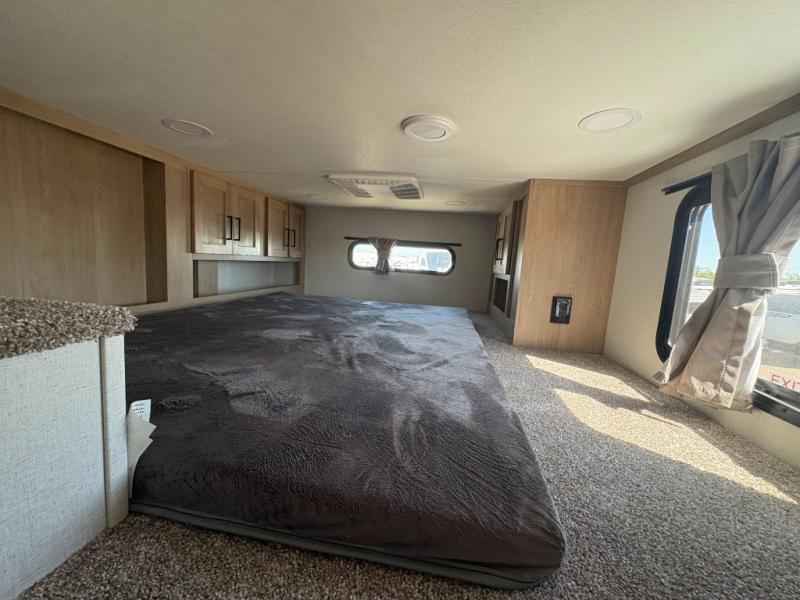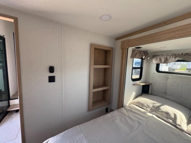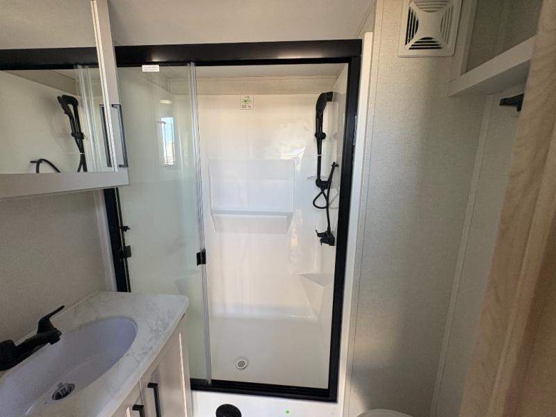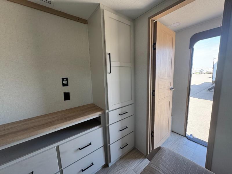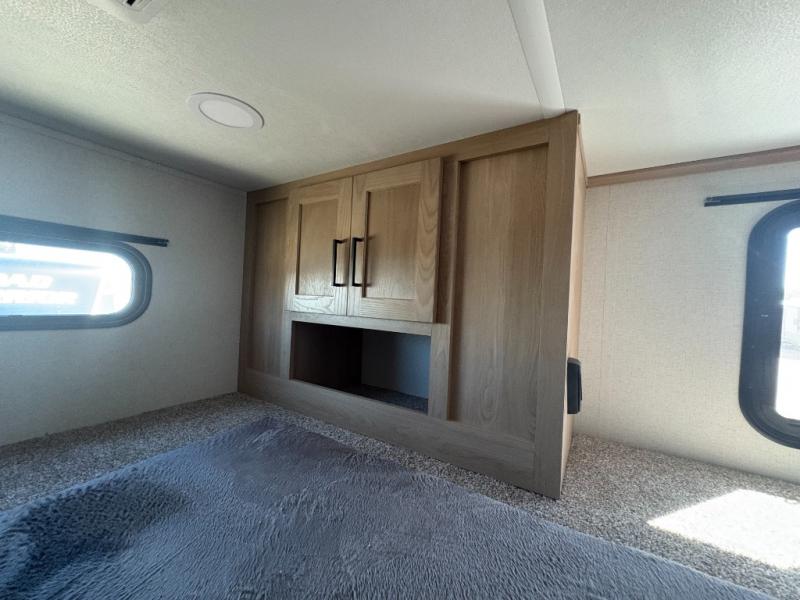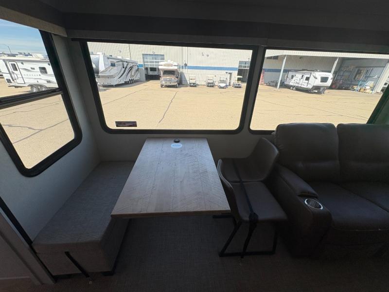 You won't believe the comfort and convenience found in this destination trailer. There are two private bedrooms; one up front with a queen bed slide out and storage space, and one in back with a queen bed slide out and a half bath! There is even washer and dryer prep here if you want to add those appliances and the second entry door is found here so you can easily slip out in the morning. Above each of these rooms is a loft area three total bunk mats, storage cabinets, and TV prep in the front loft if you want to add entertainment. Everyone can meet in the combined kitchen and living room that includes dual opposing slides, theater seating across from the 50" flat screen TV and fireplace, plus a free-standing dinette with chairs and bench seating. The chef of your group will love the large kitchen island with a countertop extension, a 16.2 cu. ft. 12V refrigerator, a hidden pantry, and more!