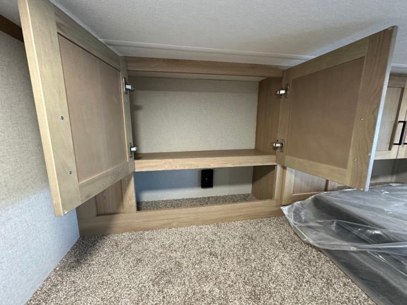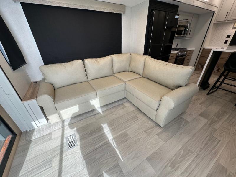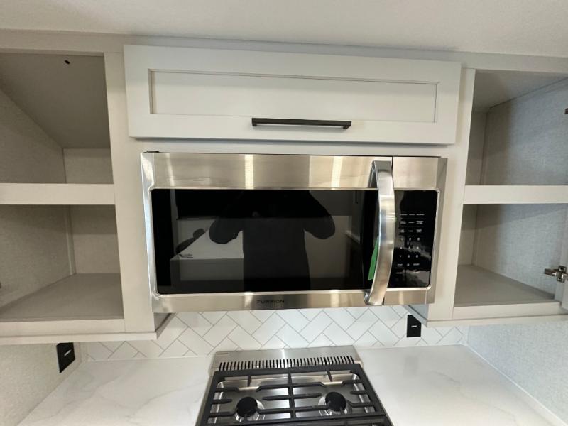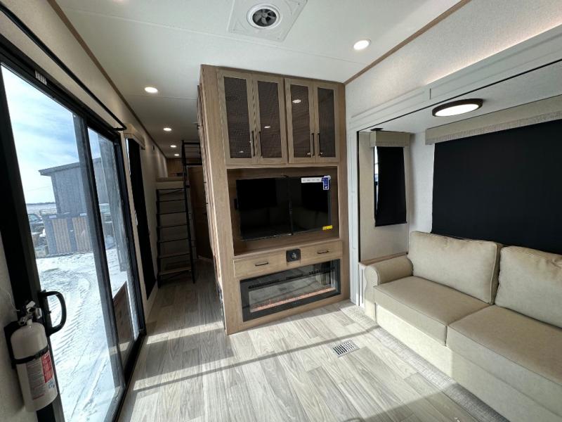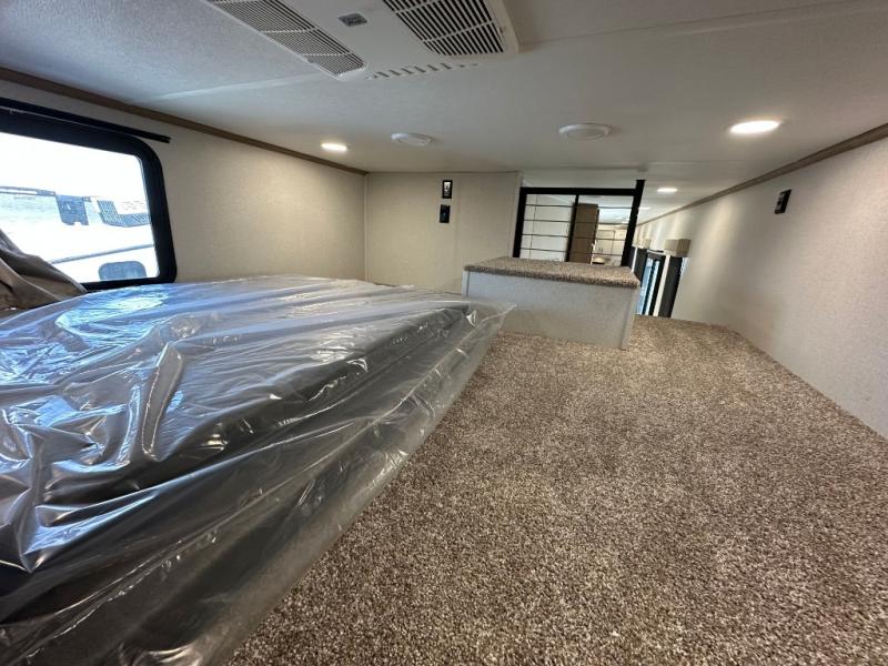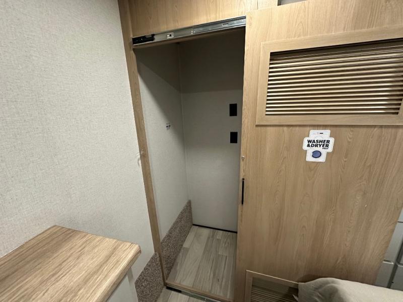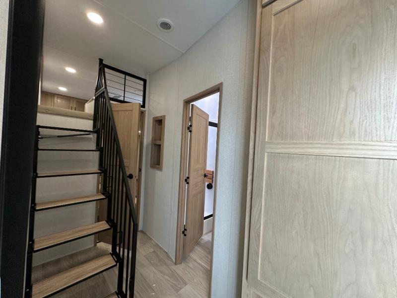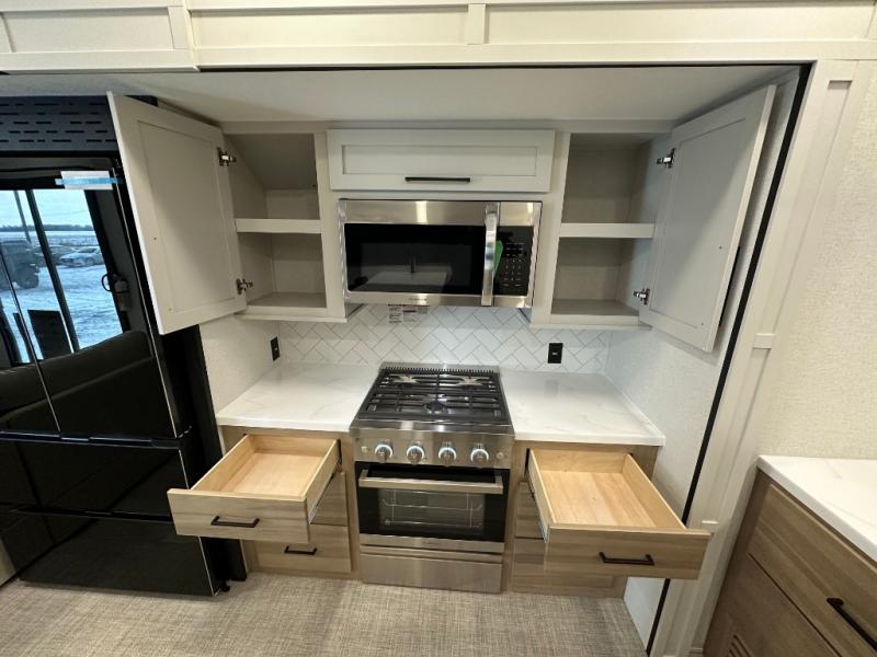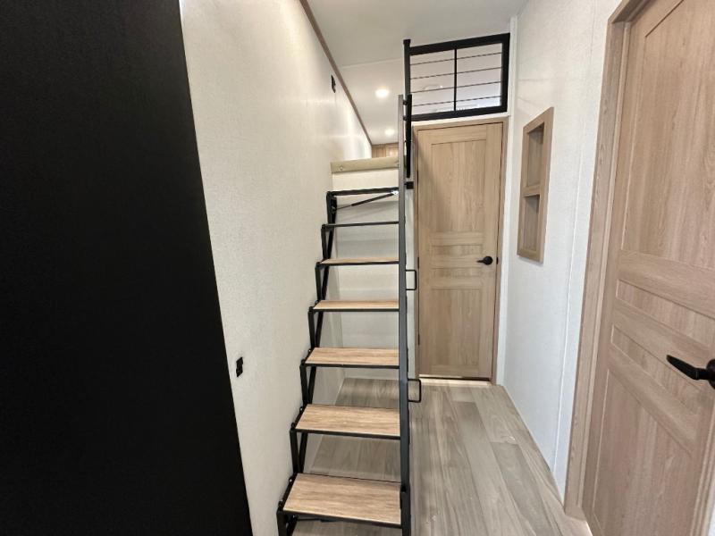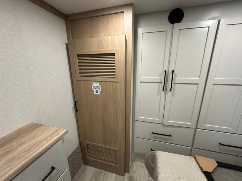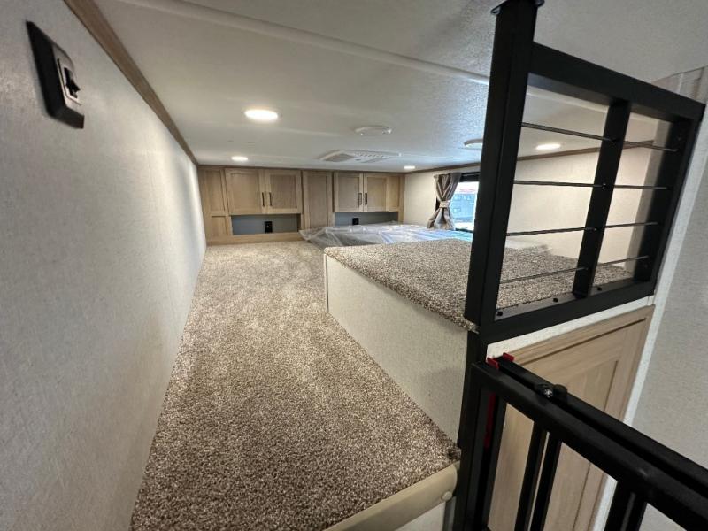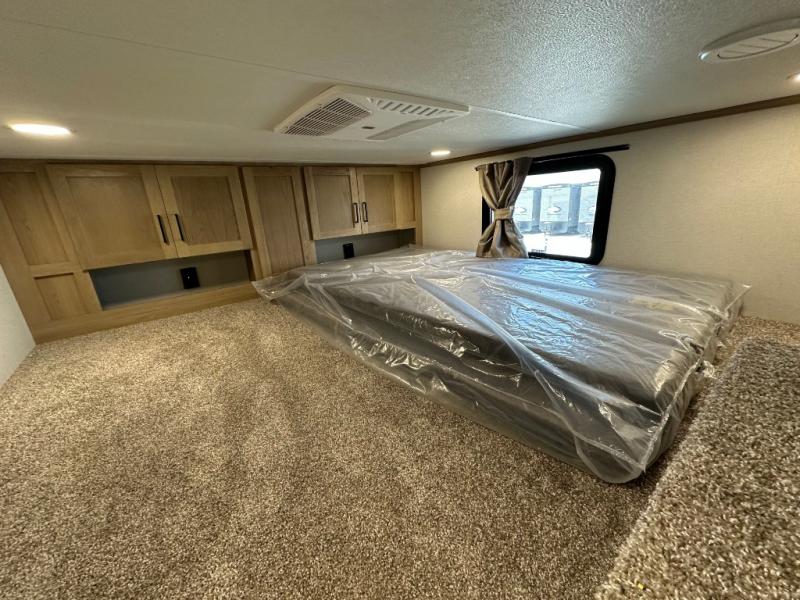 Comfort is found at every turn in this double slide out destination trailer. The chef of your group will love cooking in the front kitchen with ample counter space, a three burner cooktop and 30" over-the-range stainless microwave, plus a 19.6 cu. ft. 12V refrigerator and pantry for food storage. There is a free-standing dinette where you can dine together, and after dinner you can relax on the sectional sofa with an ottoman. There are stairs that lead to the loft area that includes two bunk bats, a wardrobe/cabinet, and two wardrobes/bookcases to keep this space tidy. And you'll enjoy your own space in the rear bedroom with its king bed slide out, large wardrobe and dresser, plus a closet with washer and dryer prep!