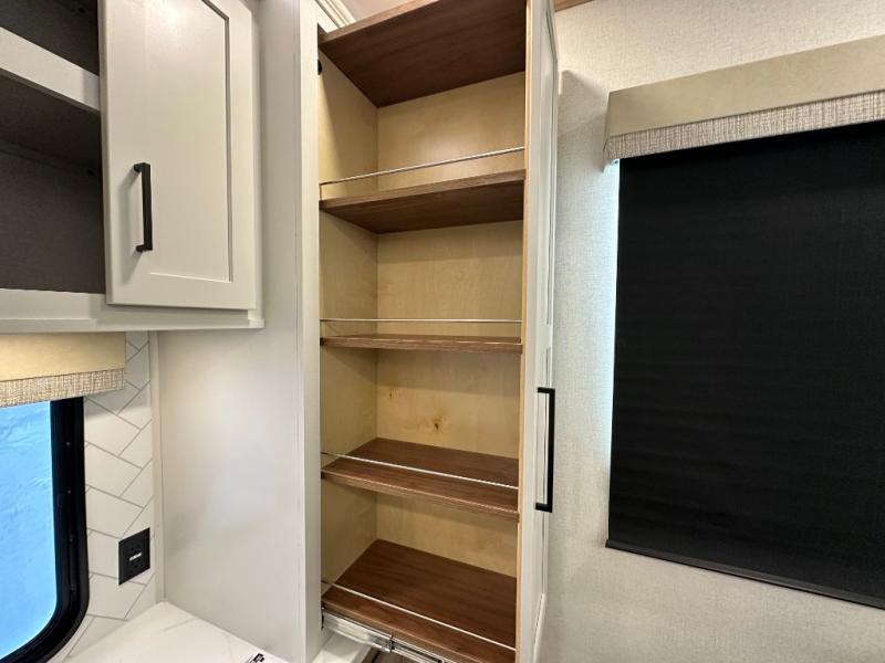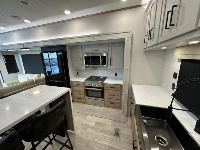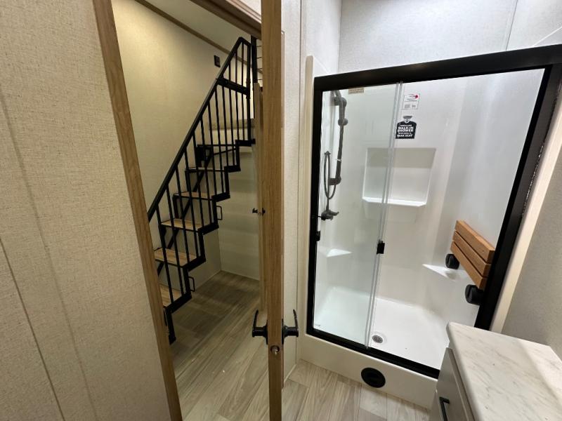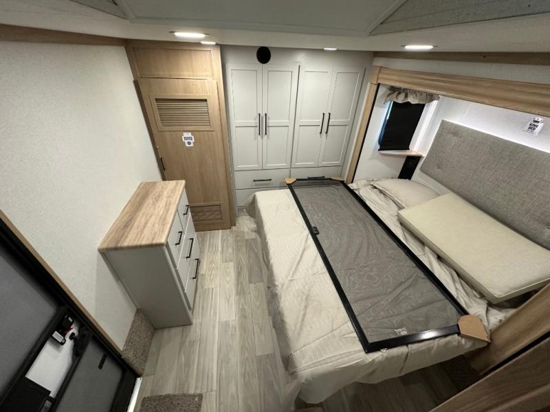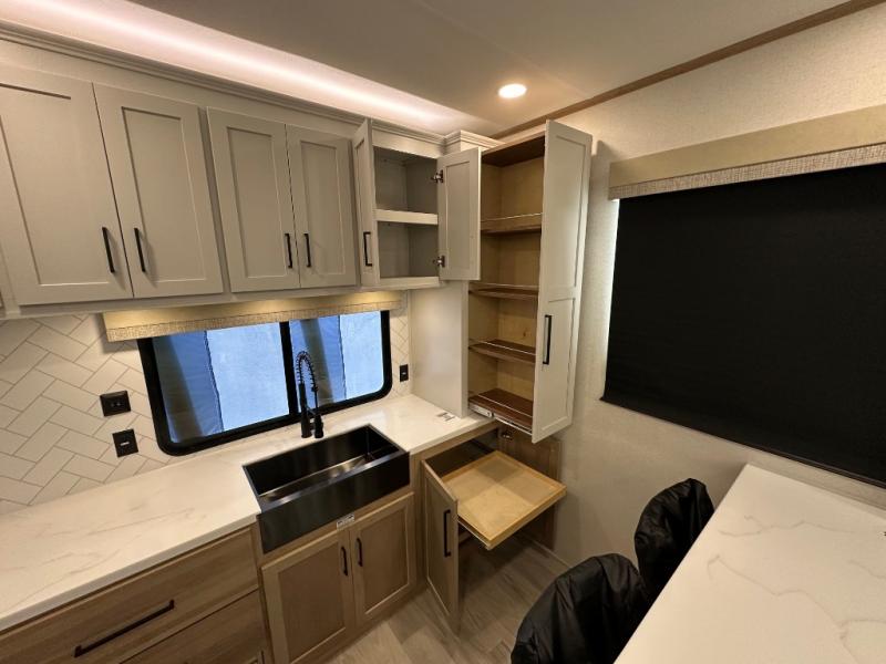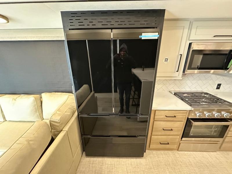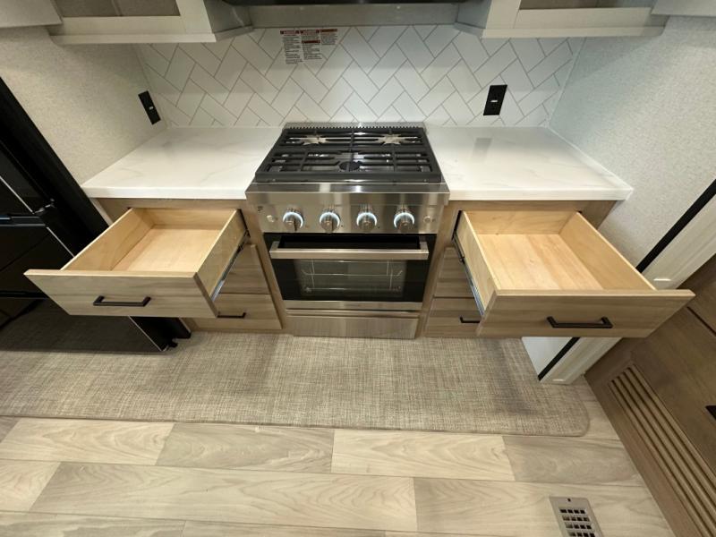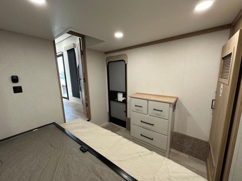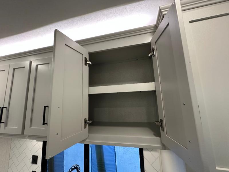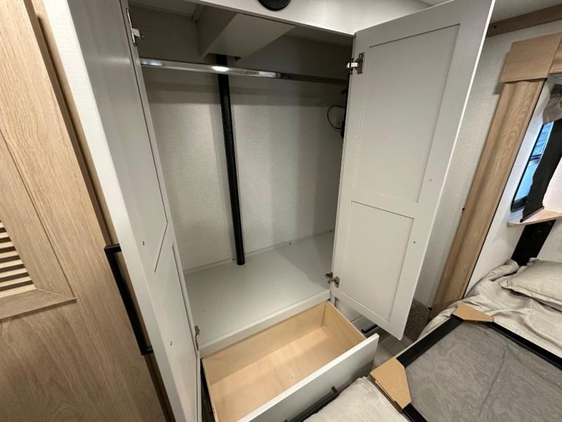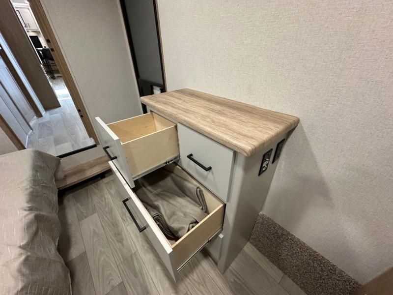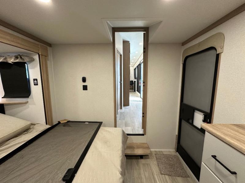 Comfort is found at every turn in this double slide out destination trailer. The chef of your group will love cooking in the front kitchen with ample counter space, a three burner cooktop and 30" over-the-range stainless microwave, plus a 19.6 cu. ft. 12V refrigerator and pantry for food storage. There is a free-standing dinette where you can dine together, and after dinner you can relax on the sectional sofa with an ottoman. There are stairs that lead to the loft area that includes two bunk bats, a wardrobe/cabinet, and two wardrobes/bookcases to keep this space tidy. And you'll enjoy your own space in the rear bedroom with its king bed slide out, large wardrobe and dresser, plus a closet with washer and dryer prep!