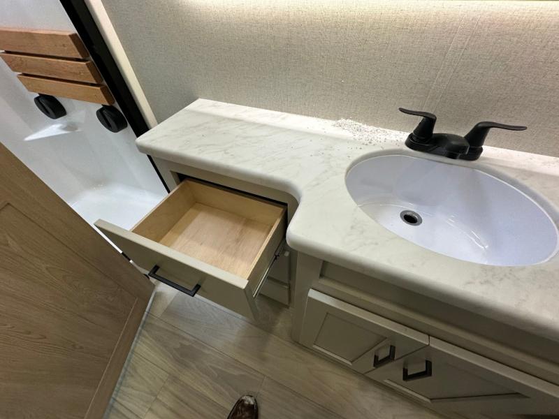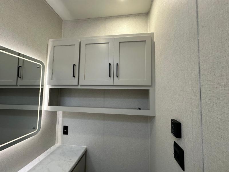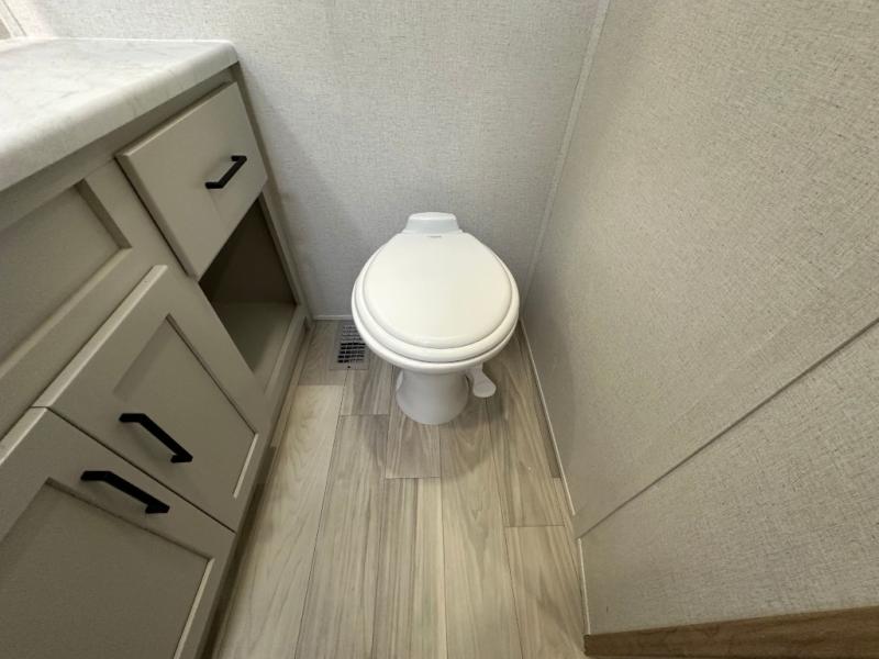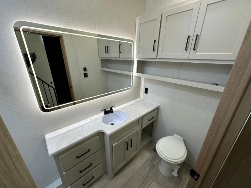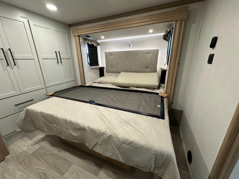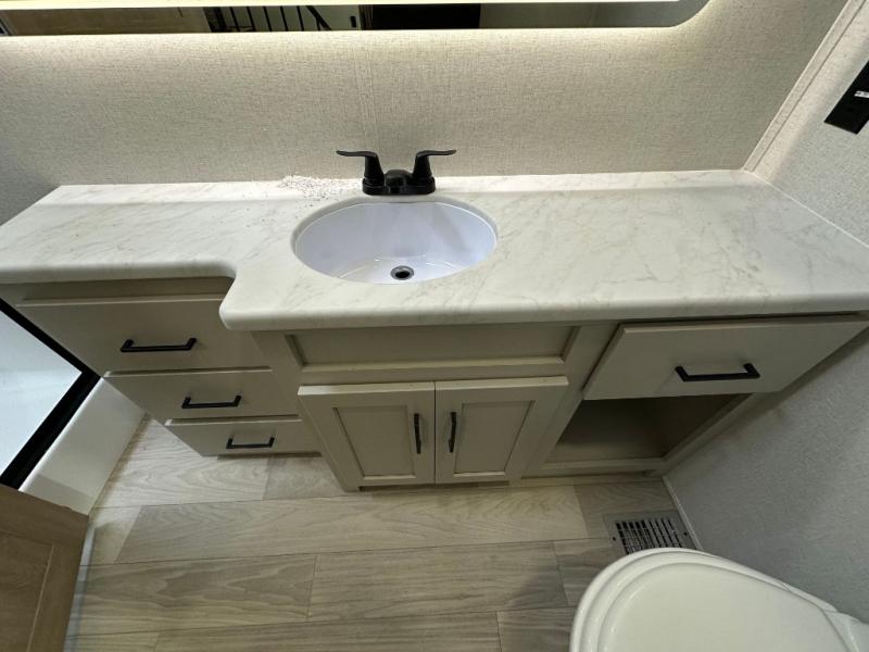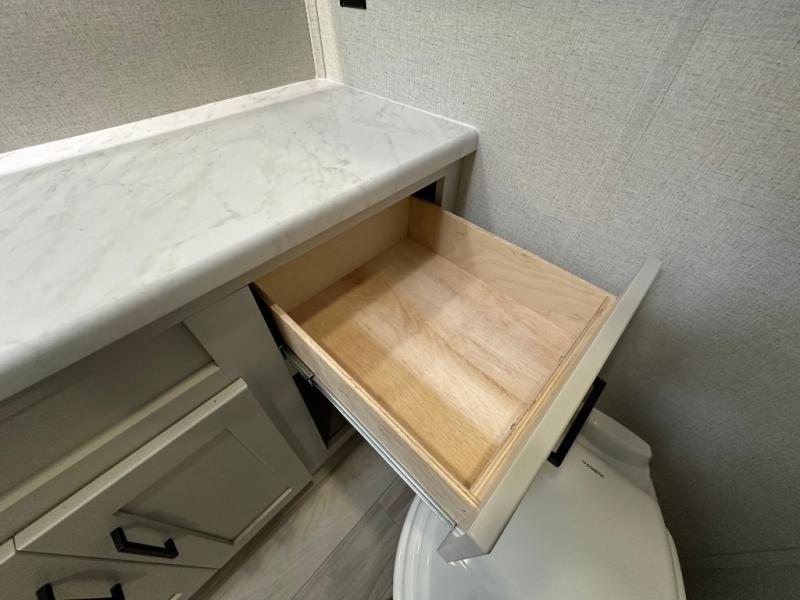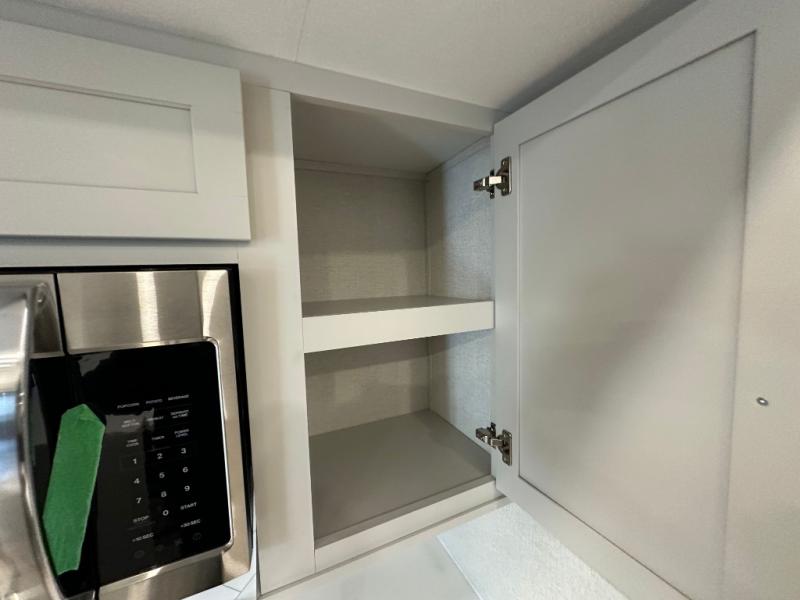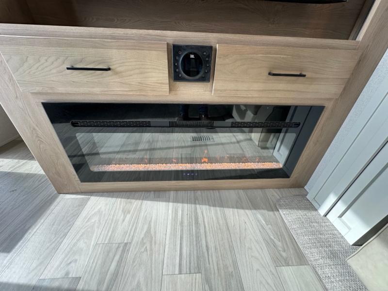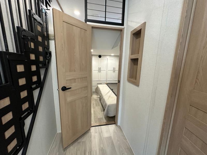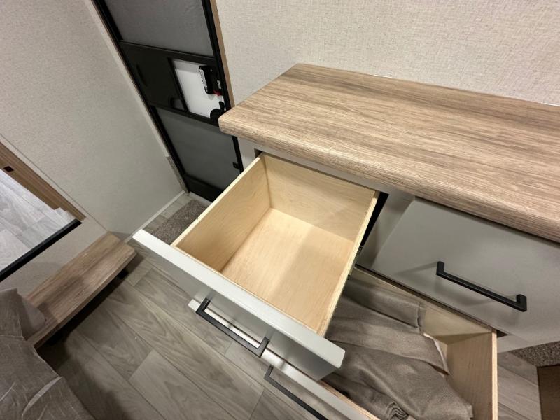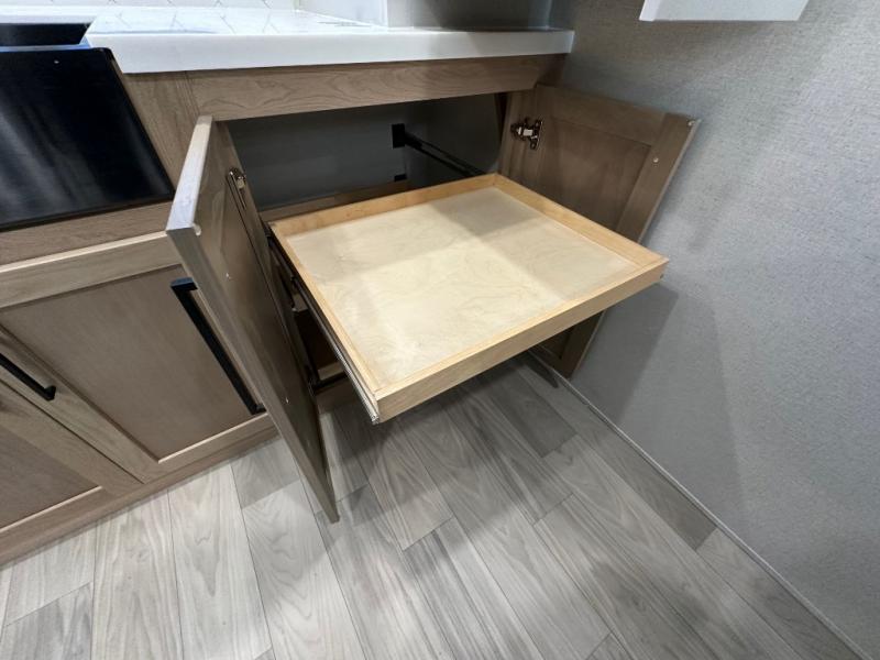Comfort is found at every turn in this double slide out destination trailer. The chef of your group will love cooking in the front kitchen with ample counter space, a three burner cooktop and 30" over-the-range stainless microwave, plus a 19.6 cu. ft. 12V refrigerator and pantry for food storage. There is a free-standing dinette where you can dine together, and after dinner you can relax on the sectional sofa with an ottoman. There are stairs that lead to the loft area that includes two bunk bats, a wardrobe/cabinet, and two wardrobes/bookcases to keep this space tidy. And you'll enjoy your own space in the rear bedroom with its king bed slide out, large wardrobe and dresser, plus a closet with washer and dryer prep!