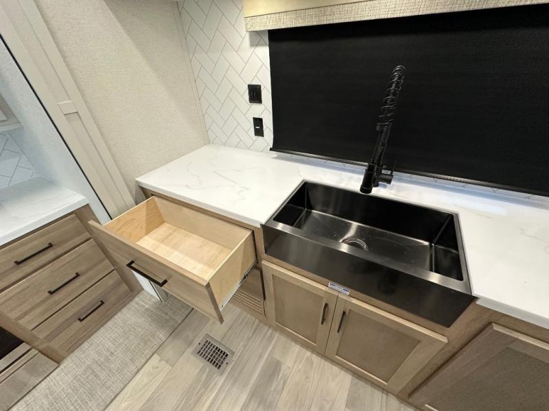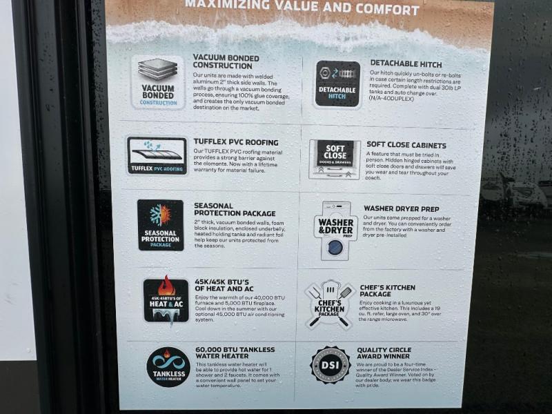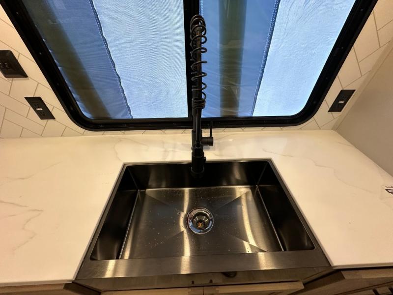The Sandpiper Destination Trailers by Forest River are ready for extended stays at the location of your choice! The cambered powder coated frame with rust prohibitor will help extend the life of your RV and the Underbelly Armor will protect your trailer and provide better insulation. There are also color matched exterior fiberglass sidewalls outside, along with rain gutters with extra long drip spouts to prevent black streaking, and an exterior porch light just like at home. The Destination Package includes features to make your trips hassle-free, like the two 15,000 BTU A/C units, and on-demand water heater, and Chef Collection three burner 24" range. A commercial style kitchen faucet and designer backsplash is included with the Extended Stay Package, as well as solid surface countertops, and a stainless steel apron sink with a strainer to name a few comforts. Available options include a central vacuum system, stabilizer jacks, plus dual pane windows and more!