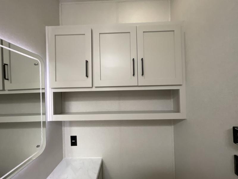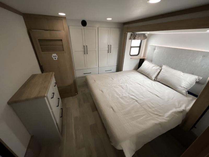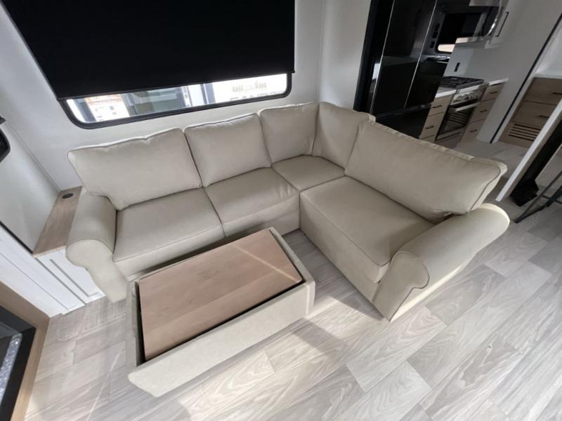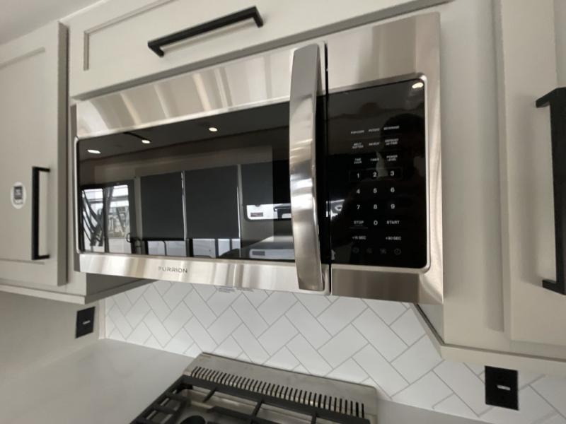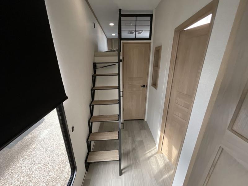 Comfort is found at every turn in this double slide out destination trailer. The chef of your group will love cooking in the front kitchen with ample counter space, a three burner cooktop and 30" over-the-range stainless microwave, plus a 19.6 cu. ft. 12V refrigerator and pantry for food storage. There is a free-standing dinette where you can dine together, and after dinner you can relax on the sectional sofa with an ottoman. There are stairs that lead to the loft area that includes two bunk bats, a wardrobe/cabinet, and two wardrobes/bookcases to keep this space tidy. And you'll enjoy your own space in the rear bedroom with its king bed slide out, large wardrobe and dresser, plus a closet with washer and dryer prep!