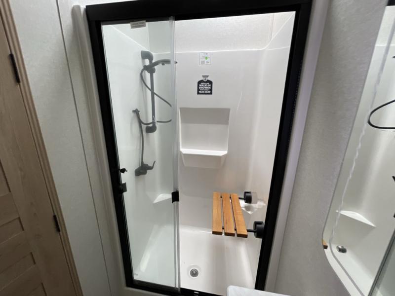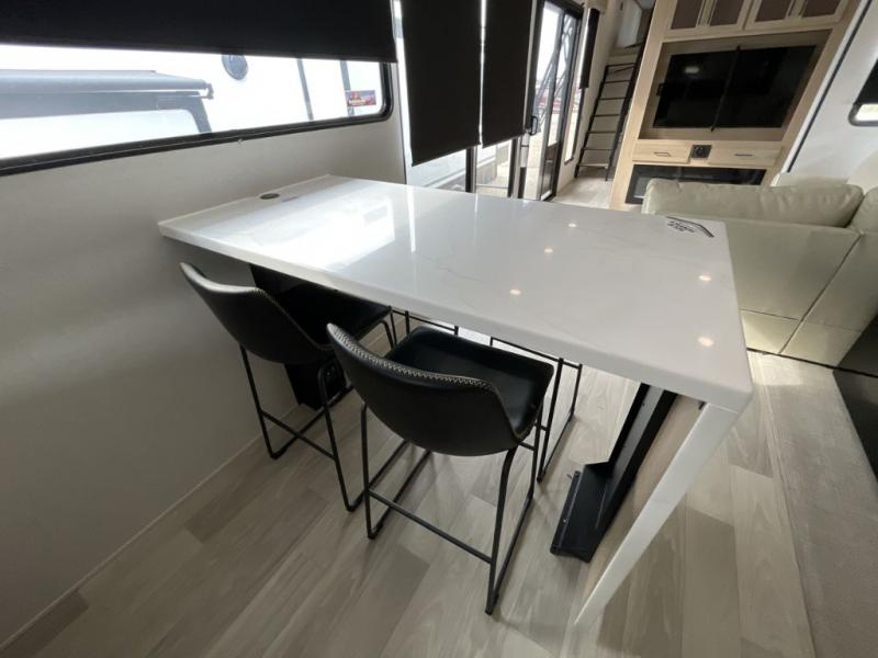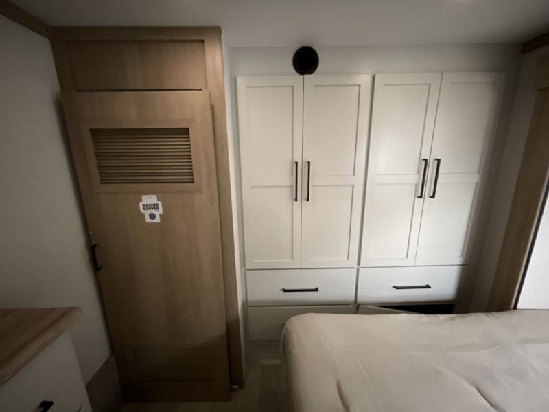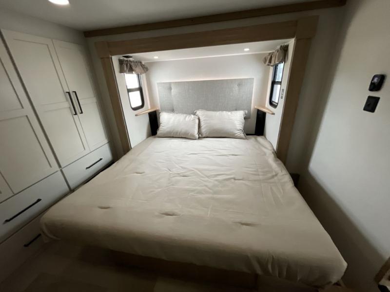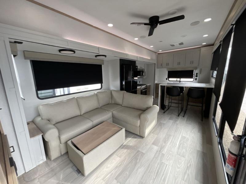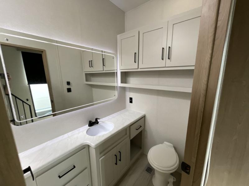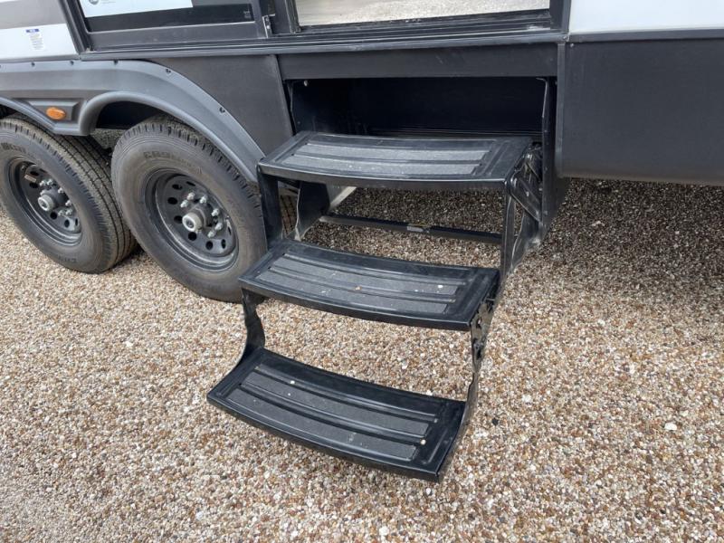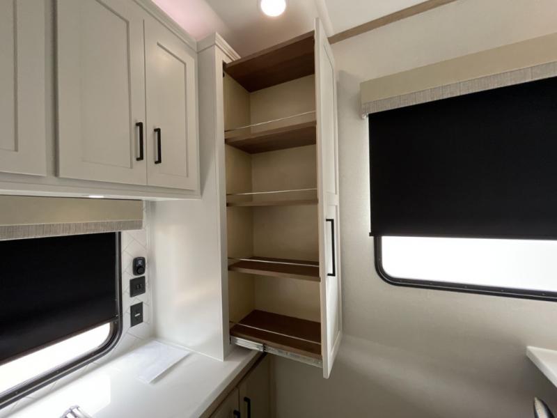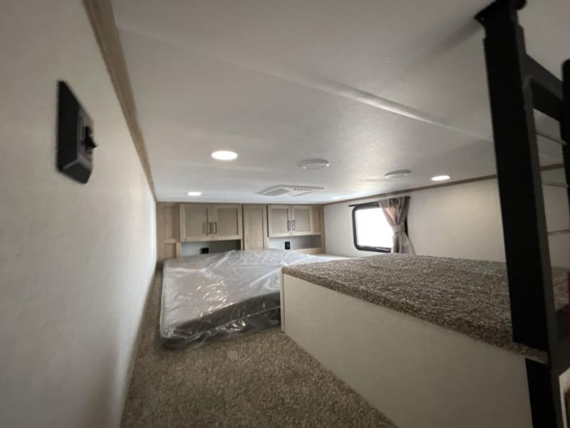 Comfort is found at every turn in this double slide out destination trailer. The chef of your group will love cooking in the front kitchen with ample counter space, a three burner cooktop and 30" over-the-range stainless microwave, plus a 19.6 cu. ft. 12V refrigerator and pantry for food storage. There is a free-standing dinette where you can dine together, and after dinner you can relax on the sectional sofa with an ottoman. There are stairs that lead to the loft area that includes two bunk bats, a wardrobe/cabinet, and two wardrobes/bookcases to keep this space tidy. And you'll enjoy your own space in the rear bedroom with its king bed slide out, large wardrobe and dresser, plus a closet with washer and dryer prep!