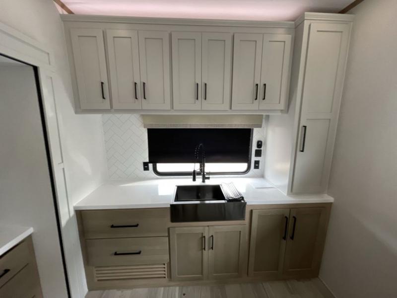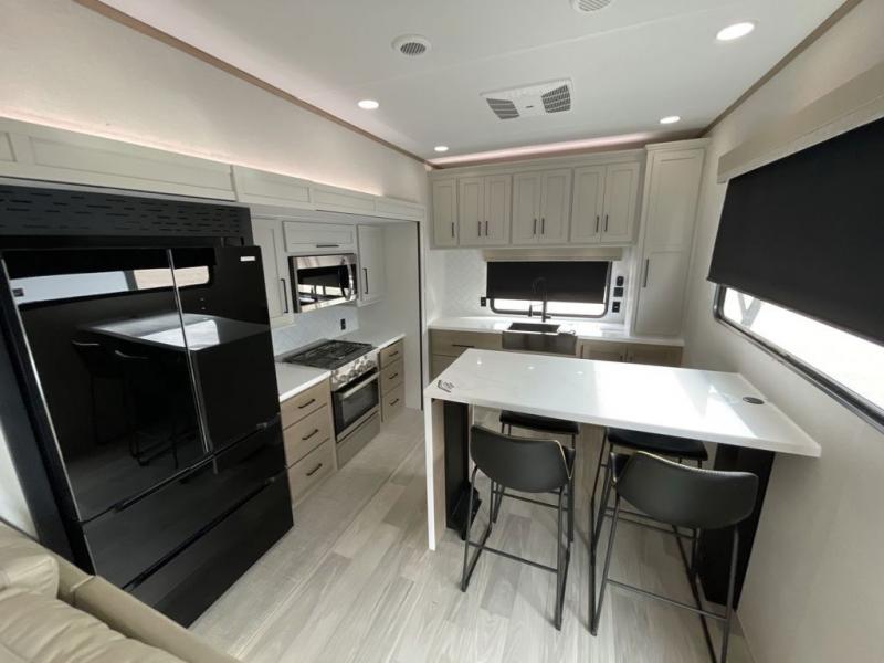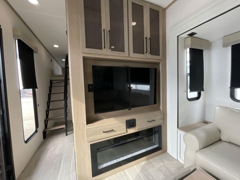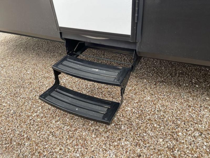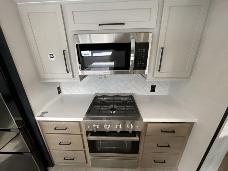 Comfort is found at every turn in this double slide out destination trailer. The chef of your group will love cooking in the front kitchen with ample counter space, a three burner cooktop and 30" over-the-range stainless microwave, plus a 19.6 cu. ft. 12V refrigerator and pantry for food storage. There is a free-standing dinette where you can dine together, and after dinner you can relax on the sectional sofa with an ottoman. There are stairs that lead to the loft area that includes two bunk bats, a wardrobe/cabinet, and two wardrobes/bookcases to keep this space tidy. And you'll enjoy your own space in the rear bedroom with its king bed slide out, large wardrobe and dresser, plus a closet with washer and dryer prep!