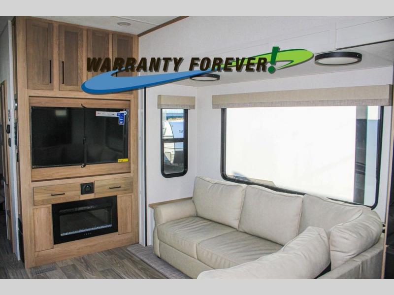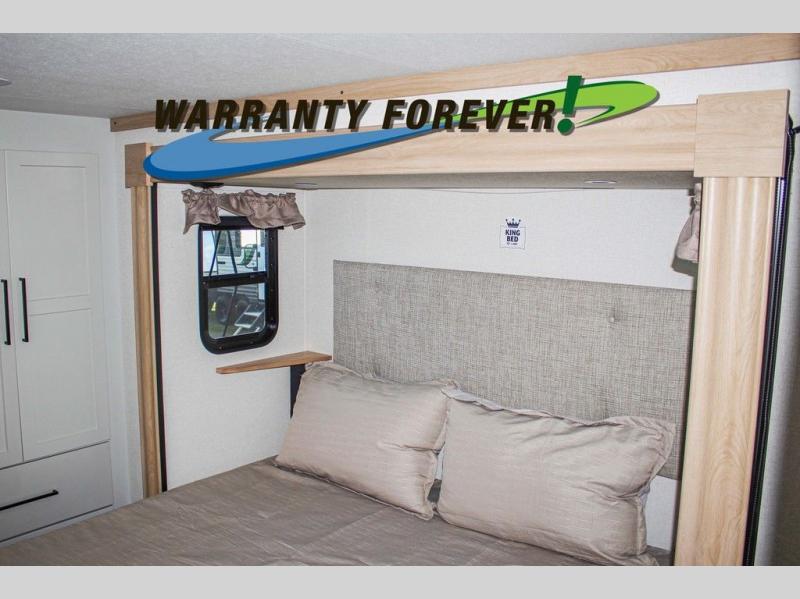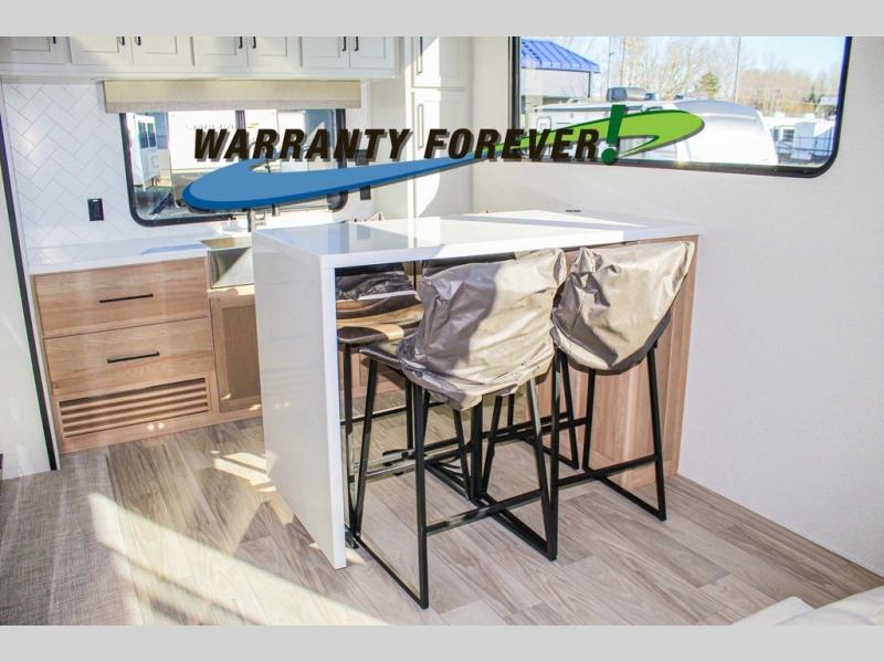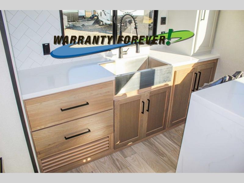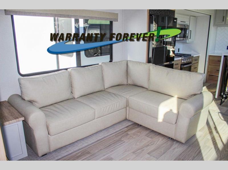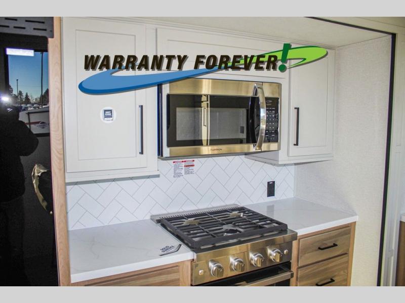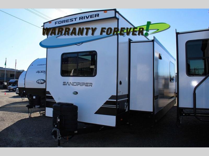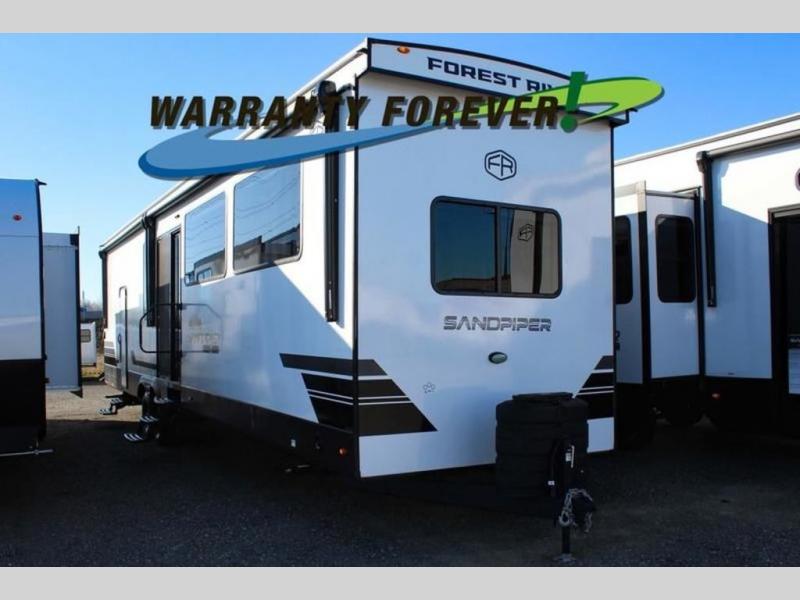 The Sandpiper Destination Trailers by Forest River are ready for extended stays at the location of your choice! The cambered powder coated frame with rust prohibitor will help extend the life of your RV and the Underbelly Armor will protect your trailer and provide better insulation. There are also color matched exterior fiberglass sidewalls outside, along with rain gutters with extra long drip spouts to prevent black streaking, and an exterior porch light just like at home. The Destination Package includes features to make your trips hassle-free, like the two 15,000 BTU A/C units, and on-demand water heater, and Chef Collection three burner 24" range. A commercial style kitchen faucet and designer backsplash is included with the Extended Stay Package, as well as solid surface countertops, and a stainless steel apron sink with a strainer to name a few comforts. Available options include a central vacuum system, stabilizer jacks, plus dual pane windows and more!