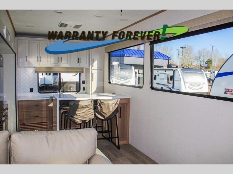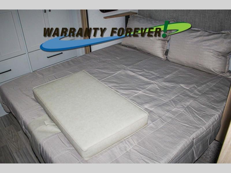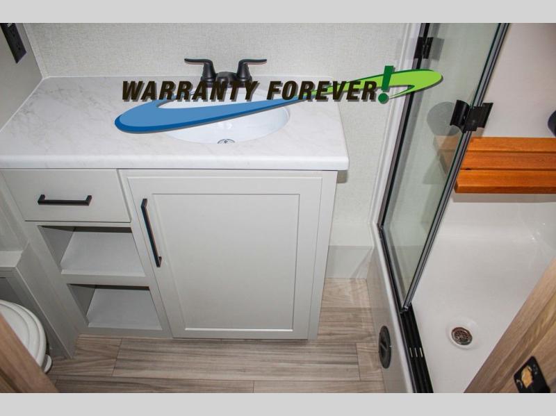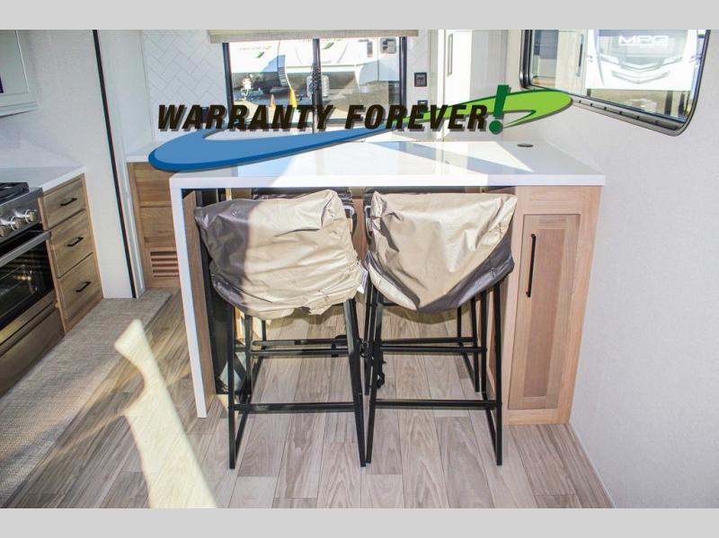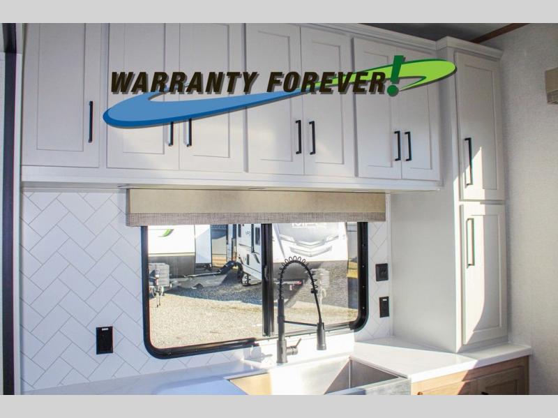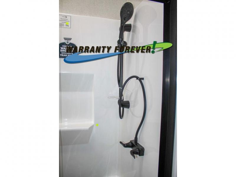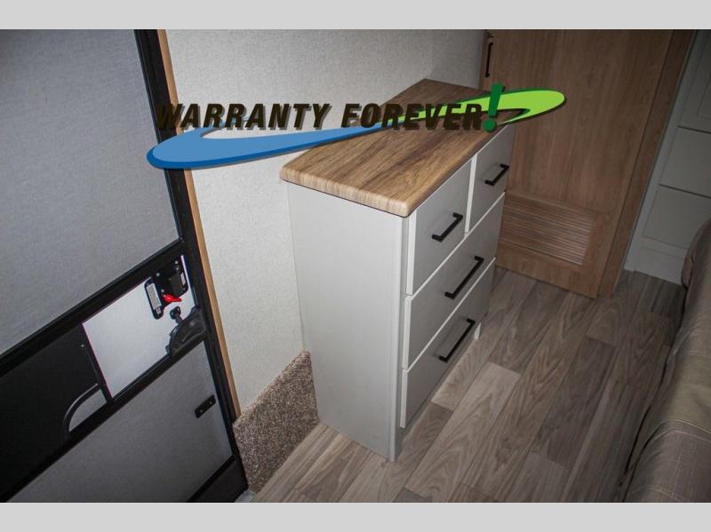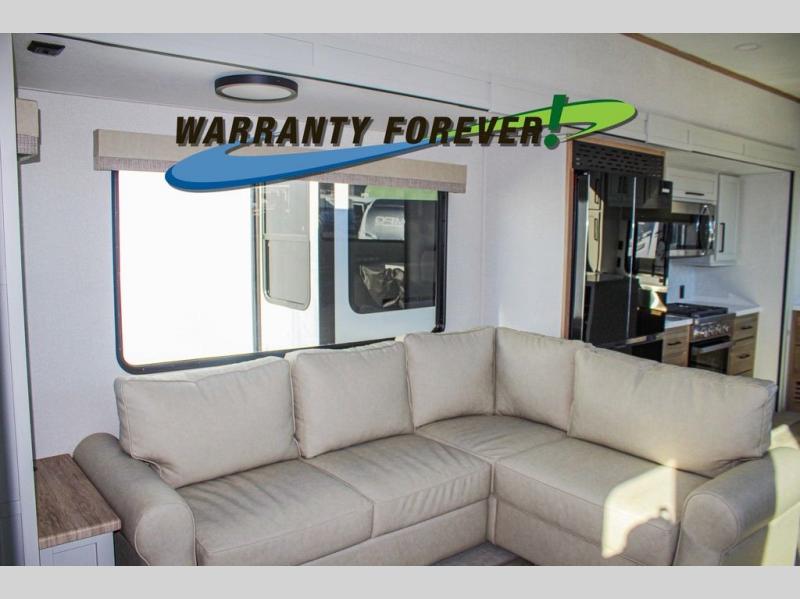 The Sandpiper Destination Trailers by Forest River are ready for extended stays at the location of your choice! The cambered powder coated frame with rust prohibitor will help extend the life of your RV and the Underbelly Armor will protect your trailer and provide better insulation. There are also color matched exterior fiberglass sidewalls outside, along with rain gutters with extra long drip spouts to prevent black streaking, and an exterior porch light just like at home. The Destination Package includes features to make your trips hassle-free, like the two 15,000 BTU A/C units, and on-demand water heater, and Chef Collection three burner 24" range. A commercial style kitchen faucet and designer backsplash is included with the Extended Stay Package, as well as solid surface countertops, and a stainless steel apron sink with a strainer to name a few comforts. Available options include a central vacuum system, stabilizer jacks, plus dual pane windows and more!