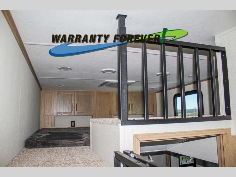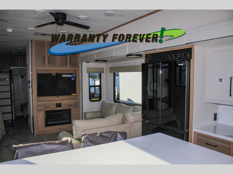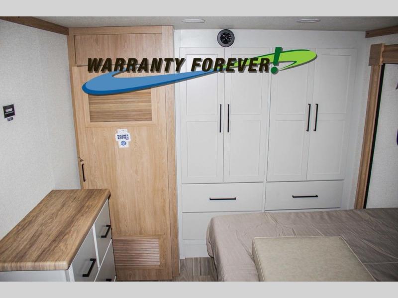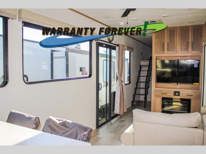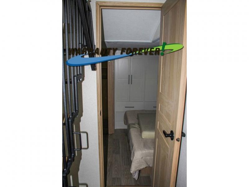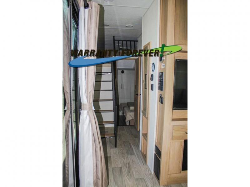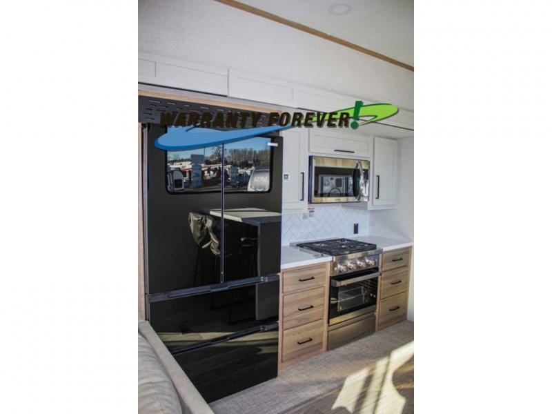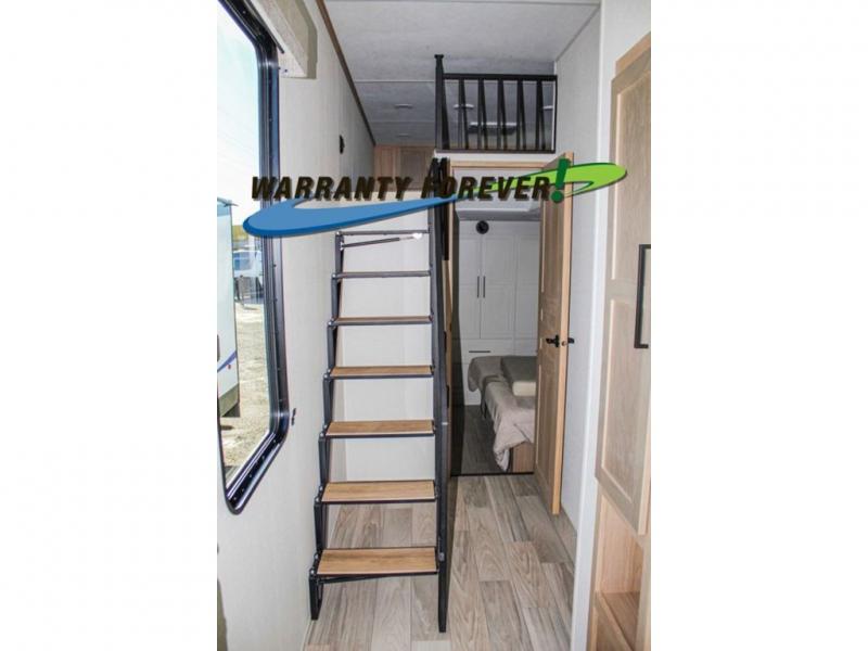 Comfort is found at every turn in this double slide out destination trailer. The chef of your group will love cooking in the front kitchen with ample counter space, a three burner cooktop and 30" over-the-range stainless microwave, plus a 19.6 cu. ft. 12V refrigerator and pantry for food storage. There is a free-standing table with a waterfall edge where you can dine together, and after dinner you can relax on the sectional sofa with an ottoman. There is a collapsible staircase that lead to the loft area that includes two bunk bats, a wardrobe/cabinet, and two wardrobes/bookcases to keep this space tidy. And you'll enjoy your own space in the rear bedroom with its king bed slide out, large wardrobe and dresser, plus a closet with washer and dryer prep!
