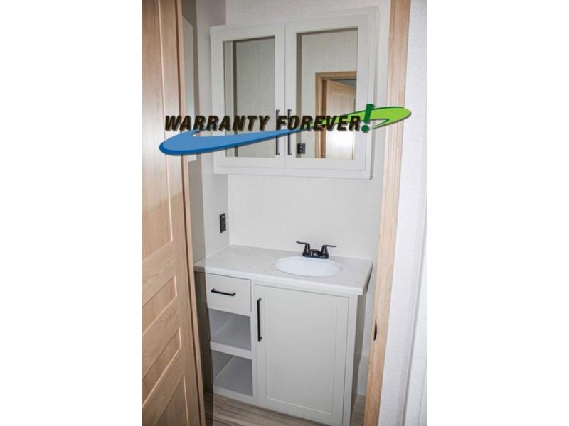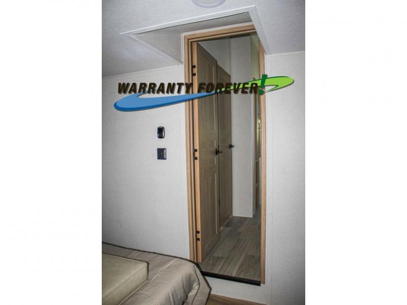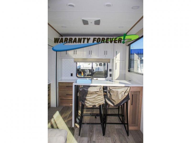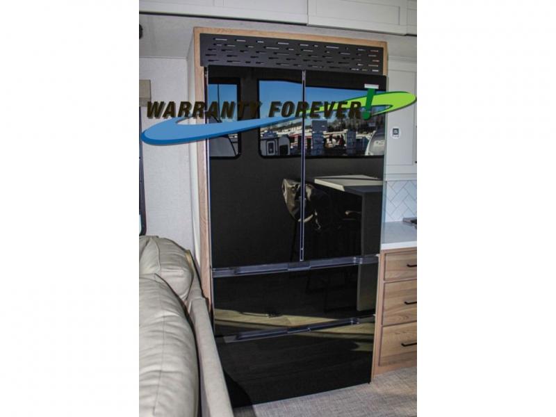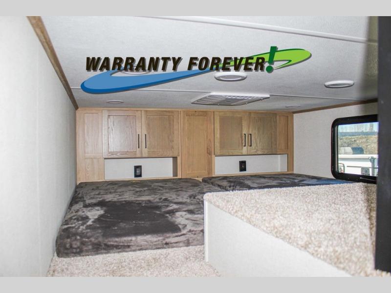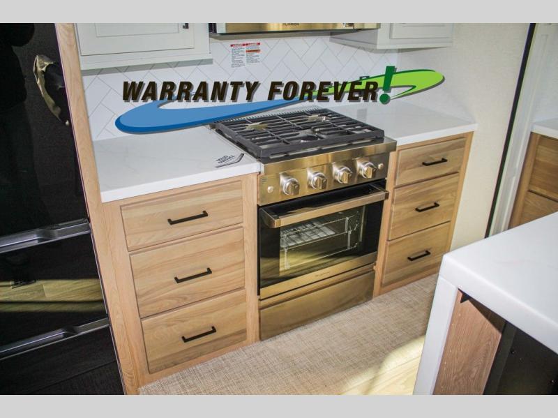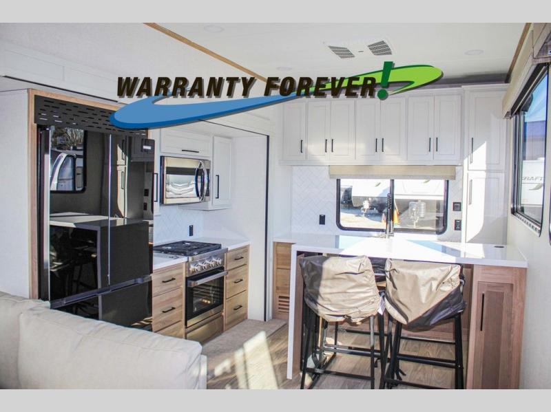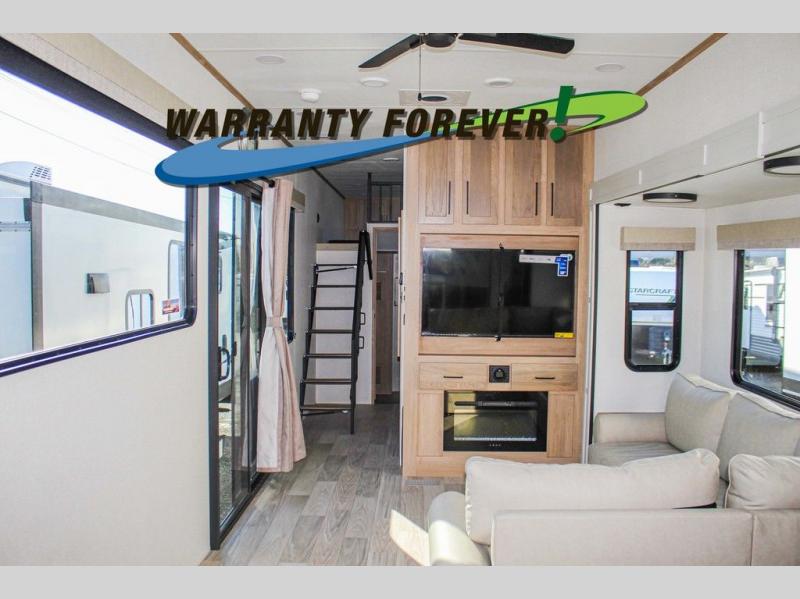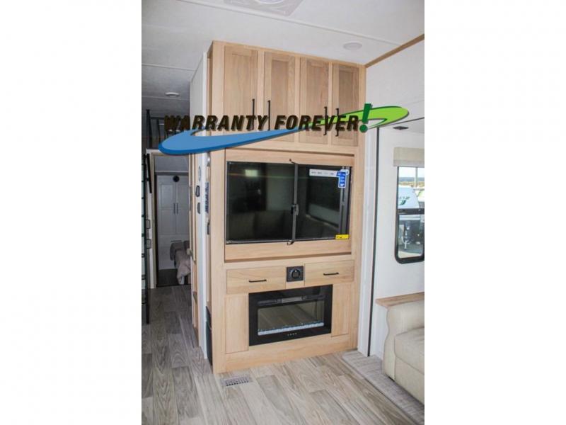Comfort is found at every turn in this double slide out destination trailer. The chef of your group will love cooking in the front kitchen with ample counter space, a three burner cooktop and 30" over-the-range stainless microwave, plus a 19.6 cu. ft. 12V refrigerator and pantry for food storage. There is a free-standing table with a waterfall edge where you can dine together, and after dinner you can relax on the sectional sofa with an ottoman. There is a collapsible staircase that lead to the loft area that includes two bunk bats, a wardrobe/cabinet, and two wardrobes/bookcases to keep this space tidy. And you'll enjoy your own space in the rear bedroom with its king bed slide out, large wardrobe and dresser, plus a closet with washer and dryer prep!