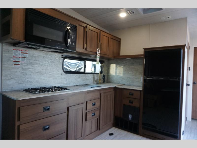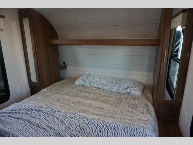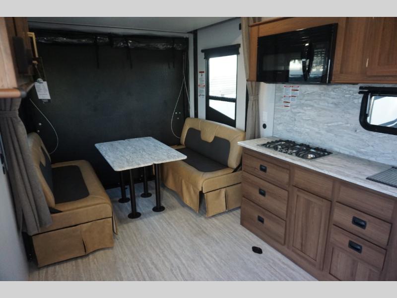 You'll enjoy 13' of total garage space in this toy hauler plus a ramp door for easy loading and unloading. There is a an electric pass-thru dinette where you can enjoy your meals together and a drop-down electric bed for guests to sleep on. The full kitchen and bath amenities will come in handy while you're at the campground, and the front private bedroom will feel just like home. Here, you'll find a king bed, dual wardrobes and a shelf for knickknacks!