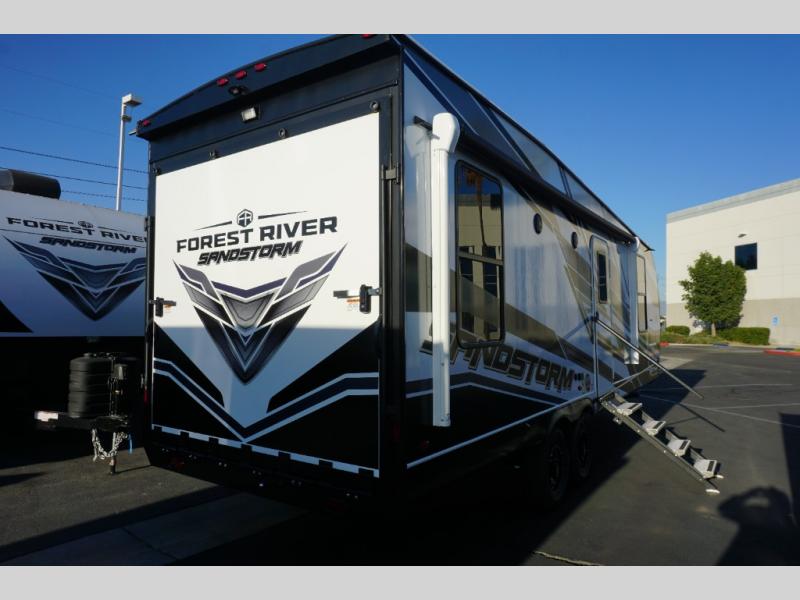 The Sandstorm toy haulers by Forest River let you take your adventures up a notch! There are four different build levels to choose from to best fit your needs, budget, and style. Each travel trailer and fifth wheel include flipped axles with no interior drive on wheel wells, Flip tread solid entry steps, and tie-downs mounted to steel throughout to keep toys secure on the way to the campground. The power tongue jack will make it easier than ever to hitch up and go, and the Lippert ladder prep means you can add this option to easily access the roof. A 40 gallon fuel station comes standard to keep your toys ready to go when you are, and the dual 20 lbs. propane tanks will let you hook up the grill to make dinner for your whole crew. Some of the other convenient features include a spare tire (with carrier on tongue pull) if an unfortunate flat happens, a 335W solar panel, and a 1.5 cu. ft. convection microwave. And don't forget about the available options that will allow you to customize your toy hauler exactly how you want it!