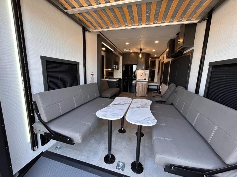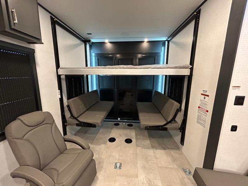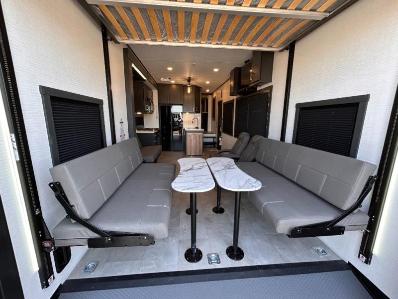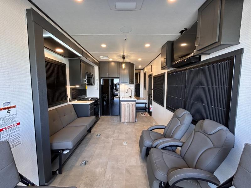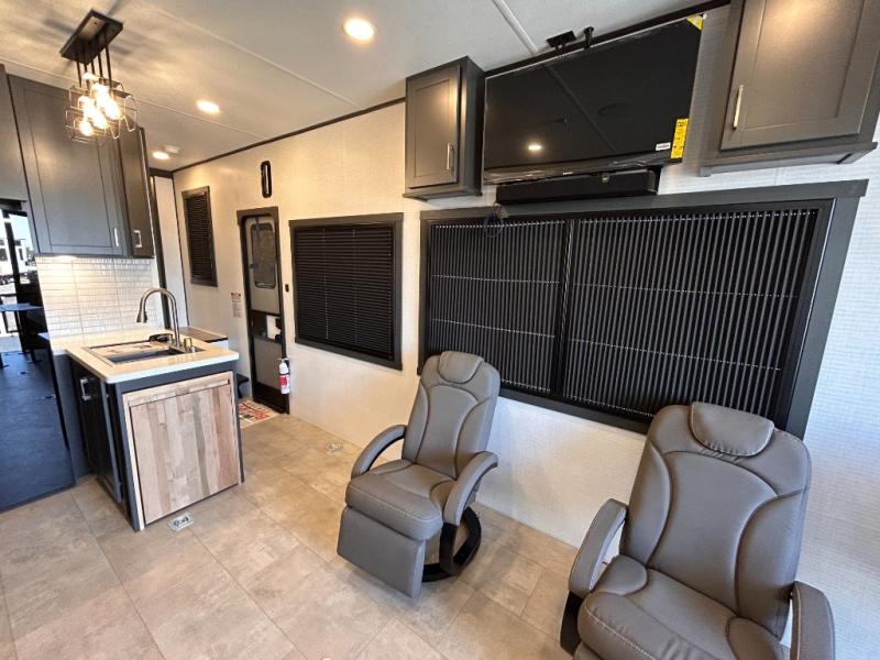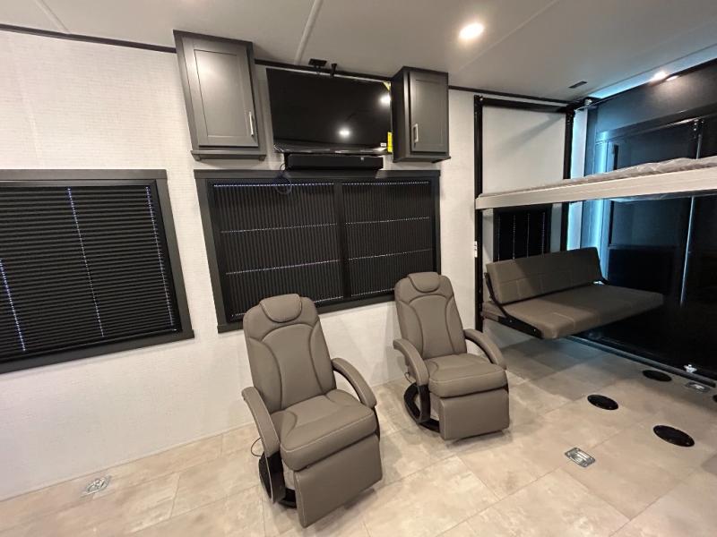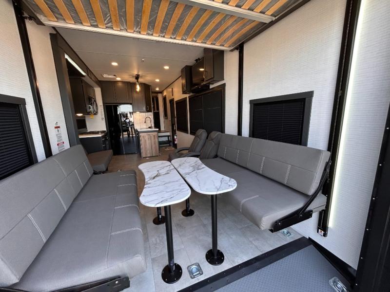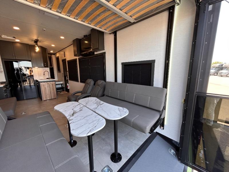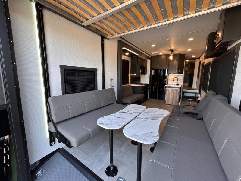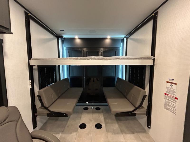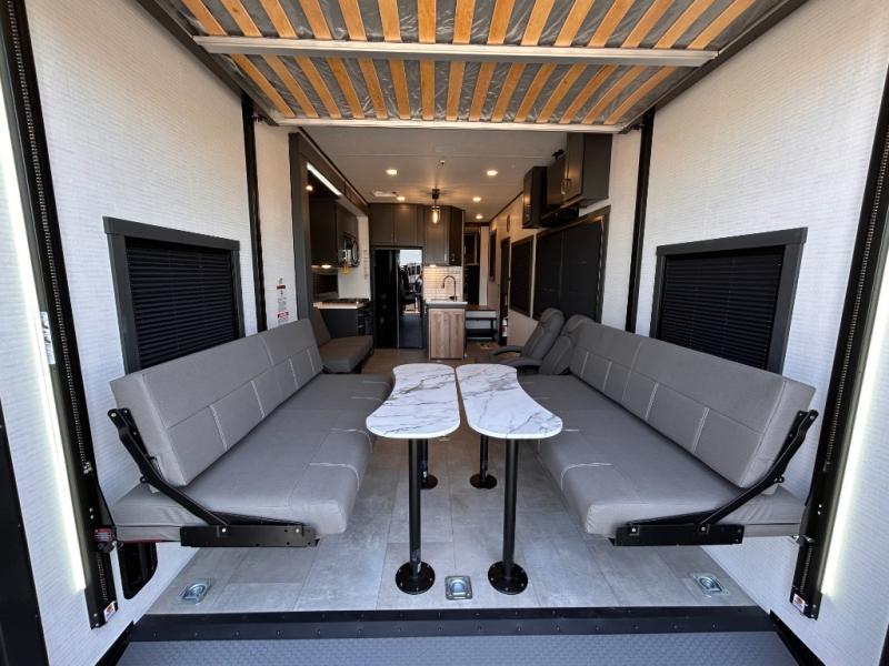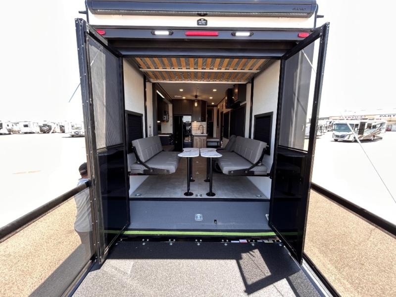 This toy hauler will bring the greatest sleeping experience on your road trip thanks to its private front bedroom, featuring a king bed with flip-up floor storage below, perfect for stashing your favorite gear. The room also includes a spacious wardrobe, washer and dryer prep for added convenience, shelves, dresser, and seat, providing ample storage and comfort. The full bathroom is spacious, complete with a generous 30 x 48 shower and linen closet for all your towels and bath clothes. You'll feel right at home with the luxurious amenities and comfortable living spaces. The kitchen is equipped with a microwave, waterfall sink, flip-up countertop for added space when cooking, a 16 cu fridge, pantry, and overhead cabinets. The living room is the perfect place to relax, featuring a flip-up sofa, two garage chairs, a TV, and an overhead cabinet. You'll have everything you need to unwind after a long day of adventure. In the garage, you'll find sit-n-sleep rollovers, a removable dinette table, and a sleep-and-store above. Also, perform various activities outside without worrying about the weather thanks to the massive 20’ awning and enjoy the fresh air. With its luxurious amenities, spacious living areas, and versatile garage space, our toy hauler is the perfect vehicle for anyone who loves adventure.