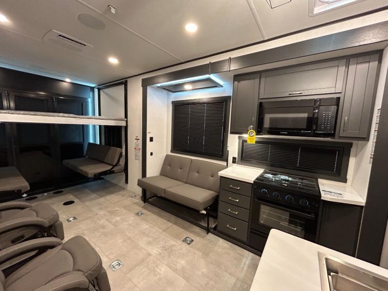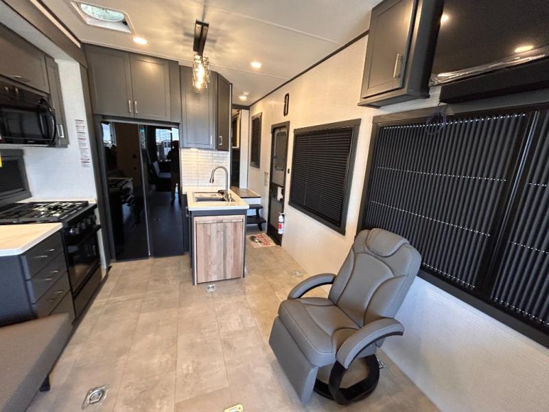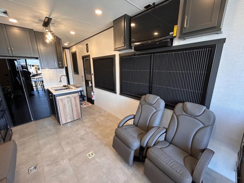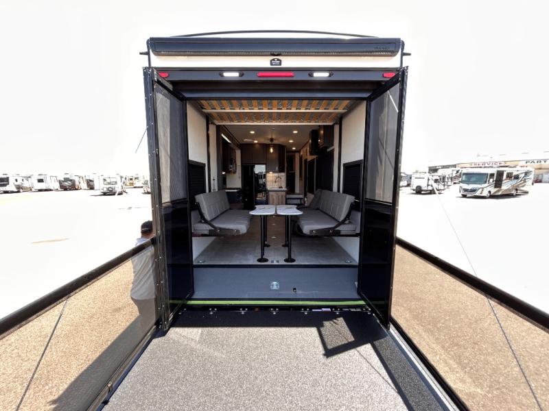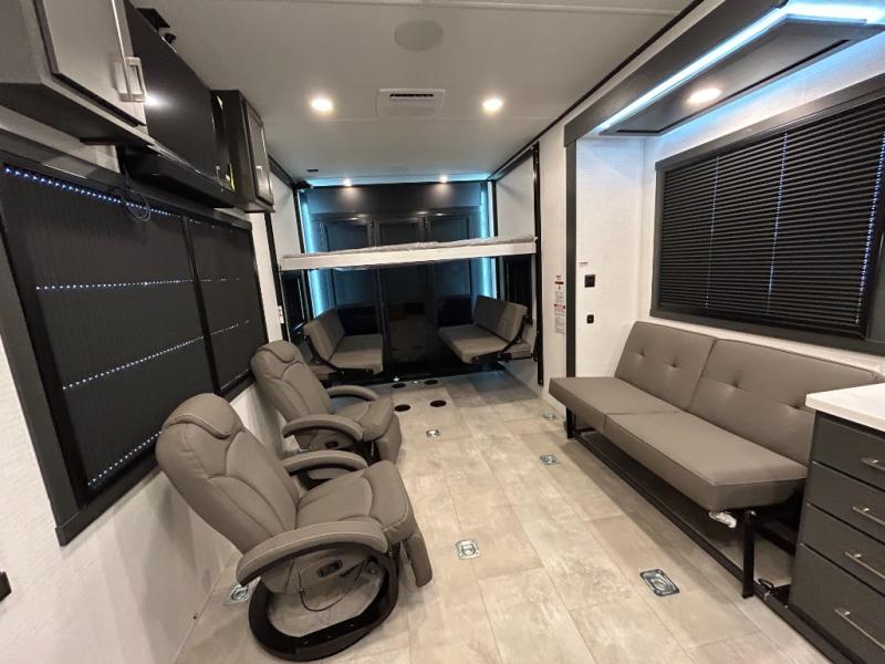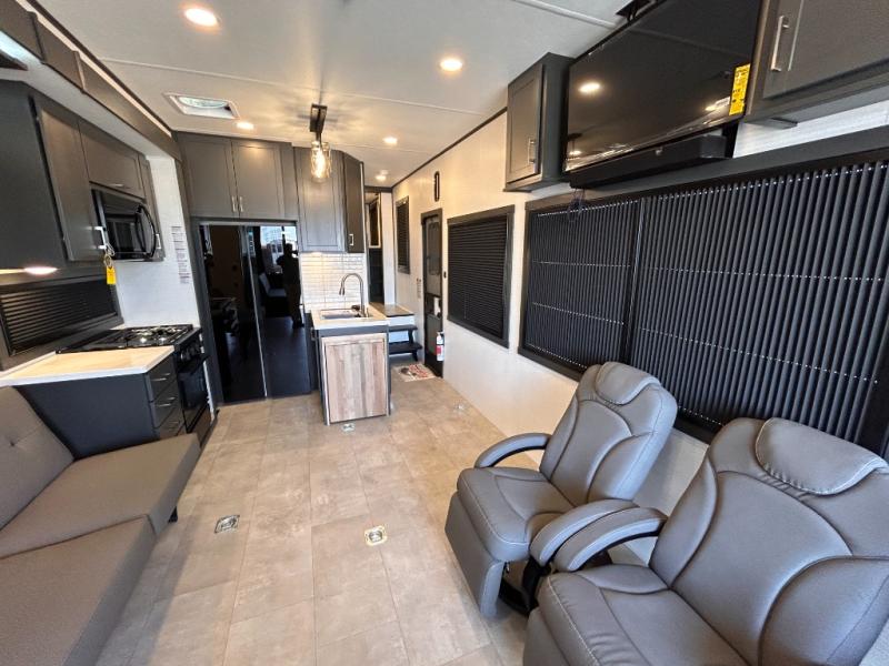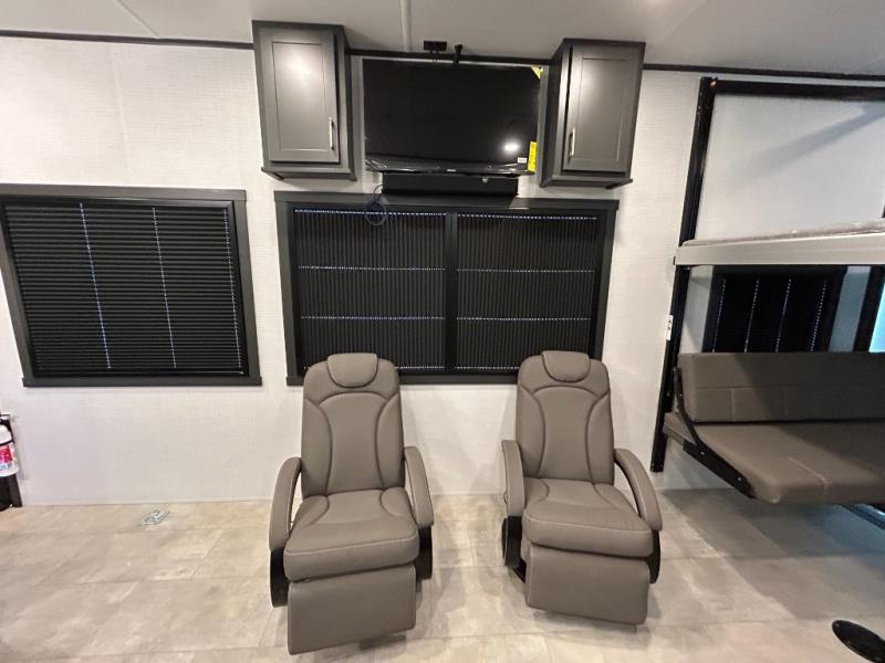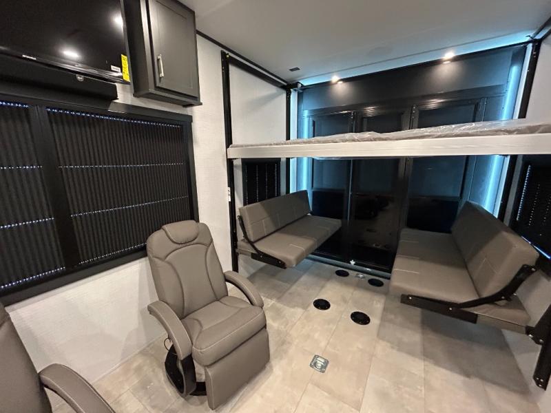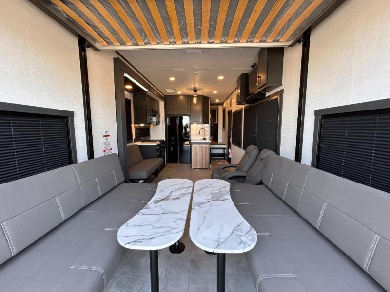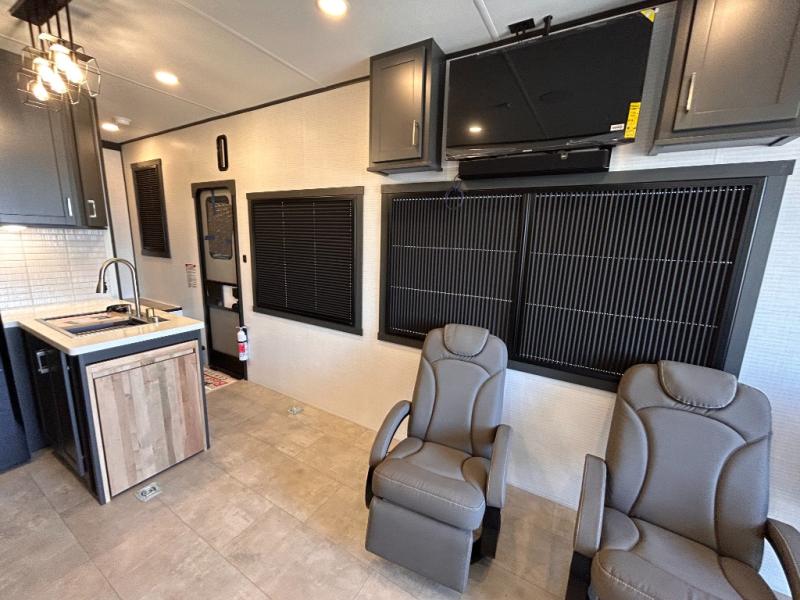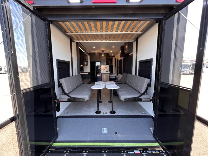 This toy hauler will bring the greatest sleeping experience on your road trip thanks to its private front bedroom, featuring a king bed with flip-up floor storage below, perfect for stashing your favorite gear. The room also includes a spacious wardrobe, washer and dryer prep for added convenience, shelves, dresser, and seat, providing ample storage and comfort. The full bathroom is spacious, complete with a generous 30 x 48 shower and linen closet for all your towels and bath clothes. You'll feel right at home with the luxurious amenities and comfortable living spaces. The kitchen is equipped with a microwave, waterfall sink, flip-up countertop for added space when cooking, a 16 cu fridge, pantry, and overhead cabinets. The living room is the perfect place to relax, featuring a flip-up sofa, two garage chairs, a TV, and an overhead cabinet. You'll have everything you need to unwind after a long day of adventure. In the garage, you'll find sit-n-sleep rollovers, a removable dinette table, and a sleep-and-store above. Also, perform various activities outside without worrying about the weather thanks to the massive 20’ awning and enjoy the fresh air. With its luxurious amenities, spacious living areas, and versatile garage space, our toy hauler is the perfect vehicle for anyone who loves adventure.