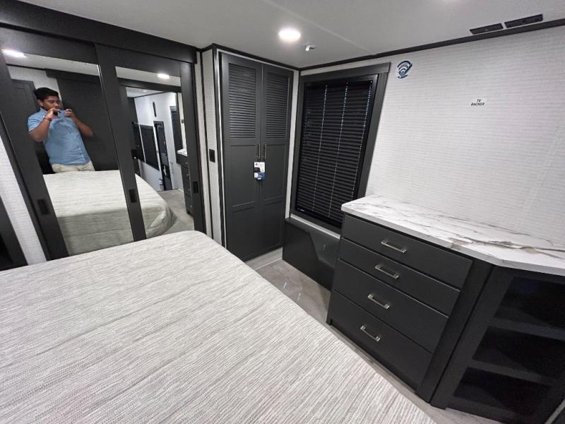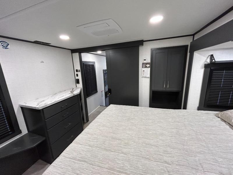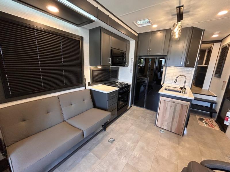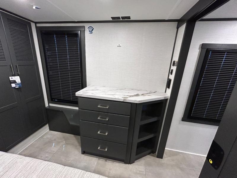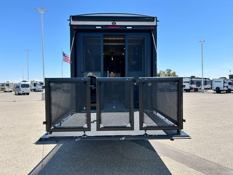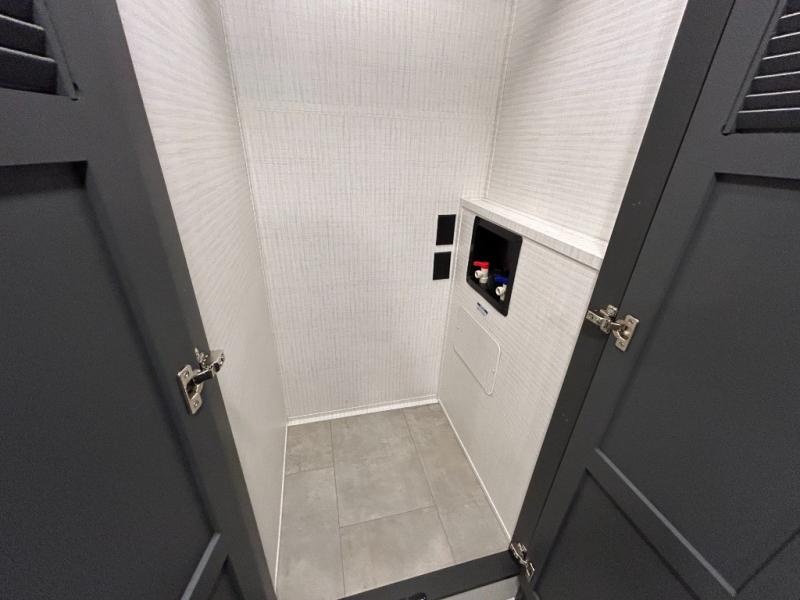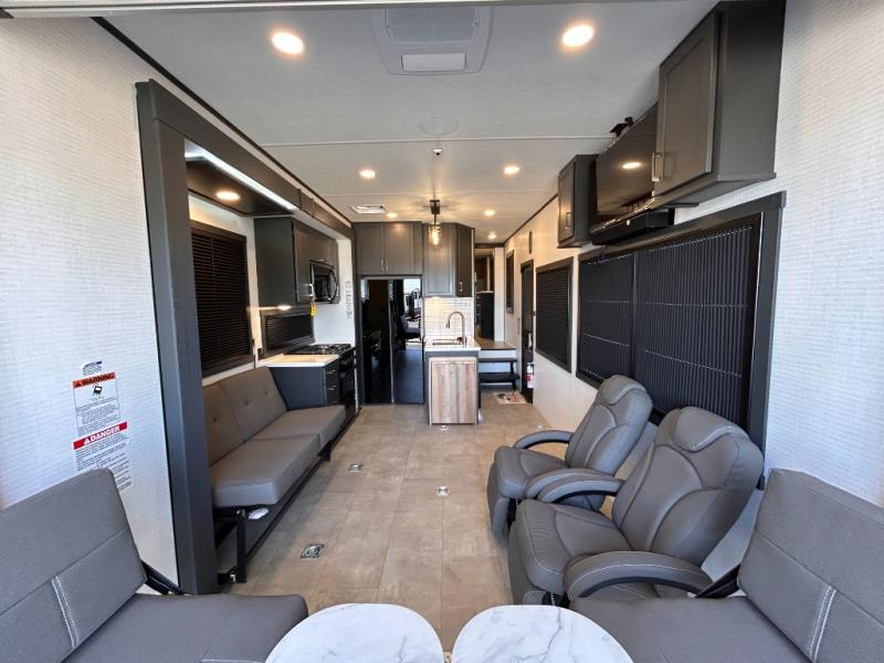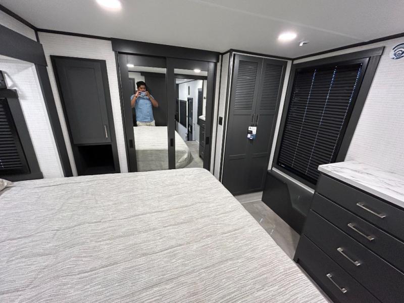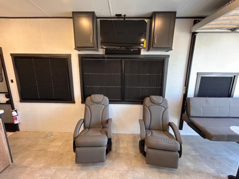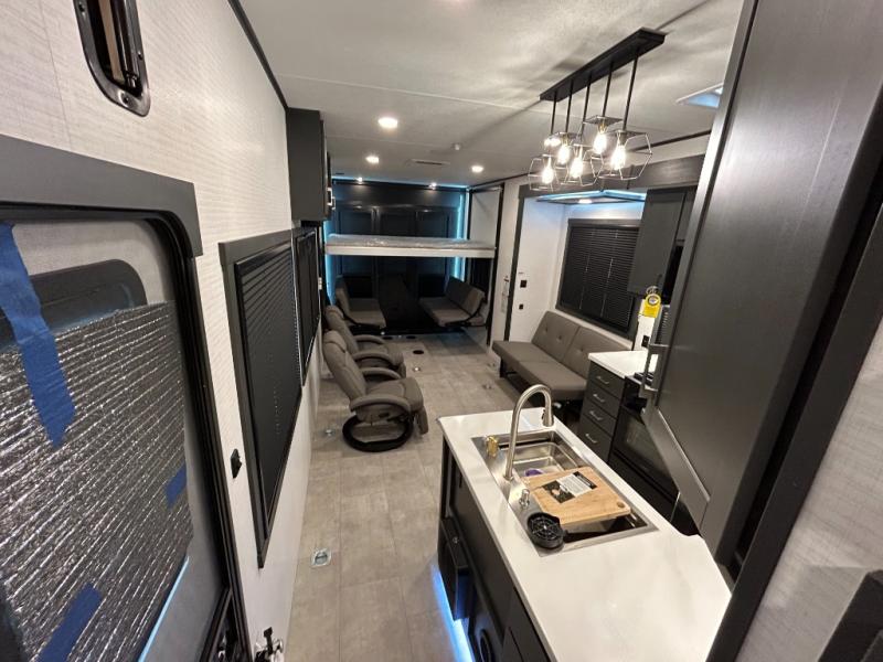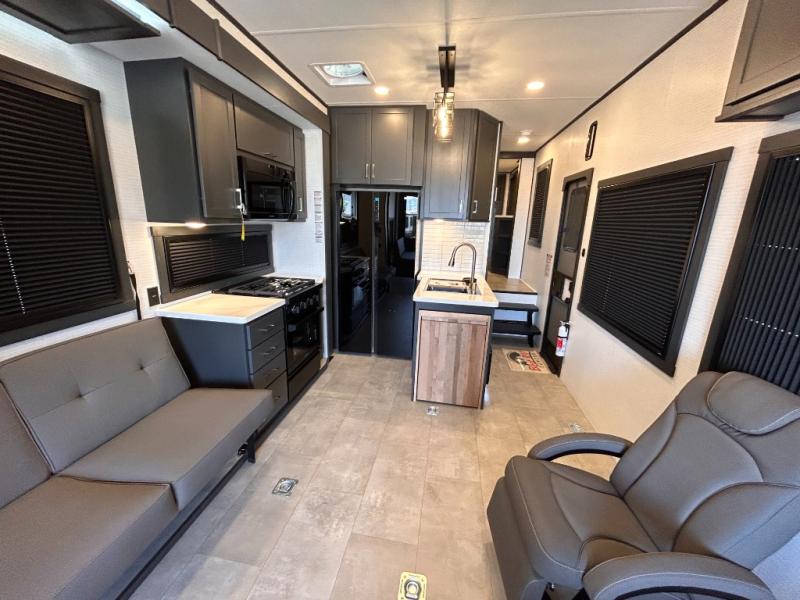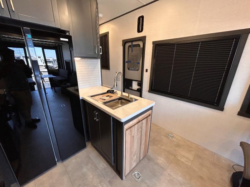 This toy hauler will bring the greatest sleeping experience on your road trip thanks to its private front bedroom, featuring a king bed with flip-up floor storage below, perfect for stashing your favorite gear. The room also includes a spacious wardrobe, washer and dryer prep for added convenience, shelves, dresser, and seat, providing ample storage and comfort. The full bathroom is spacious, complete with a generous 30 x 48 shower and linen closet for all your towels and bath clothes. You'll feel right at home with the luxurious amenities and comfortable living spaces. The kitchen is equipped with a microwave, waterfall sink, flip-up countertop for added space when cooking, a 16 cu fridge, pantry, and overhead cabinets. The living room is the perfect place to relax, featuring a flip-up sofa, two garage chairs, a TV, and an overhead cabinet. You'll have everything you need to unwind after a long day of adventure. In the garage, you'll find sit-n-sleep rollovers, a removable dinette table, and a sleep-and-store above. Also, perform various activities outside without worrying about the weather thanks to the massive 20’ awning and enjoy the fresh air. With its luxurious amenities, spacious living areas, and versatile garage space, our toy hauler is the perfect vehicle for anyone who loves adventure.