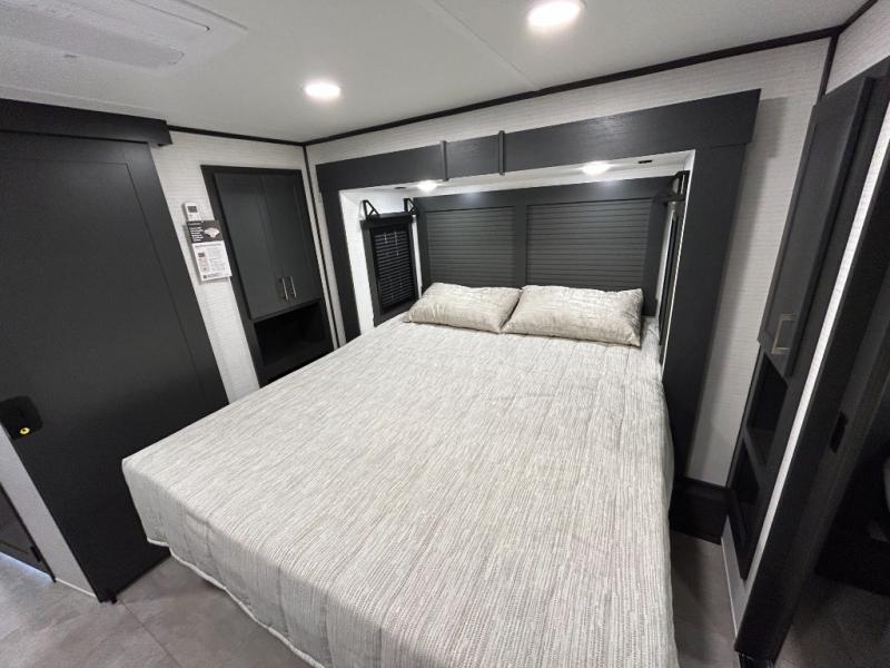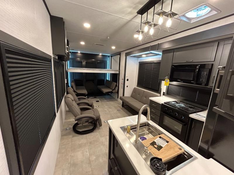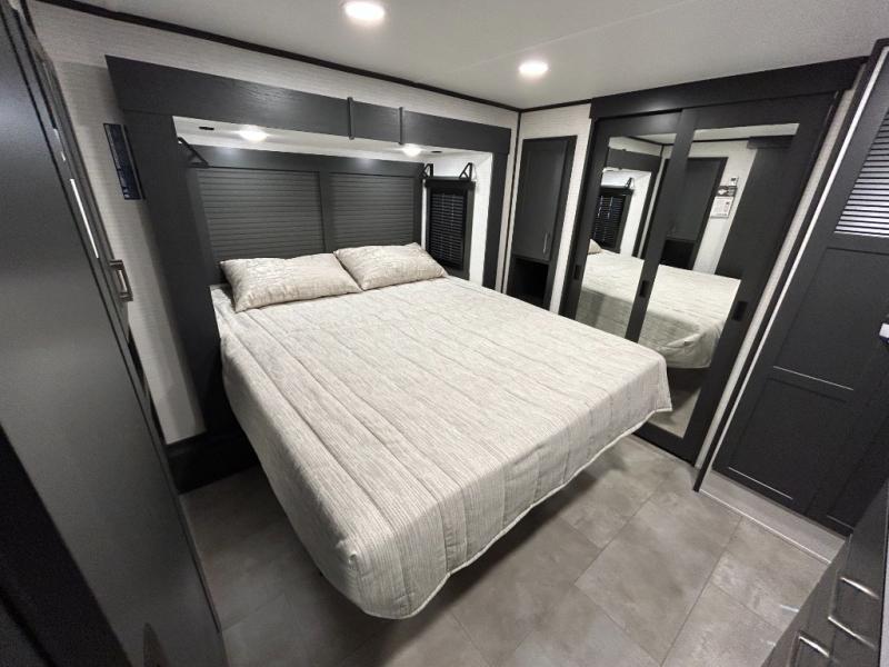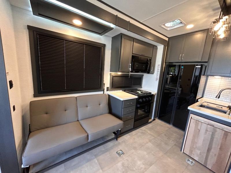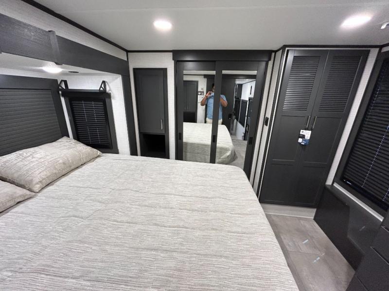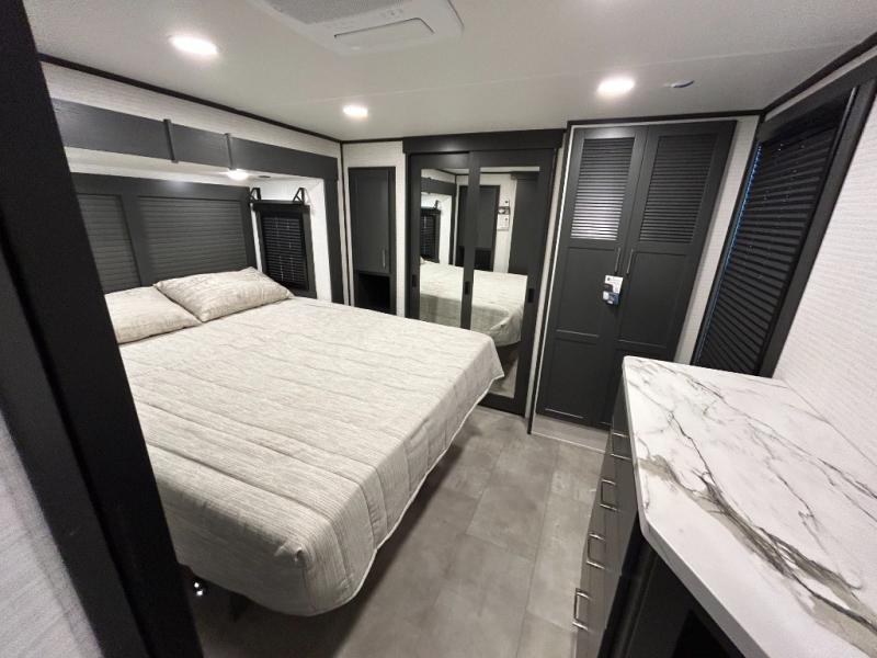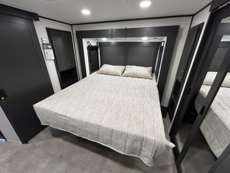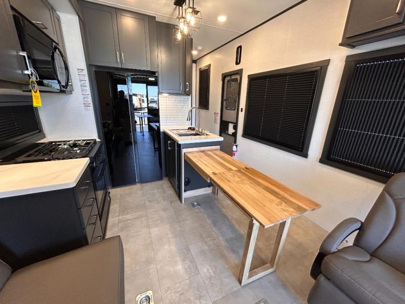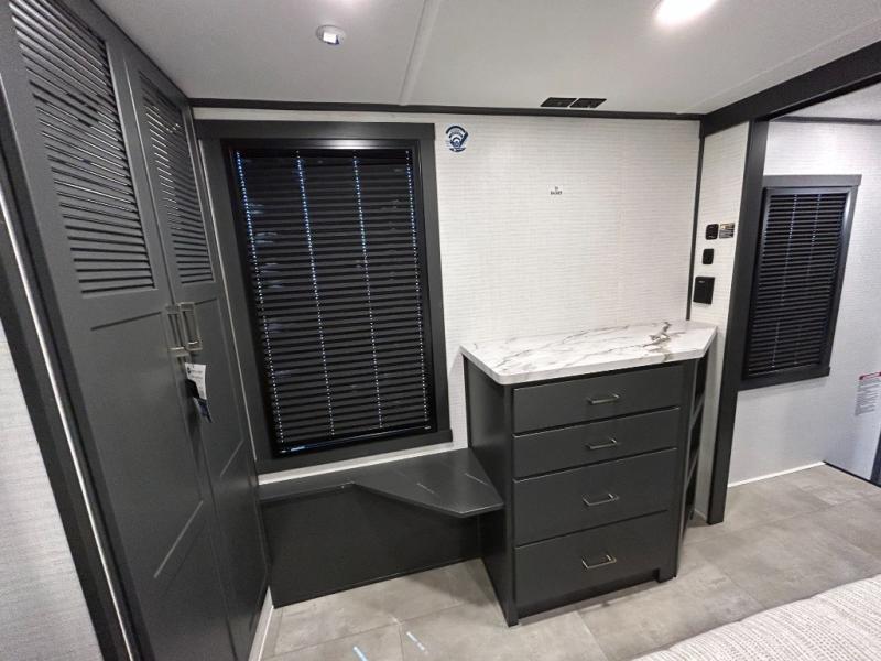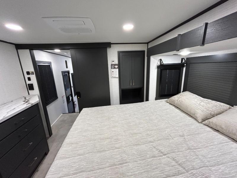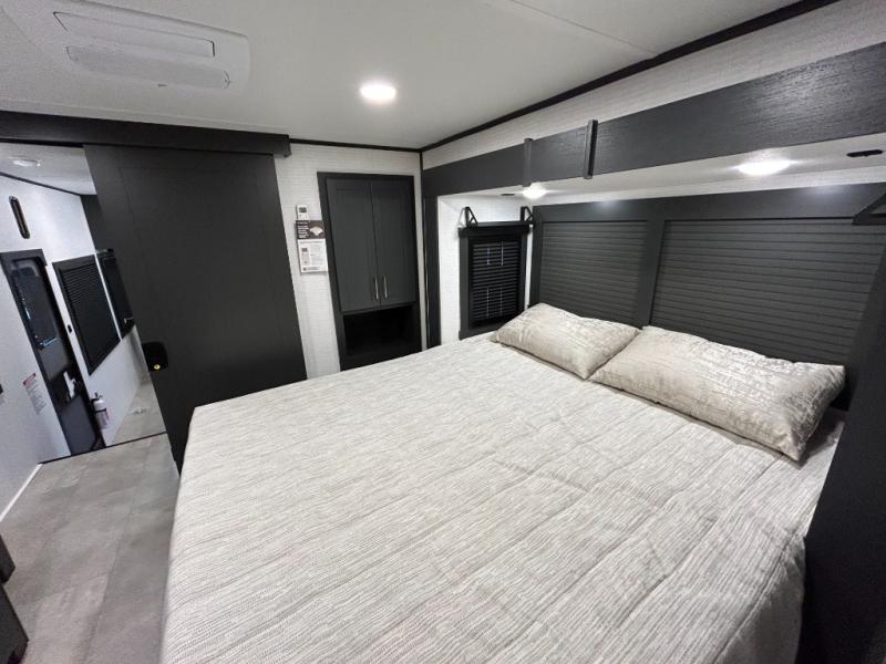This toy hauler will bring the greatest sleeping experience on your road trip thanks to its private front bedroom, featuring a king bed with flip-up floor storage below, perfect for stashing your favorite gear. The room also includes a spacious wardrobe, washer and dryer prep for added convenience, shelves, dresser, and seat, providing ample storage and comfort. The full bathroom is spacious, complete with a generous 30 x 48 shower and linen closet for all your towels and bath clothes. You'll feel right at home with the luxurious amenities and comfortable living spaces. The kitchen is equipped with a microwave, waterfall sink, flip-up countertop for added space when cooking, a 16 cu fridge, pantry, and overhead cabinets. The living room is the perfect place to relax, featuring a flip-up sofa, two garage chairs, a TV, and an overhead cabinet. You'll have everything you need to unwind after a long day of adventure. In the garage, you'll find sit-n-sleep rollovers, a removable dinette table, and a sleep-and-store above. Also, perform various activities outside without worrying about the weather thanks to the massive 20’ awning and enjoy the fresh air. With its luxurious amenities, spacious living areas, and versatile garage space, our toy hauler is the perfect vehicle for anyone who loves adventure.