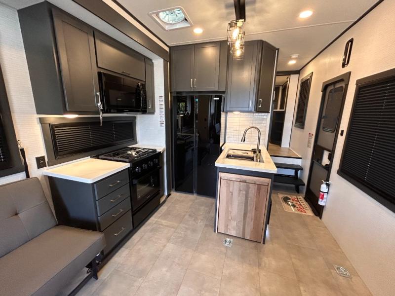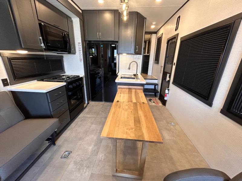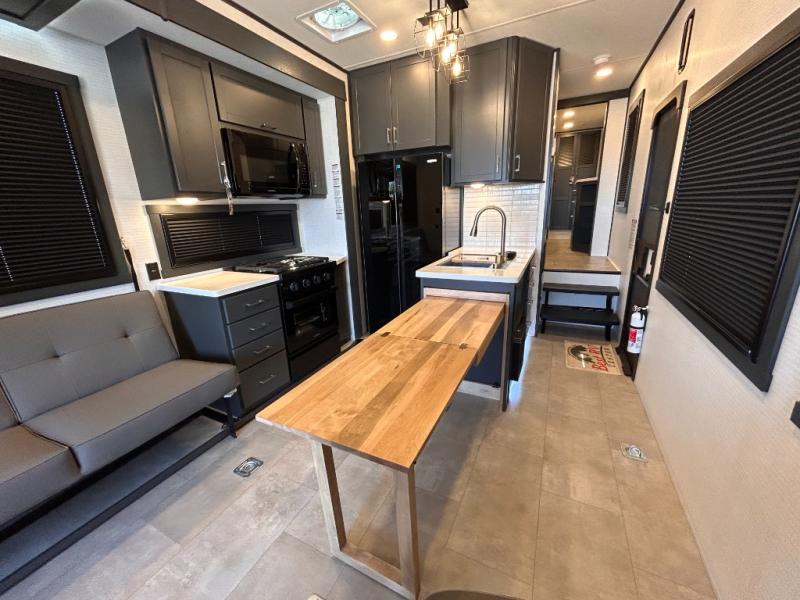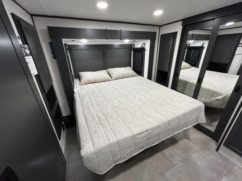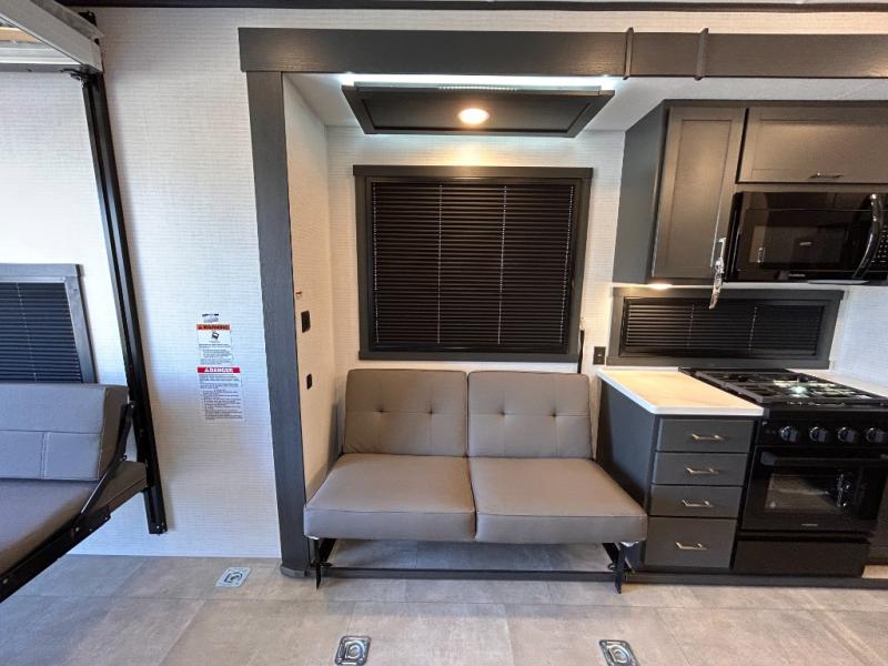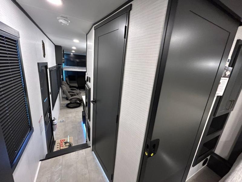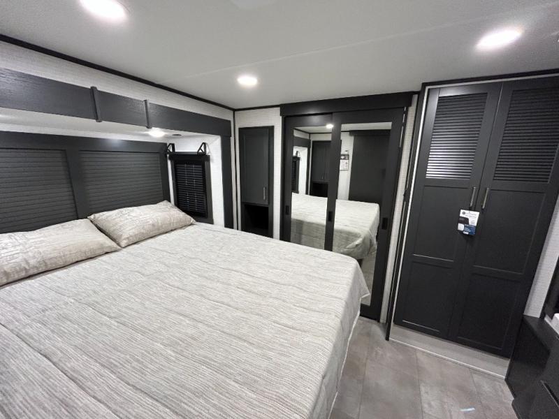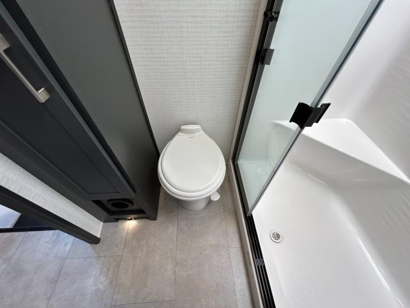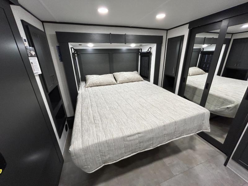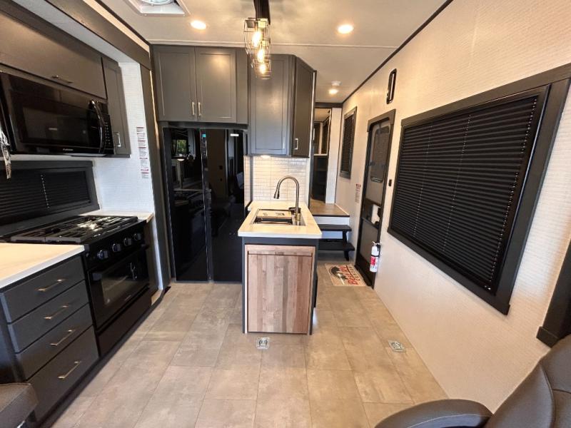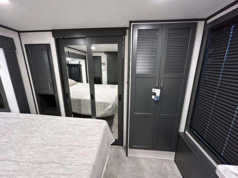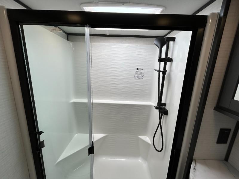 This toy hauler will bring the greatest sleeping experience on your road trip thanks to its private front bedroom, featuring a king bed with flip-up floor storage below, perfect for stashing your favorite gear. The room also includes a spacious wardrobe, washer and dryer prep for added convenience, shelves, dresser, and seat, providing ample storage and comfort. The full bathroom is spacious, complete with a generous 30 x 48 shower and linen closet for all your towels and bath clothes. You'll feel right at home with the luxurious amenities and comfortable living spaces. The kitchen is equipped with a microwave, waterfall sink, flip-up countertop for added space when cooking, a 16 cu fridge, pantry, and overhead cabinets. The living room is the perfect place to relax, featuring a flip-up sofa, two garage chairs, a TV, and an overhead cabinet. You'll have everything you need to unwind after a long day of adventure. In the garage, you'll find sit-n-sleep rollovers, a removable dinette table, and a sleep-and-store above. Also, perform various activities outside without worrying about the weather thanks to the massive 20’ awning and enjoy the fresh air. With its luxurious amenities, spacious living areas, and versatile garage space, our toy hauler is the perfect vehicle for anyone who loves adventure.