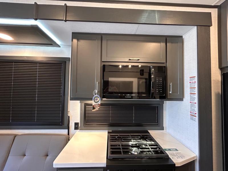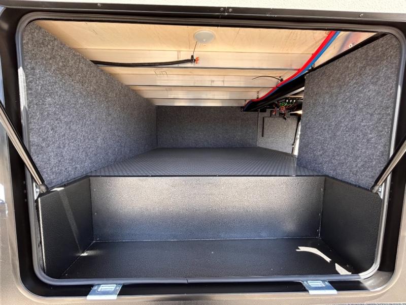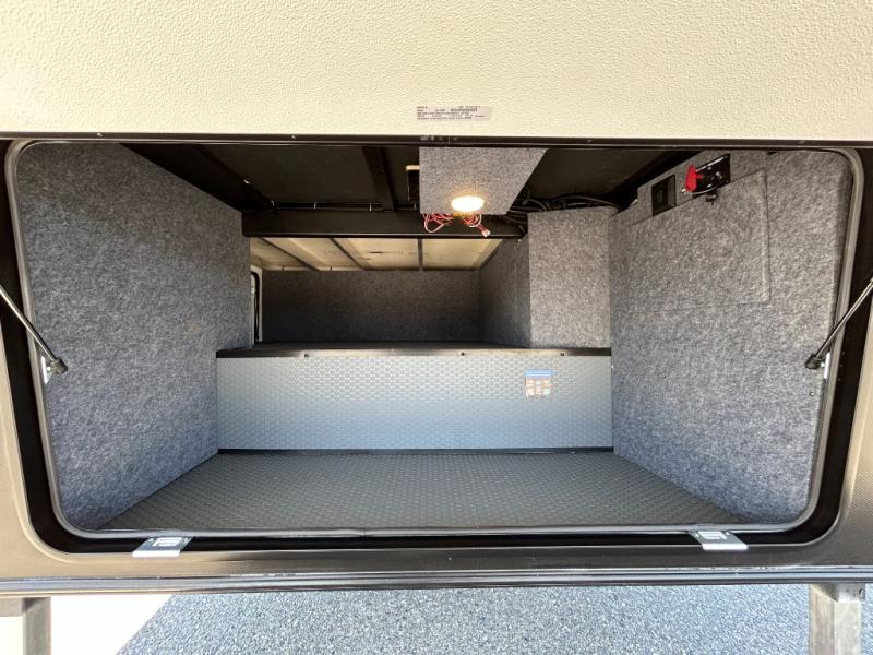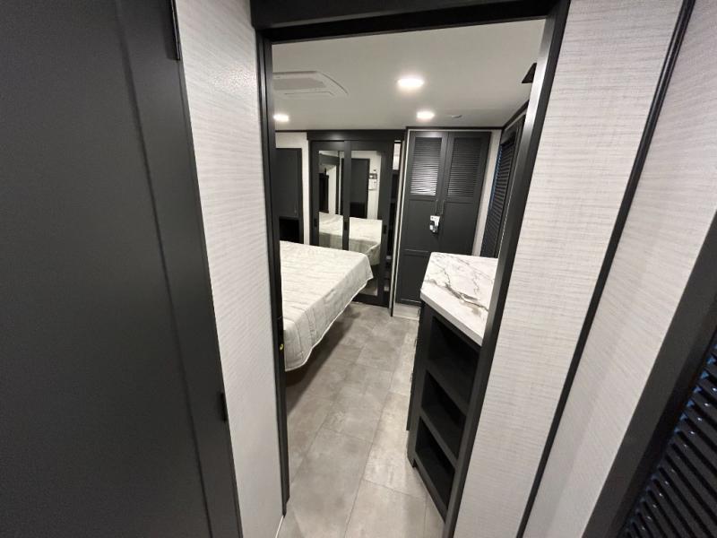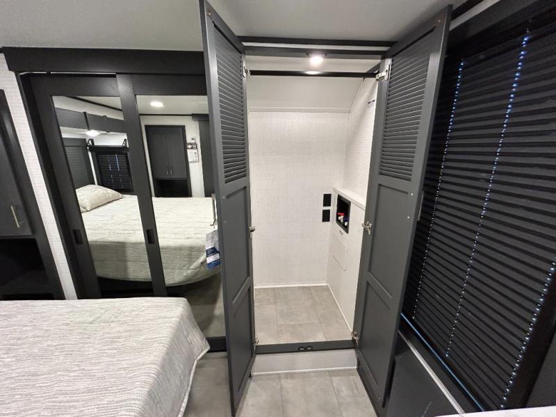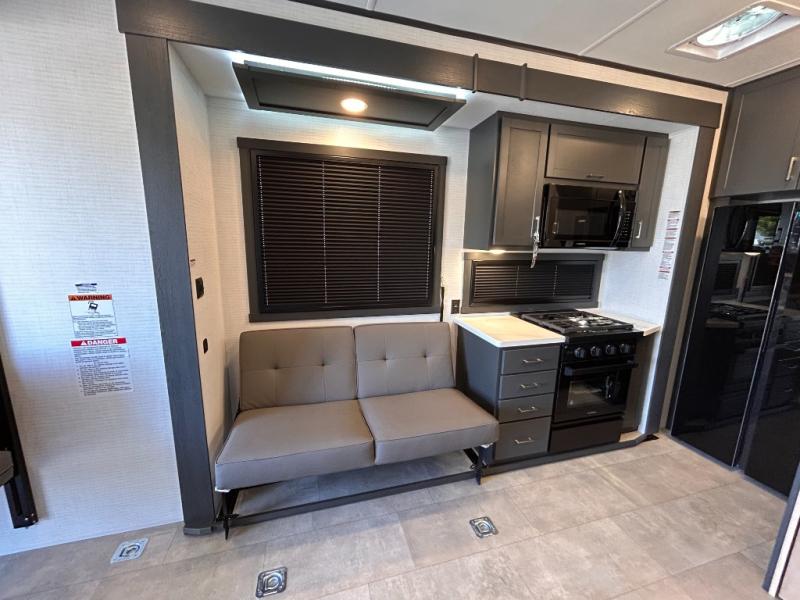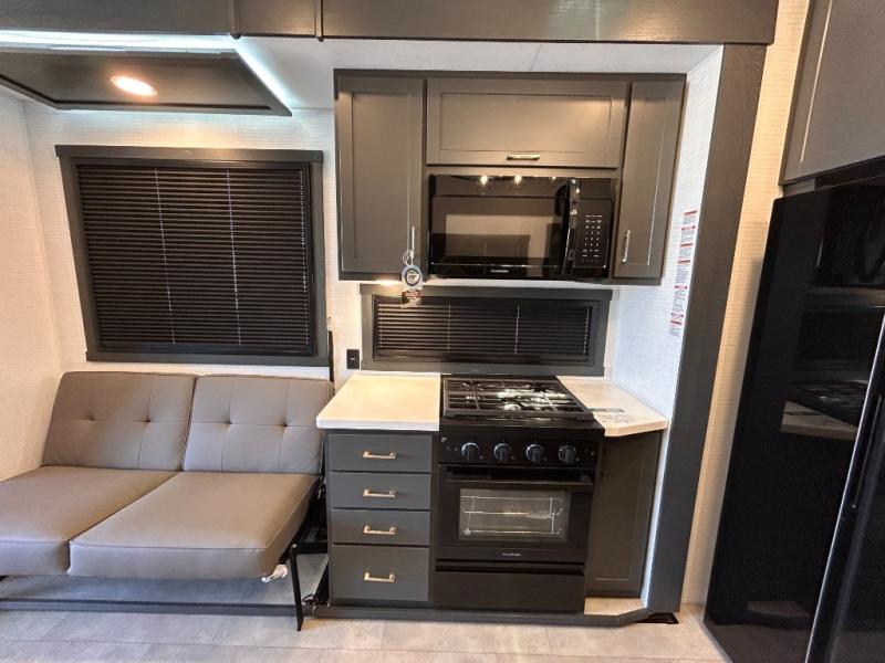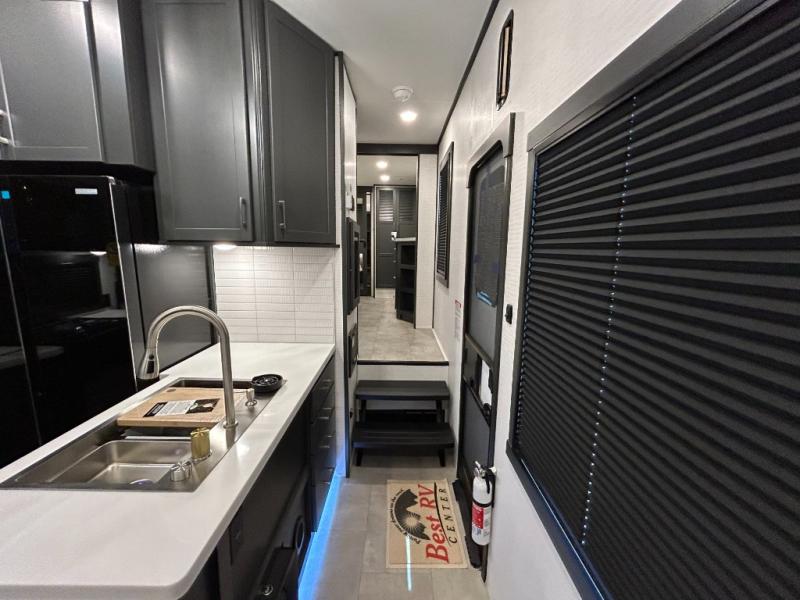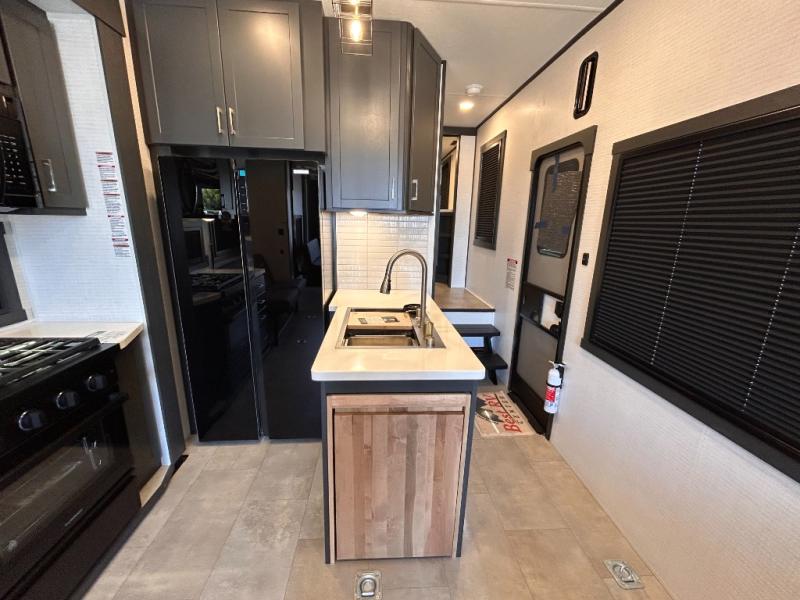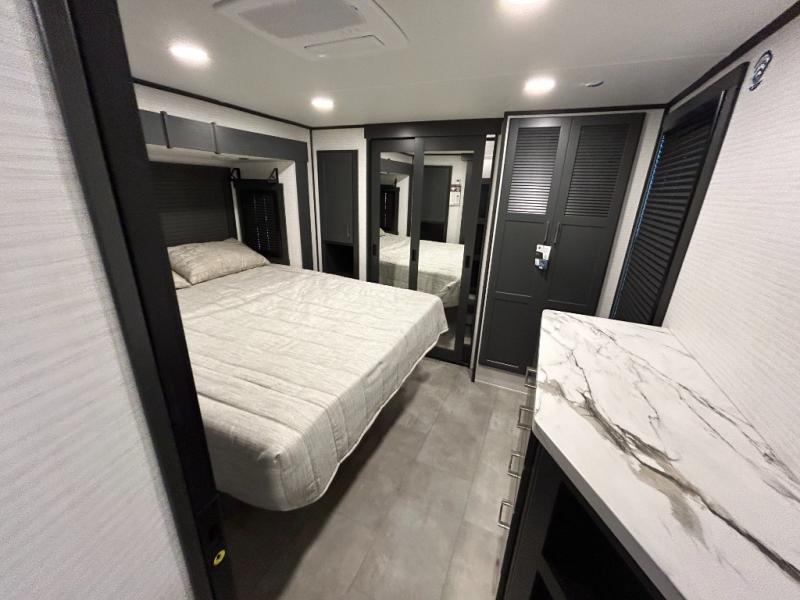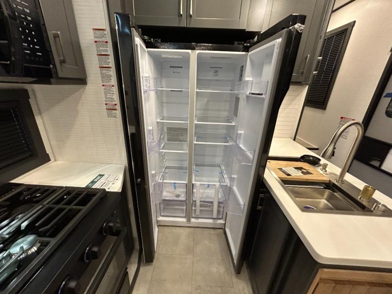 This toy hauler will bring the greatest sleeping experience on your road trip thanks to its private front bedroom, featuring a king bed with flip-up floor storage below, perfect for stashing your favorite gear. The room also includes a spacious wardrobe, washer and dryer prep for added convenience, shelves, dresser, and seat, providing ample storage and comfort. The full bathroom is spacious, complete with a generous 30 x 48 shower and linen closet for all your towels and bath clothes. You'll feel right at home with the luxurious amenities and comfortable living spaces. The kitchen is equipped with a microwave, waterfall sink, flip-up countertop for added space when cooking, a 16 cu fridge, pantry, and overhead cabinets. The living room is the perfect place to relax, featuring a flip-up sofa, two garage chairs, a TV, and an overhead cabinet. You'll have everything you need to unwind after a long day of adventure. In the garage, you'll find sit-n-sleep rollovers, a removable dinette table, and a sleep-and-store above. Also, perform various activities outside without worrying about the weather thanks to the massive 20’ awning and enjoy the fresh air. With its luxurious amenities, spacious living areas, and versatile garage space, our toy hauler is the perfect vehicle for anyone who loves adventure.