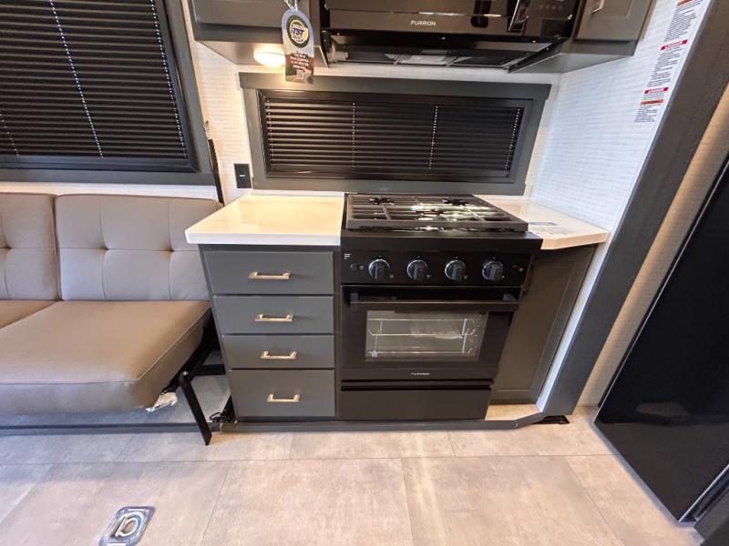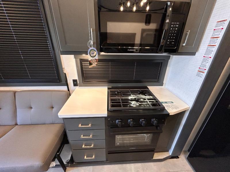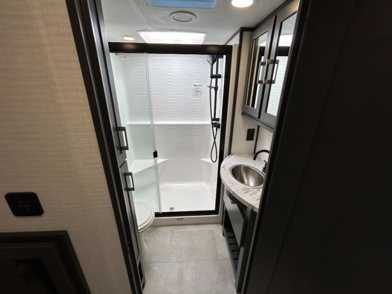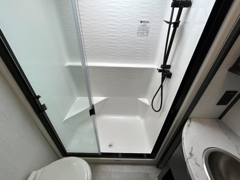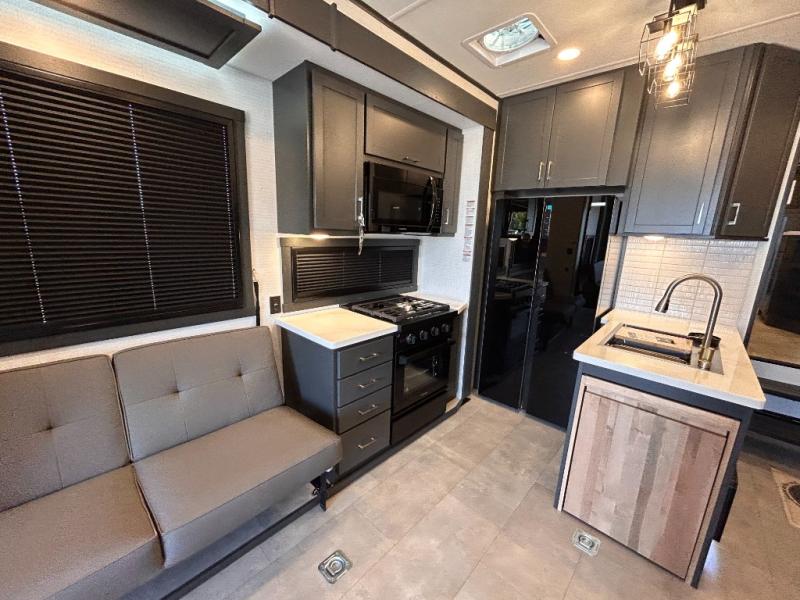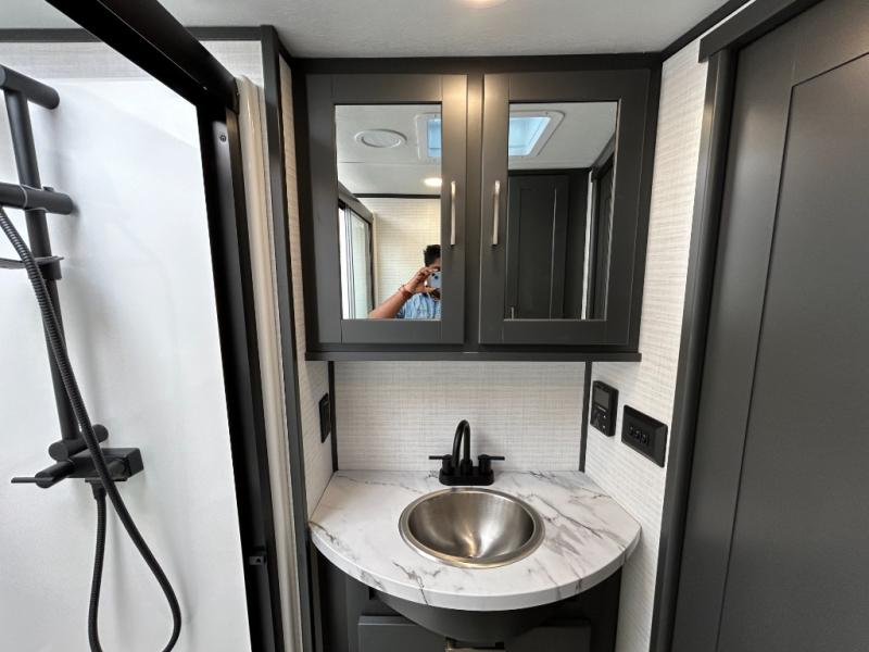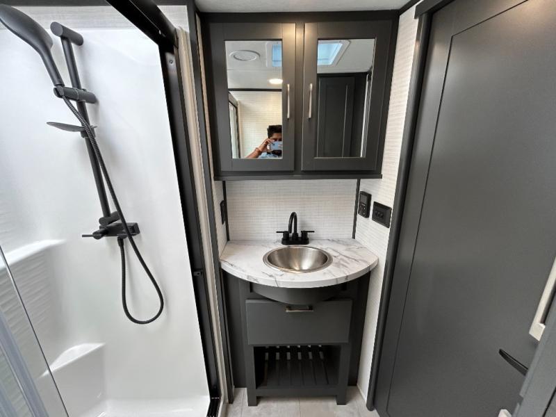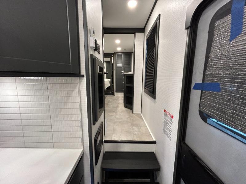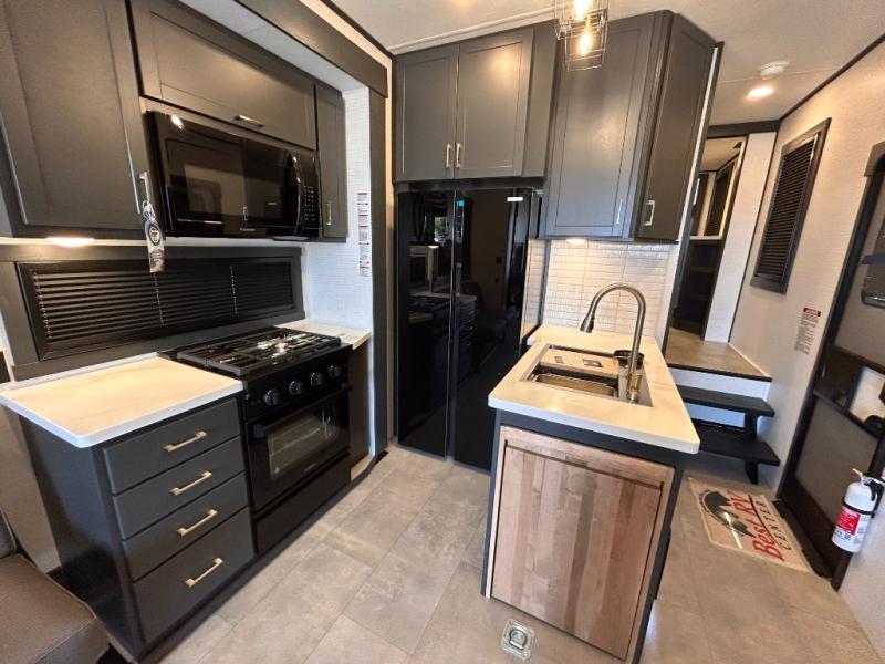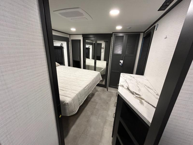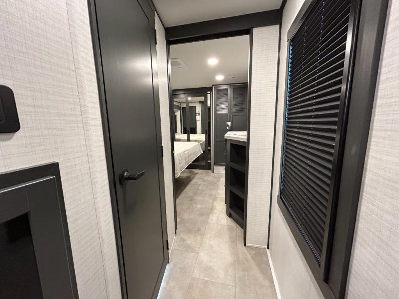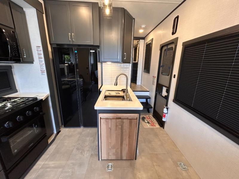 This toy hauler will bring the greatest sleeping experience on your road trip thanks to its private front bedroom, featuring a king bed with flip-up floor storage below, perfect for stashing your favorite gear. The room also includes a spacious wardrobe, washer and dryer prep for added convenience, shelves, dresser, and seat, providing ample storage and comfort. The full bathroom is spacious, complete with a generous 30 x 48 shower and linen closet for all your towels and bath clothes. You'll feel right at home with the luxurious amenities and comfortable living spaces. The kitchen is equipped with a microwave, waterfall sink, flip-up countertop for added space when cooking, a 16 cu fridge, pantry, and overhead cabinets. The living room is the perfect place to relax, featuring a flip-up sofa, two garage chairs, a TV, and an overhead cabinet. You'll have everything you need to unwind after a long day of adventure. In the garage, you'll find sit-n-sleep rollovers, a removable dinette table, and a sleep-and-store above. Also, perform various activities outside without worrying about the weather thanks to the massive 20’ awning and enjoy the fresh air. With its luxurious amenities, spacious living areas, and versatile garage space, our toy hauler is the perfect vehicle for anyone who loves adventure.