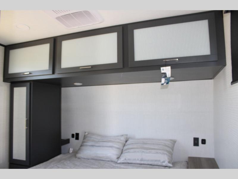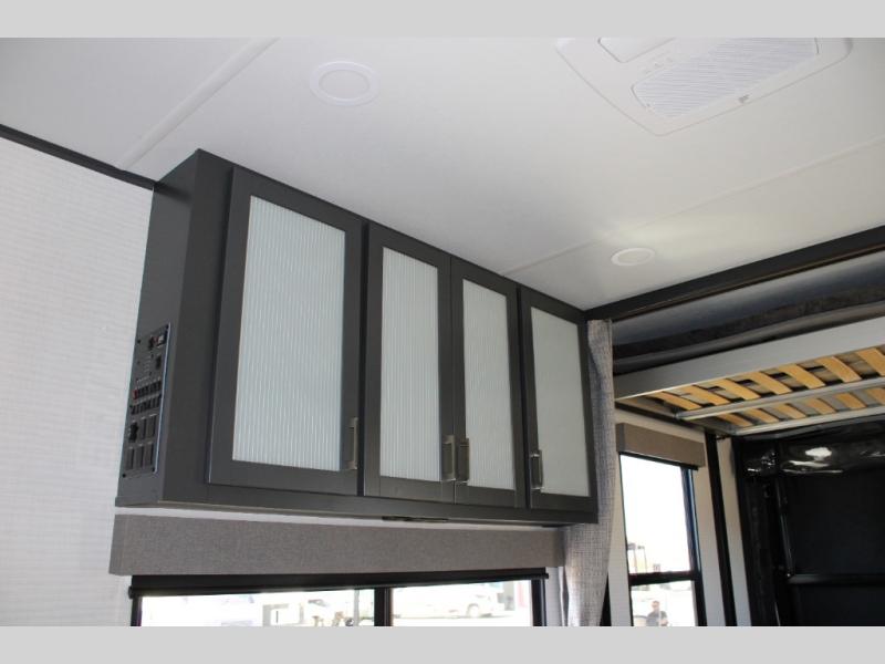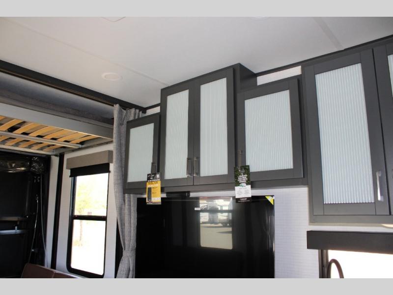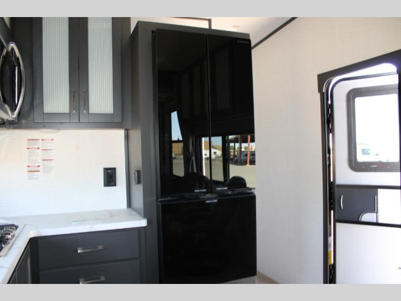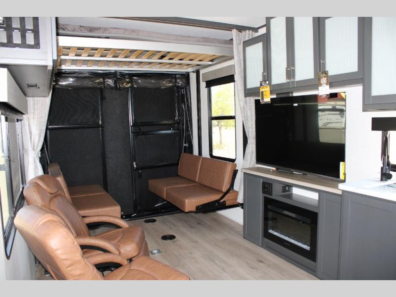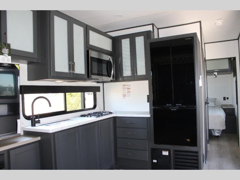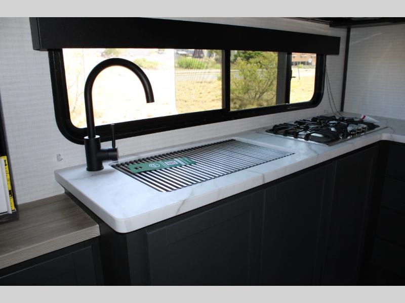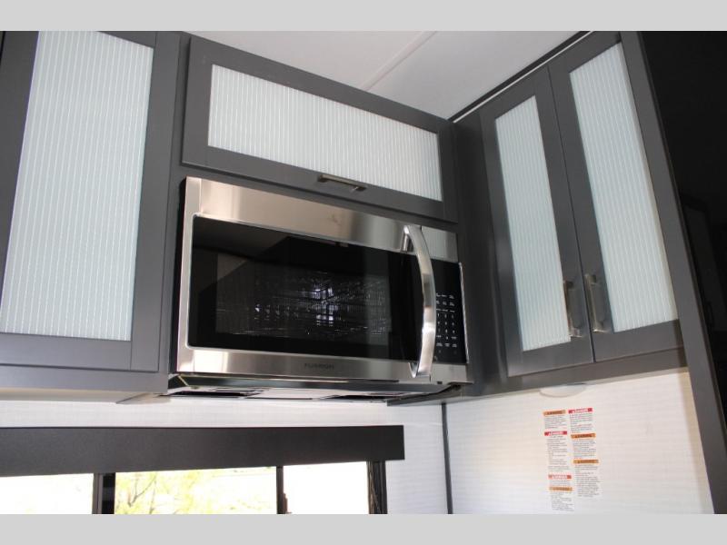 - Fully Equipped Kitchen – Includes a 10 cu. ft. 12V refrigerator, three-burner cooktop, microwave, and overhead storage for meal prep on the go.