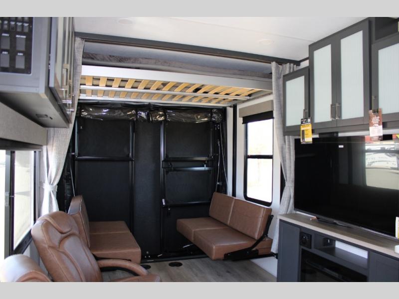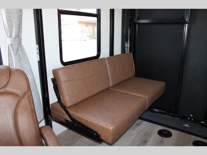 - Electric Bed & Pass-Through Dinette – Easily converts into a 54" x 80" sleeping area for added guest accommodations.