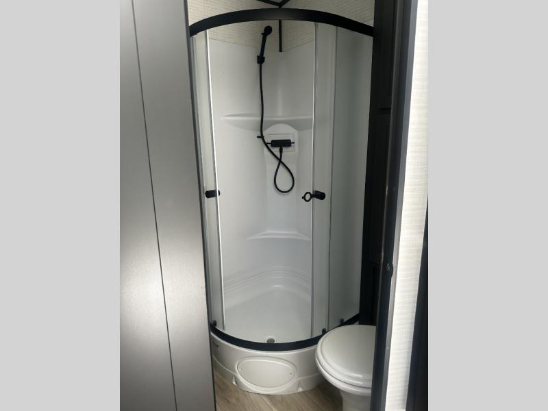 - Walk-Through Bathroom: The walk-through bathroom layout features a radius shower and vanity, providing privacy and convenience without taking up extra space.
