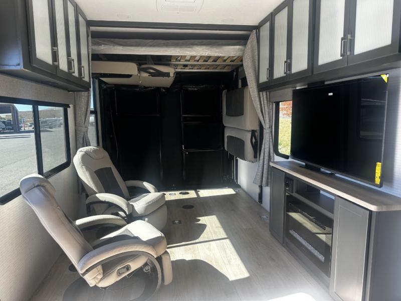 - Electric Queen Bed with Pass-Through Dinette: The rear cargo area features a 54” x 80” electric queen bed above an innovative pass-through dinette, allowing you to maximize seating and sleeping space while keeping the area versatile for your toys.