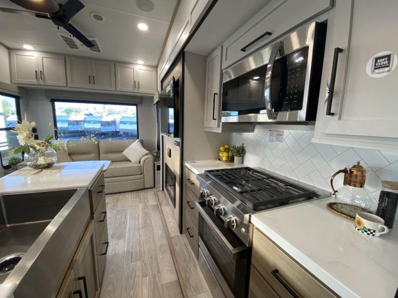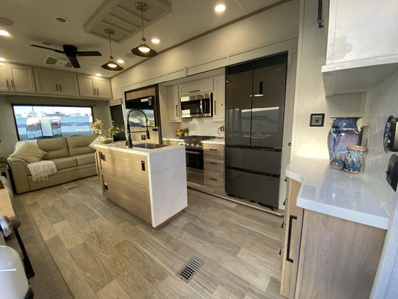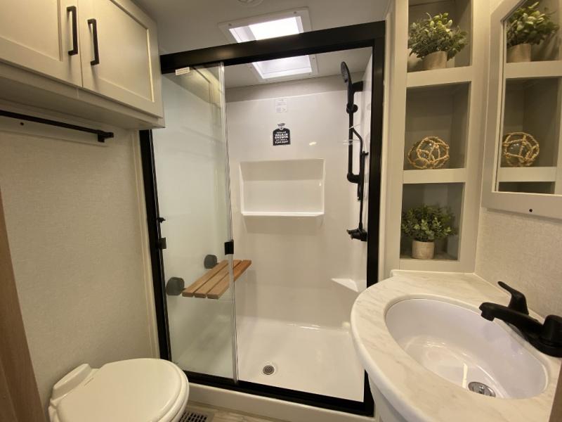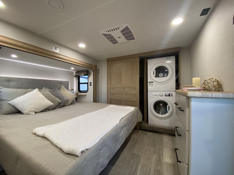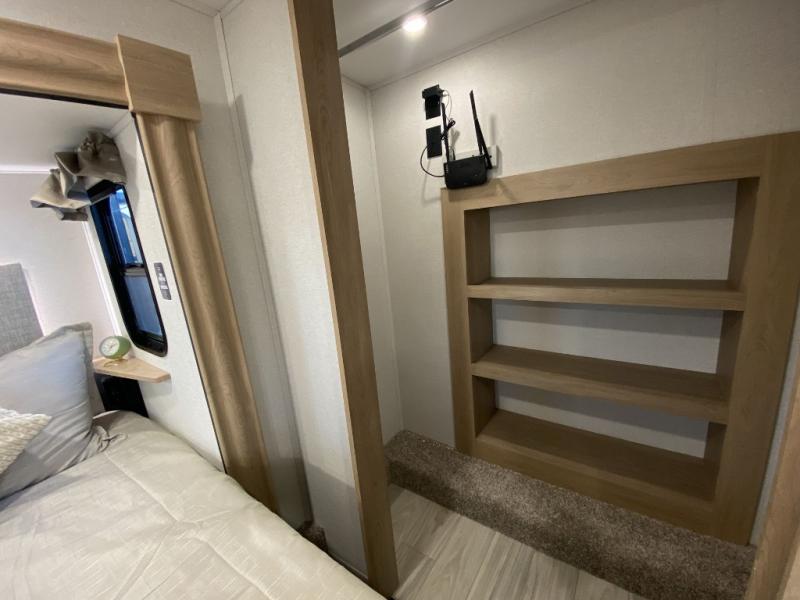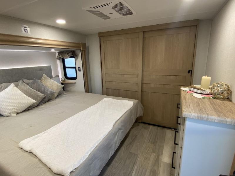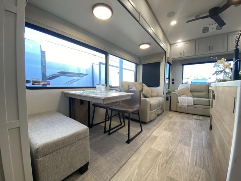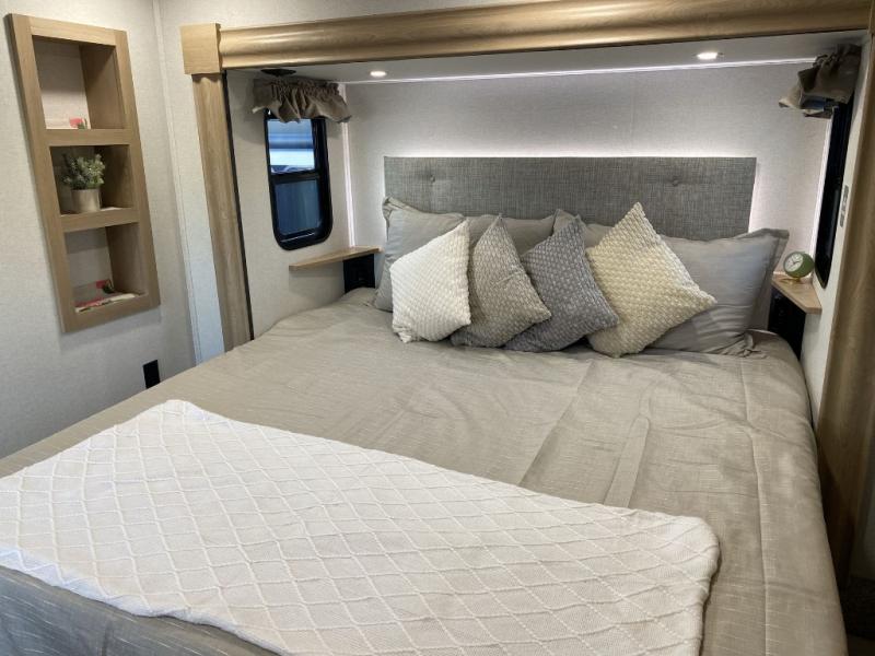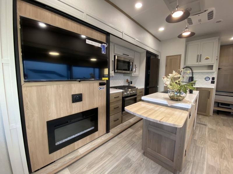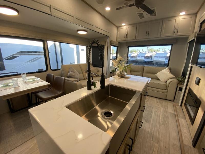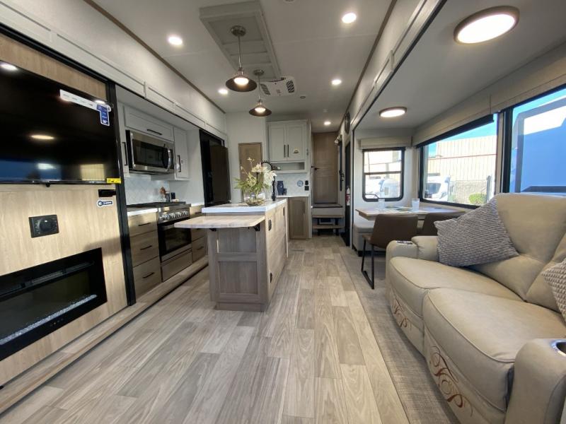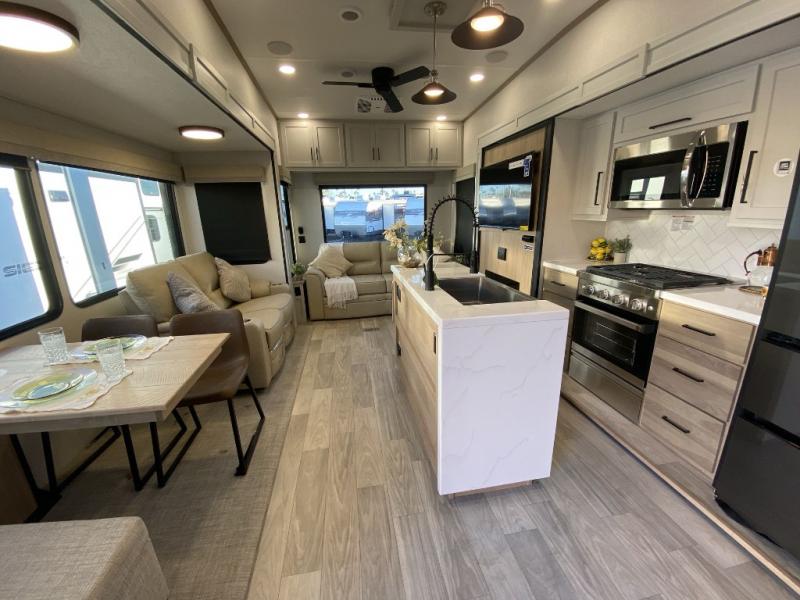 You will enjoy every adventure in this Sierra fifth wheel that is perfect for a couple that enjoys weekend or long term camping. This Sierra features triple slides for added space, a large kitchen island, plus a free standing dinette in the kitchen area which makes it feel a lot like home. When outside, you can enjoy being seated under the two power awnings with an LED light strip which is great for evening entertaining or relaxing. When it's time to get cleaned up and ready for bed, you will appreciate the spacious bath with a shower with a seat, a linen cabinet, and vanity/sink with a medicine cabinet as well. A front private bedroom with king bed slide will provide you with a great night's rest, and the large wardrobe has shelves for all your things. This model even has washer/dryer that will make full-time easier than ever!