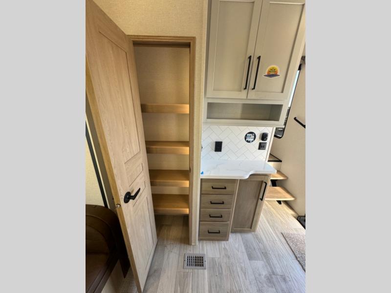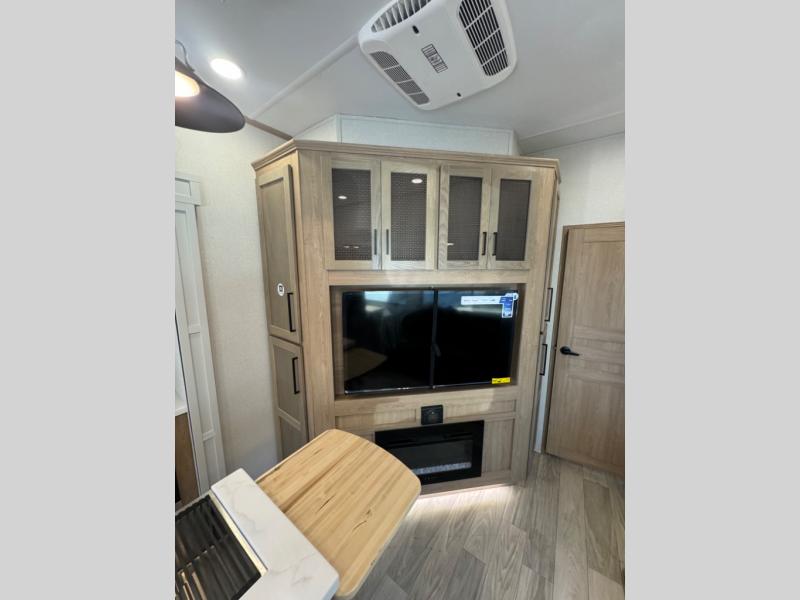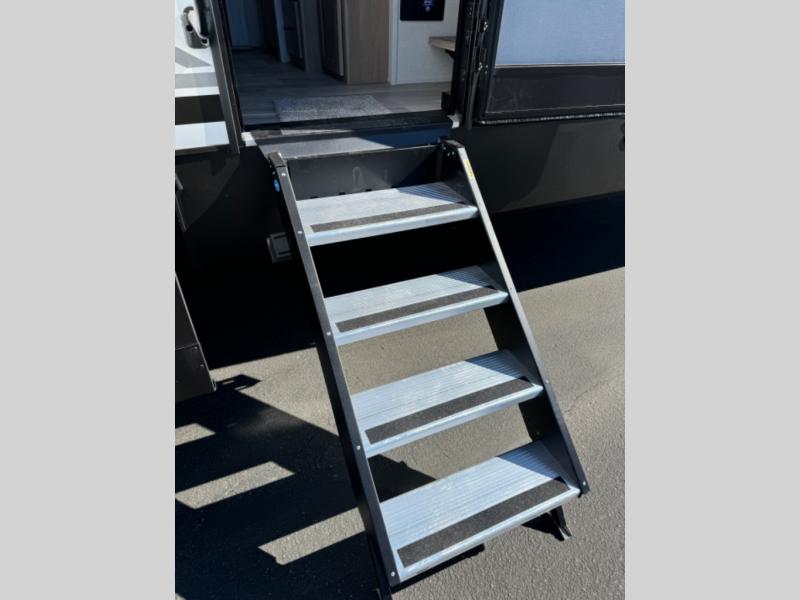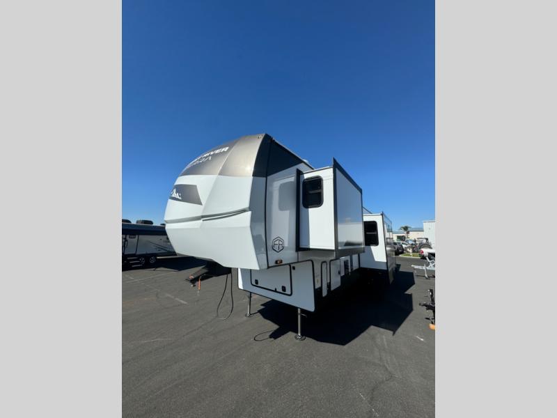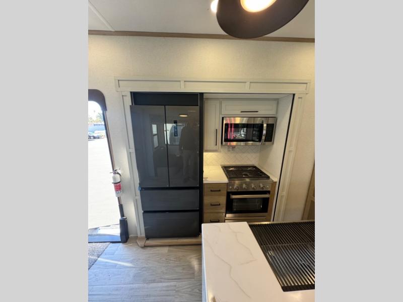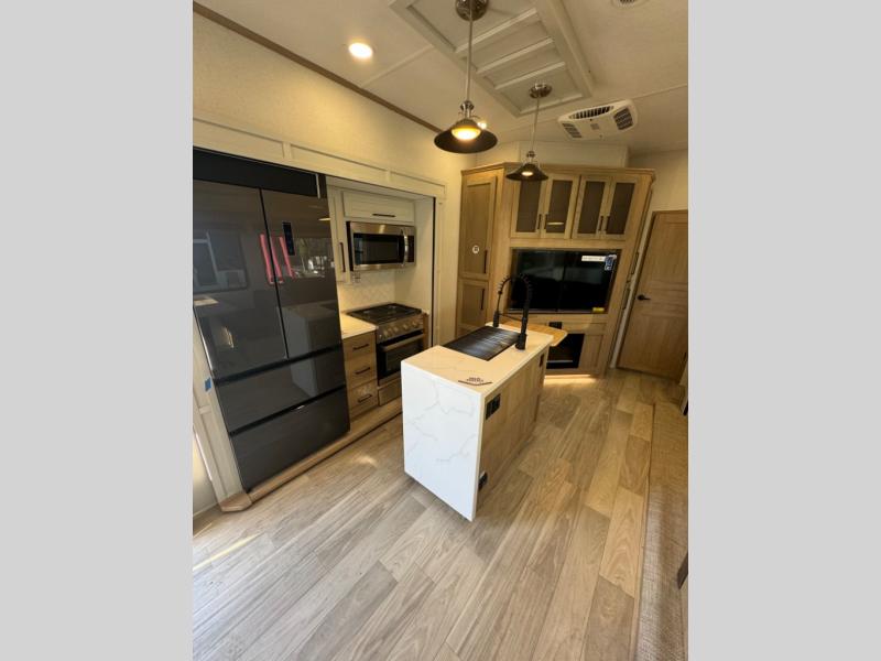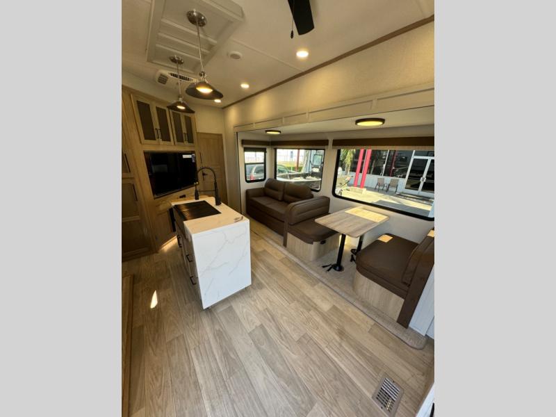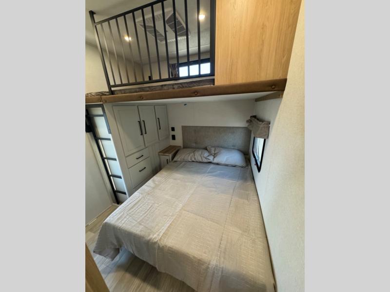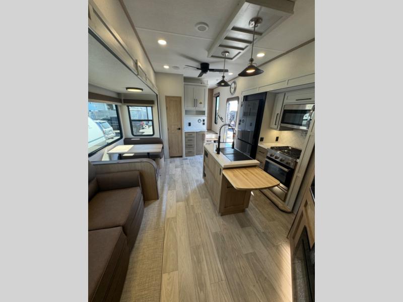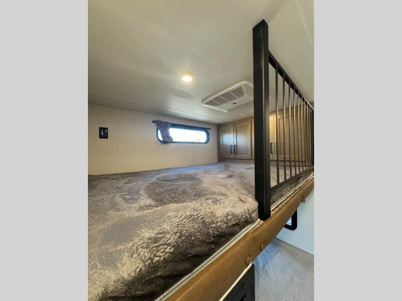 This fifth wheel is perfect for those whole like to camp with a whole group, whether it be with family or friends! There is a rear private suite with a lower RV queen bed and loft bed, a half bath, and your own private entrance. The front private bedroom includes a king bed slide out with a large front wardrobe, a dresser, and washer/dryer prep. And the spacious full bath is close by for easy nighttime use. Everyone can meet in the main living area that includes dual opposing slides, a tri-fold sofa and a booth dinette, plus a 50" TV for movie night. There is also a coffee bar here where you can set up your Keurig machine, a pantry for snacks, and a ceiling fan to keep the air moving. You will also love the exterior cooktop for breakfast outdoors, and the two power awnings with LED lights will provide shade during the day and ambience at night!