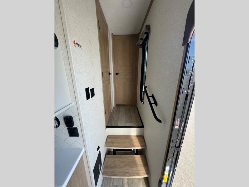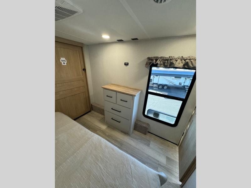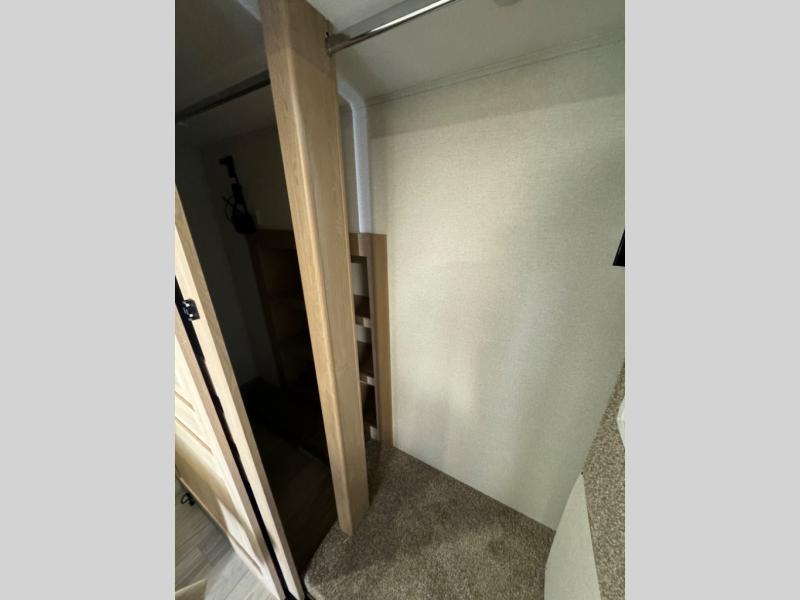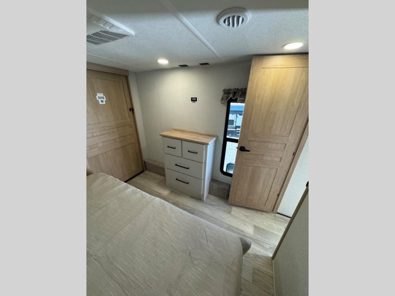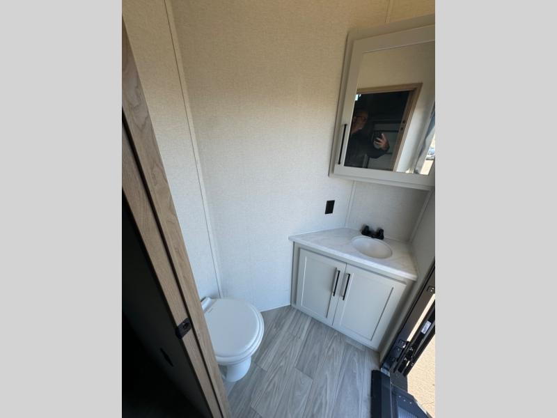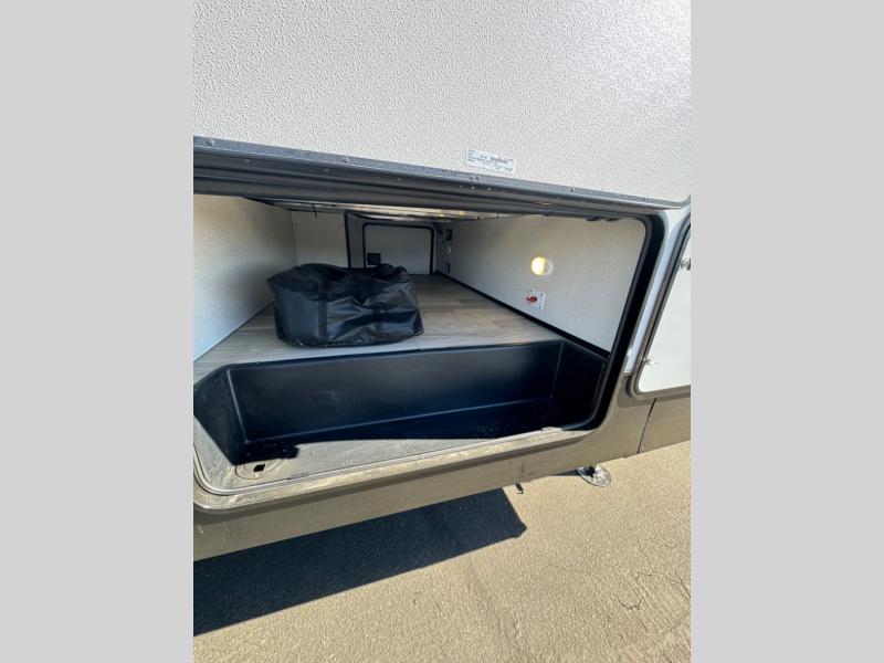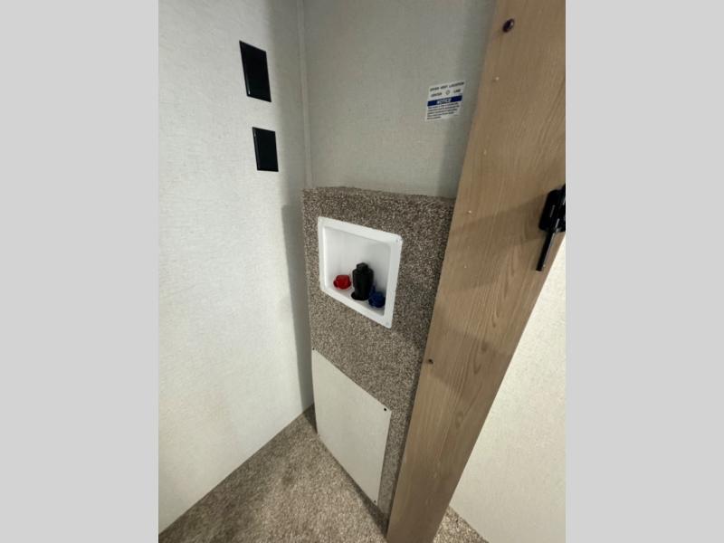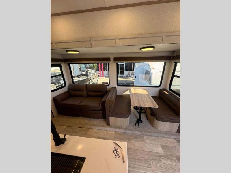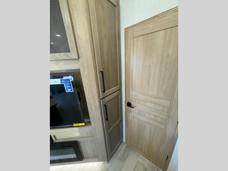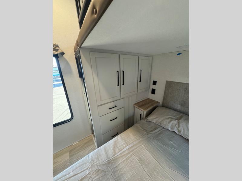 This fifth wheel is perfect for those whole like to camp with a whole group, whether it be with family or friends! There is a rear private suite with a lower RV queen bed and loft bed, a half bath, and your own private entrance. The front private bedroom includes a king bed slide out with a large front wardrobe, a dresser, and washer/dryer prep. And the spacious full bath is close by for easy nighttime use. Everyone can meet in the main living area that includes dual opposing slides, a tri-fold sofa and a booth dinette, plus a 50" TV for movie night. There is also a coffee bar here where you can set up your Keurig machine, a pantry for snacks, and a ceiling fan to keep the air moving. You will also love the exterior cooktop for breakfast outdoors, and the two power awnings with LED lights will provide shade during the day and ambience at night!