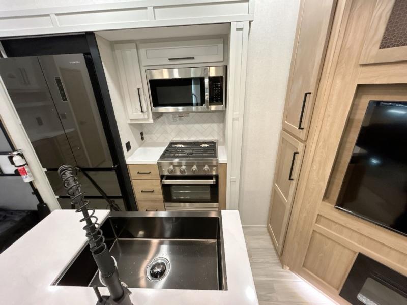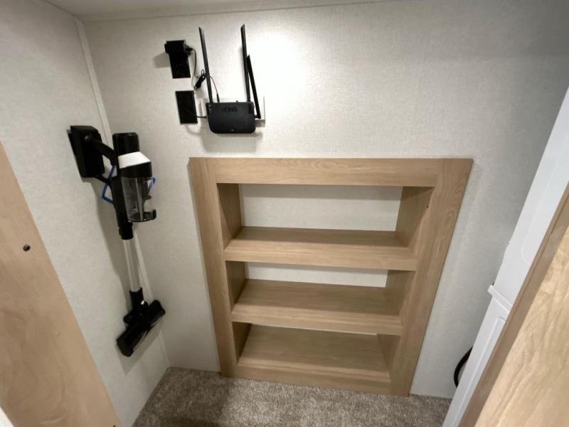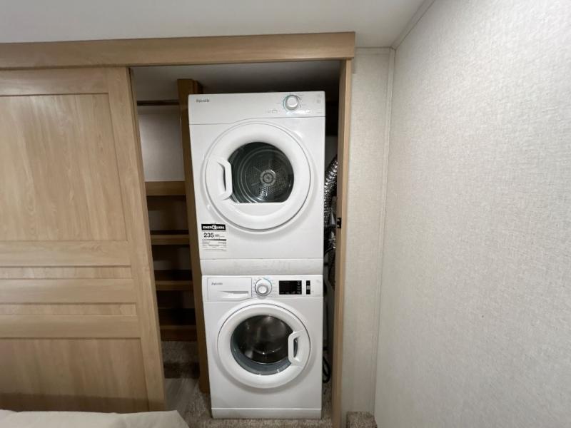 This fifth wheel is perfect for those whole like to camp with a whole group, whether it be with family or friends! There is a rear private suite with a lower RV queen bed and loft bed, a half bath, and your own private entrance. The front private bedroom includes a king bed slide out with a large front wardrobe, a dresser, and washer/dryer prep. And the spacious full bath is close by for easy nighttime use. Everyone can meet in the main living area that includes dual opposing slides, a tri-fold sofa and a booth dinette, plus a 50" TV for movie night. There is also a coffee bar here where you can set up your Keurig machine, a pantry for snacks, and a ceiling fan to keep the air moving. You will also love the exterior cooktop for breakfast outdoors, and the two power awnings with LED lights will provide shade during the day and ambience at night!
