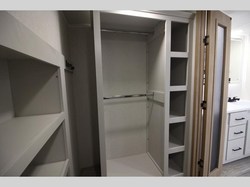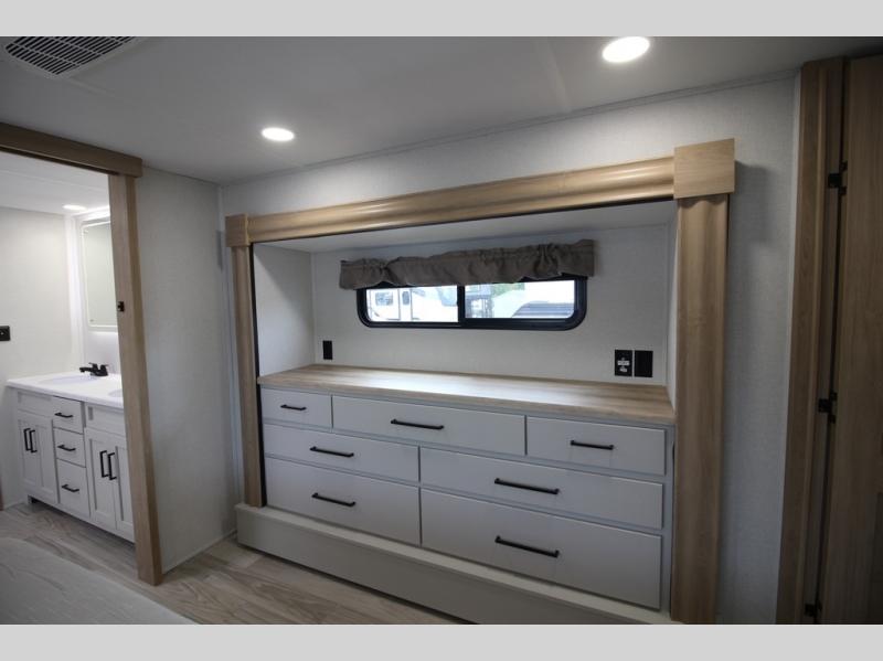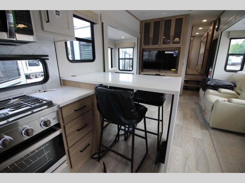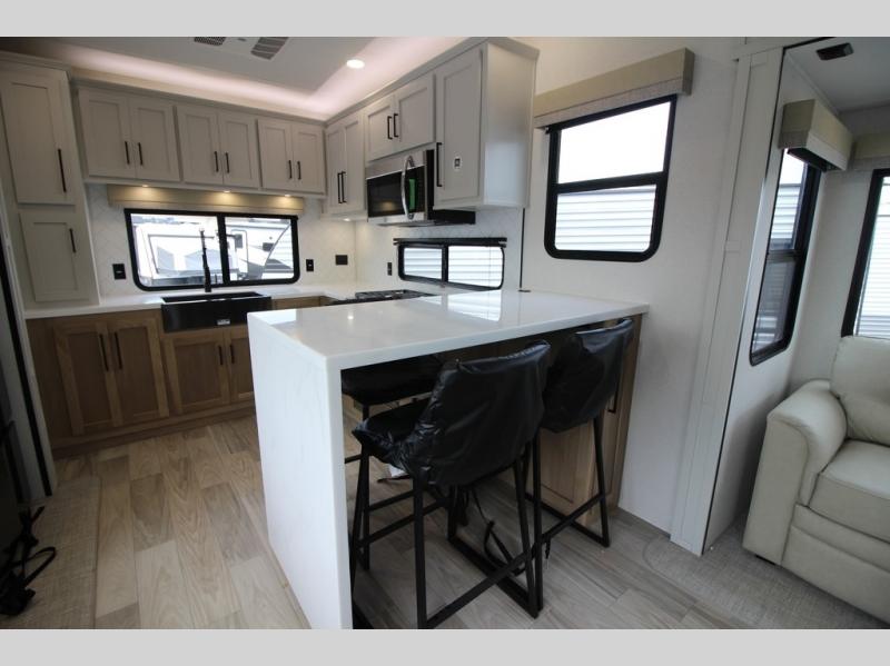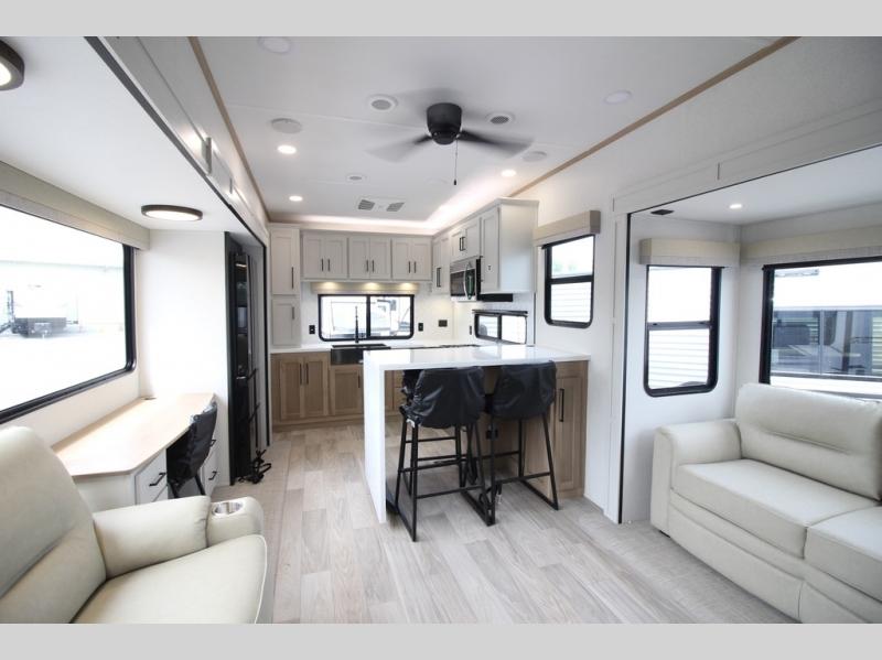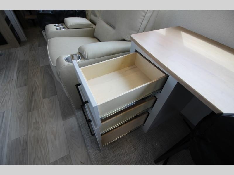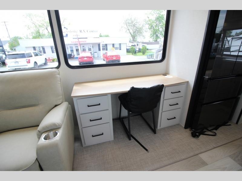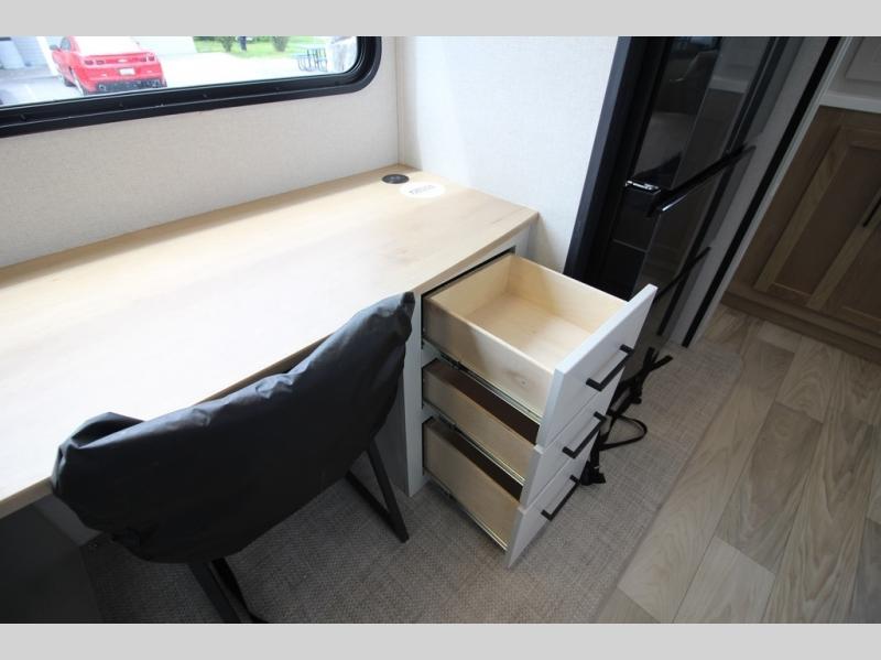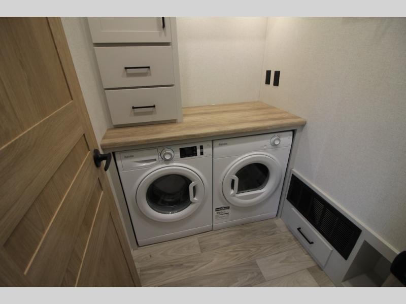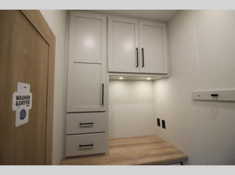 If you're looking to go full-time RVing, this fifth wheel is packed with convenient features! The master bedroom includes a king bed slide out with USB ports on either side of the bed so you both can charge your phones, and there is a dresser for your folded clothes. You will love the front bathroom with dual bath sinks, a shower with a seat, plus a walk-in closet with shelves, rods to hand clothes, and baskets for laundry! There is a unique middle utility room with washer and dryer, Washer and dryer counter and a rod to hang clothes that will make a perfect laundry room, or you can utilize this space for storage! Head to the main living area to relax on the theater seating or hide-a-bed sofa, and if you have guests stay over, they can sleep here. There is also an entertainment center with a 50" flat screen TV, but you might just leave that off if you're working at the desk with a chair that is provided. We've saved the best part for last; the kitchen! Here, you'll find ample counter space to prep home-cooked meals, a three burner high output range with a 22" oven, plus a large counter with barstools where you can enjoy breakfast at each morning. Choosing this fifth wheel is a no-brainer!