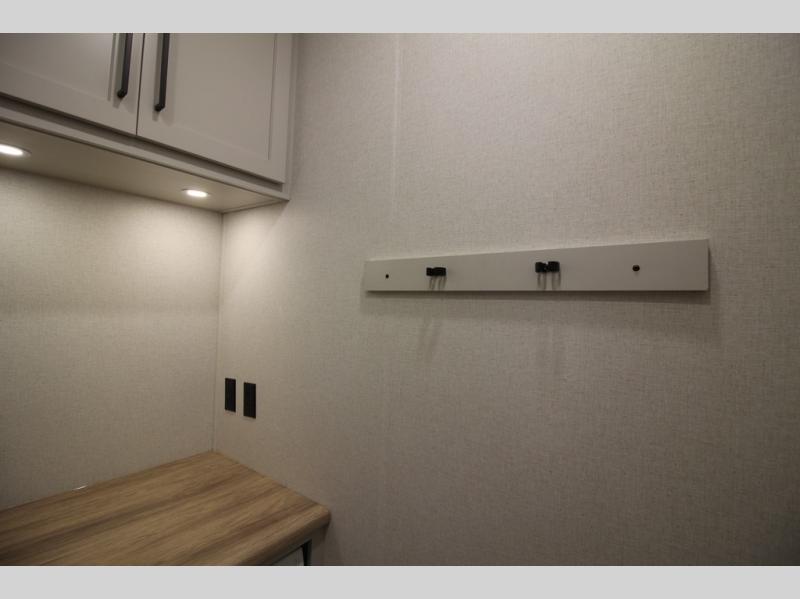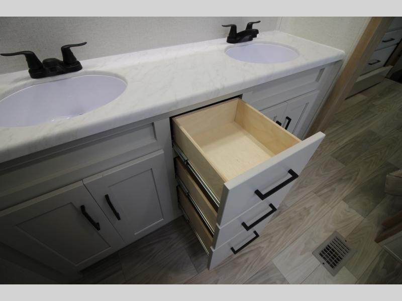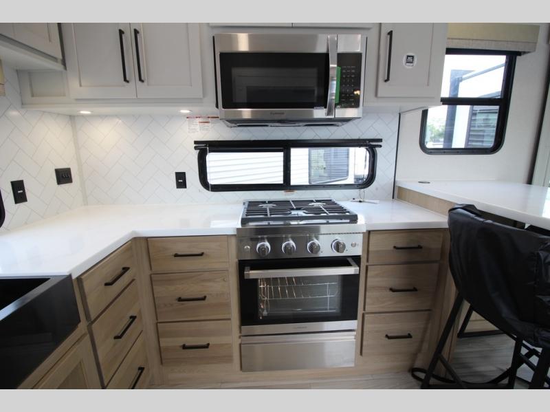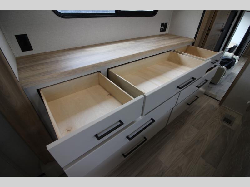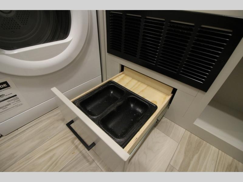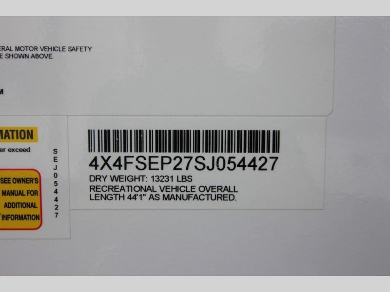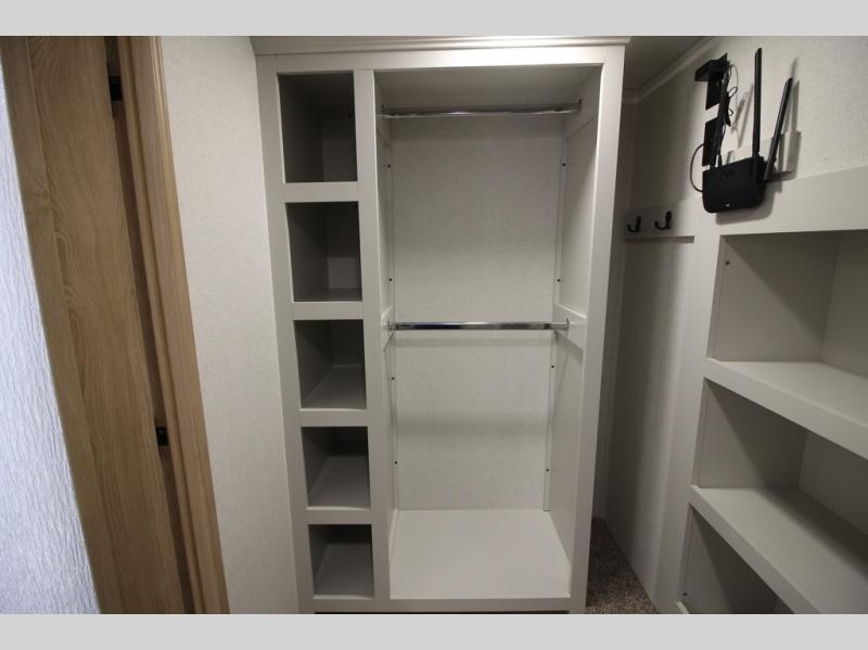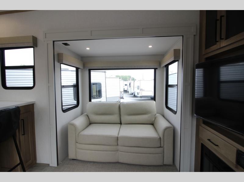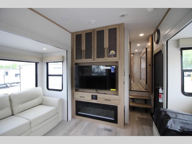 If you're looking to go full-time RVing, this fifth wheel is packed with convenient features! The master bedroom includes a king bed slide out with USB ports on either side of the bed so you both can charge your phones, and there is a dresser for your folded clothes. You will love the front bathroom with dual bath sinks, a shower with a seat, plus a walk-in closet with shelves, rods to hand clothes, and baskets for laundry! There is a unique middle utility room with washer and dryer, Washer and dryer counter and a rod to hang clothes that will make a perfect laundry room, or you can utilize this space for storage! Head to the main living area to relax on the theater seating or hide-a-bed sofa, and if you have guests stay over, they can sleep here. There is also an entertainment center with a 50" flat screen TV, but you might just leave that off if you're working at the desk with a chair that is provided. We've saved the best part for last; the kitchen! Here, you'll find ample counter space to prep home-cooked meals, a three burner high output range with a 22" oven, plus a large counter with barstools where you can enjoy breakfast at each morning. Choosing this fifth wheel is a no-brainer!