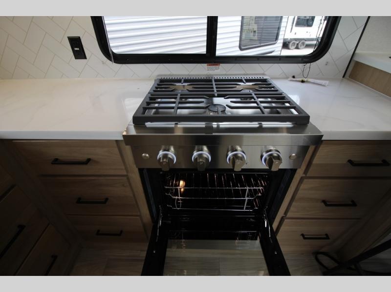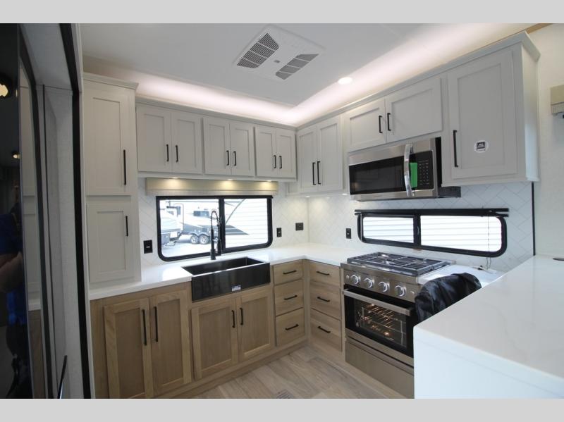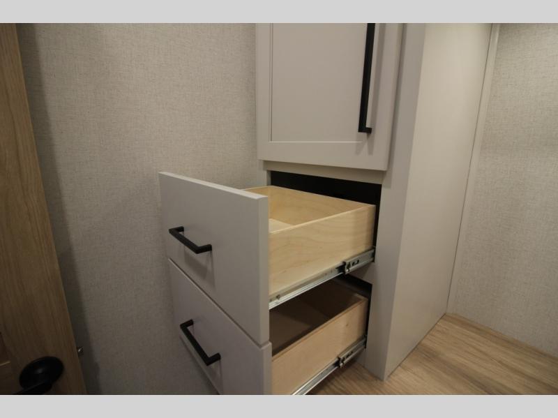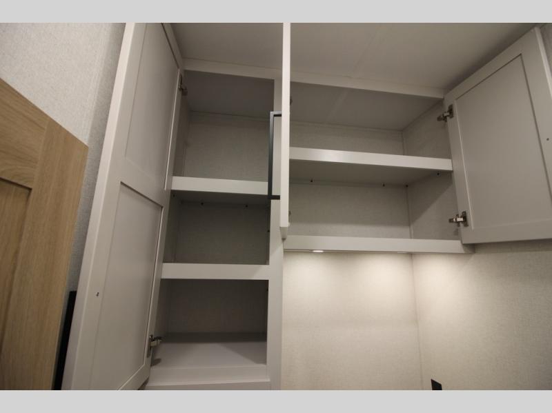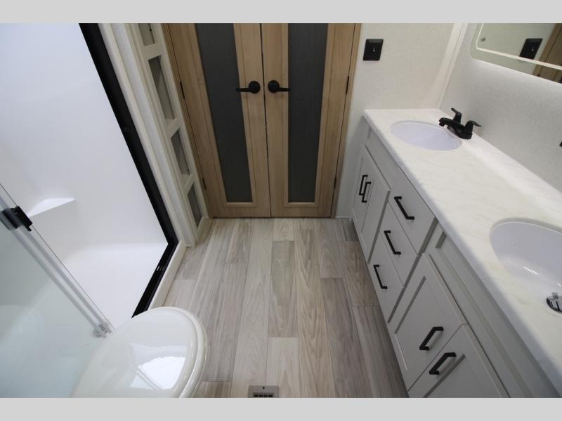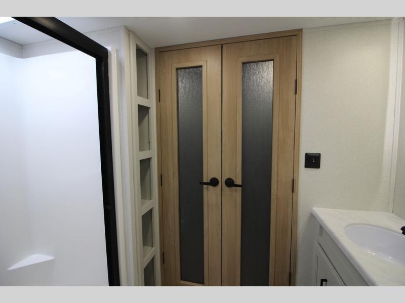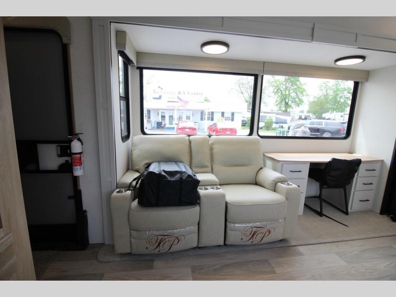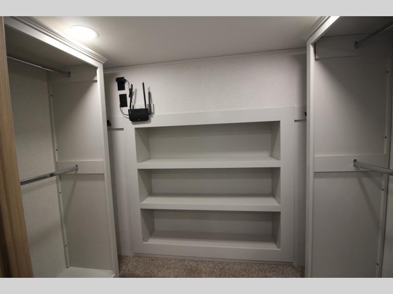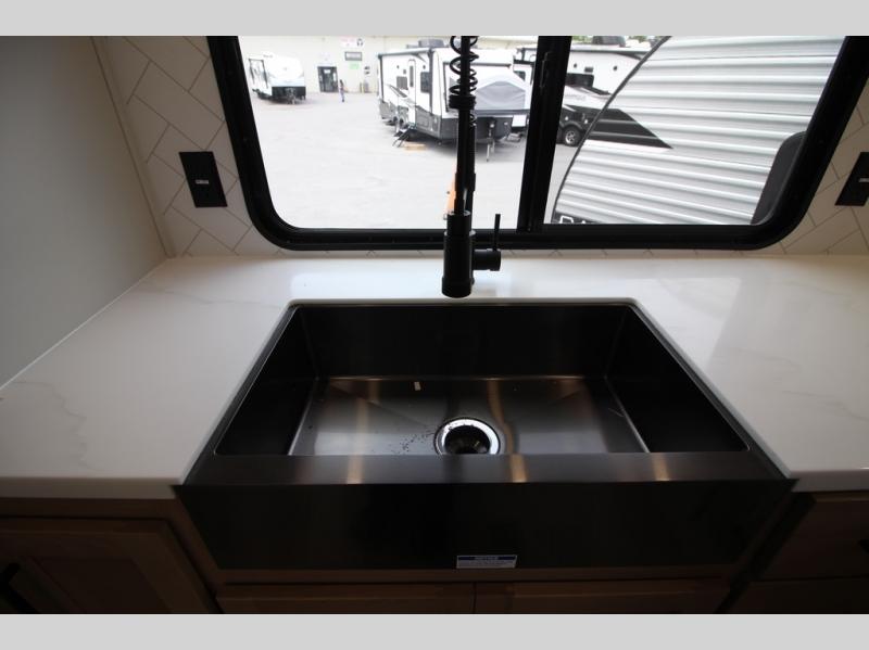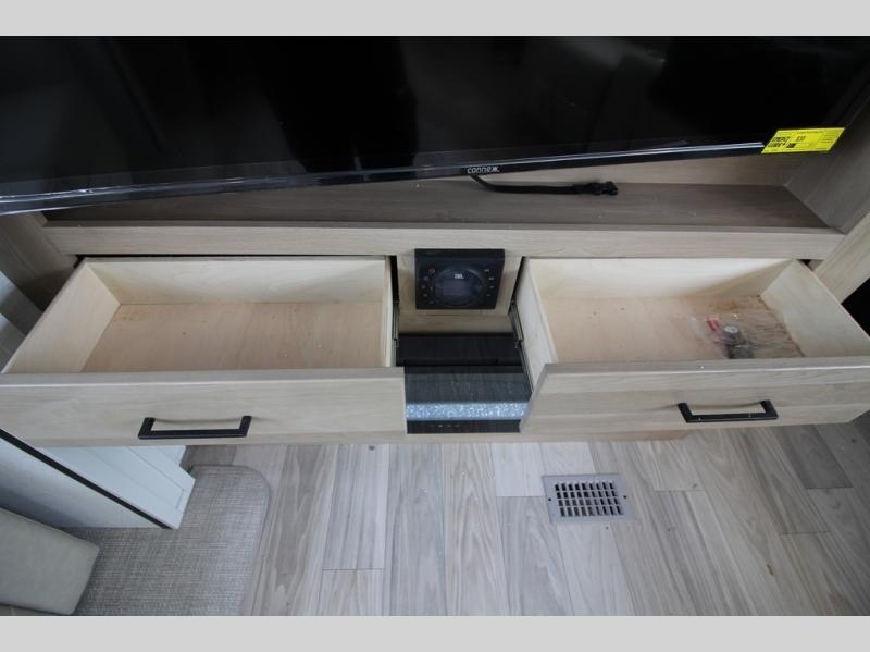 If you're looking to go full-time RVing, this fifth wheel is packed with convenient features! The master bedroom includes a king bed slide out with USB ports on either side of the bed so you both can charge your phones, and there is a dresser for your folded clothes. You will love the front bathroom with dual bath sinks, a shower with a seat, plus a walk-in closet with shelves, rods to hand clothes, and baskets for laundry! There is a unique middle utility room with washer and dryer, Washer and dryer counter and a rod to hang clothes that will make a perfect laundry room, or you can utilize this space for storage! Head to the main living area to relax on the theater seating or hide-a-bed sofa, and if you have guests stay over, they can sleep here. There is also an entertainment center with a 50" flat screen TV, but you might just leave that off if you're working at the desk with a chair that is provided. We've saved the best part for last; the kitchen! Here, you'll find ample counter space to prep home-cooked meals, a three burner high output range with a 22" oven, plus a large counter with barstools where you can enjoy breakfast at each morning. Choosing this fifth wheel is a no-brainer!