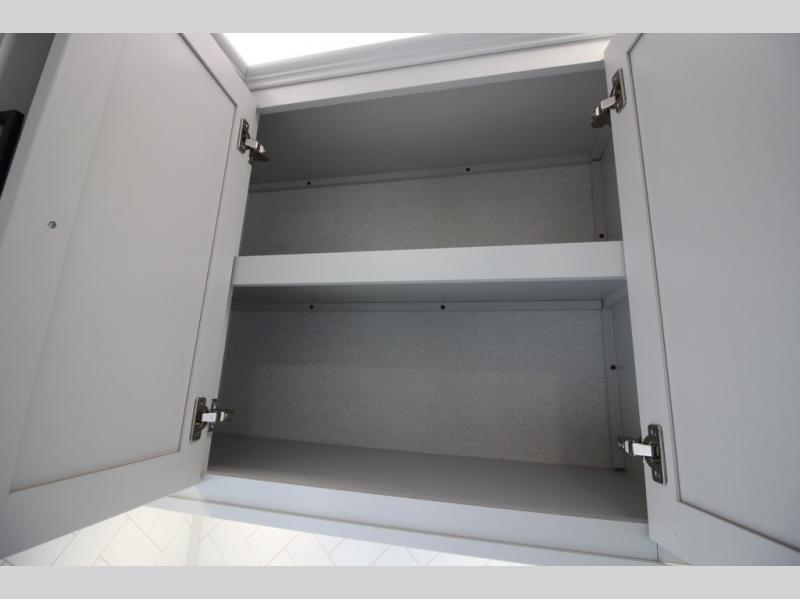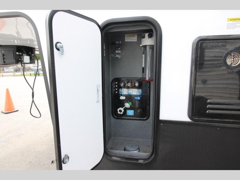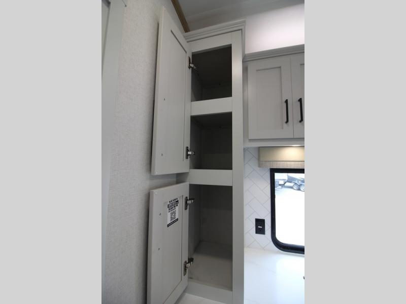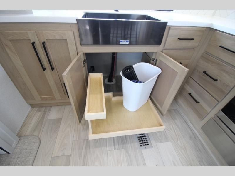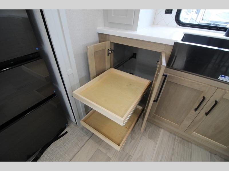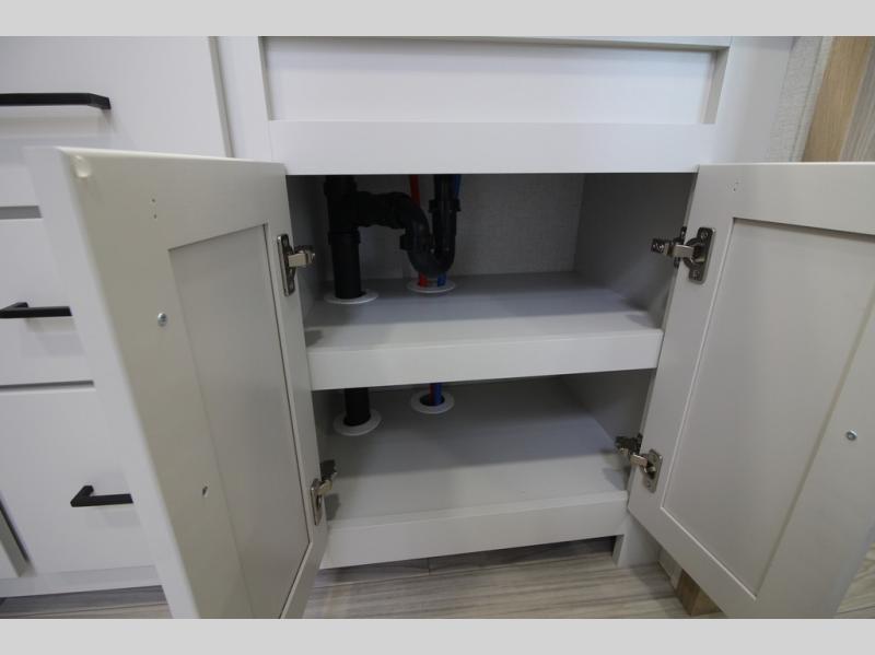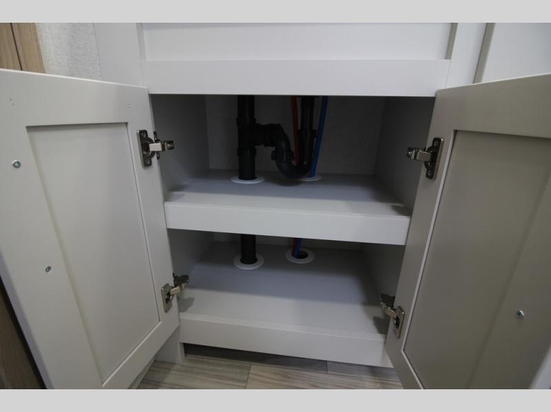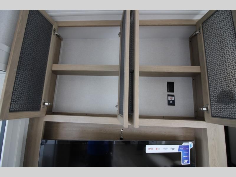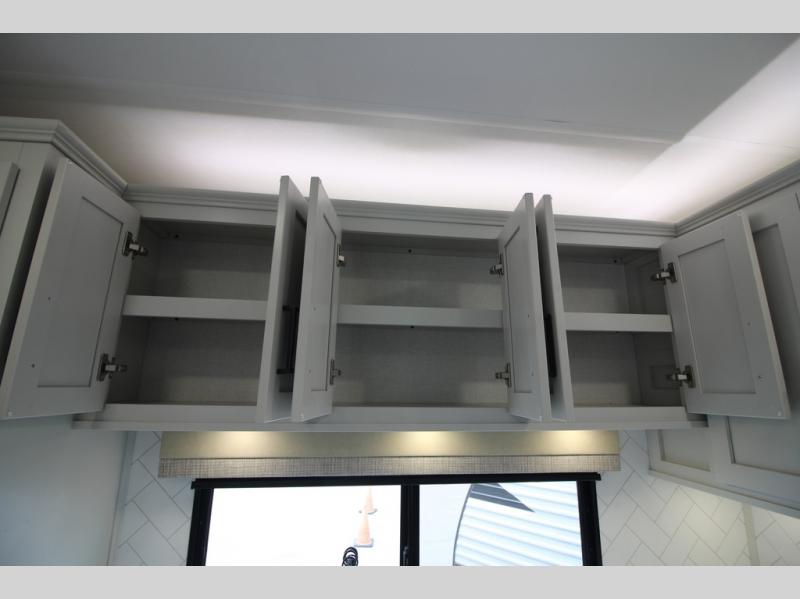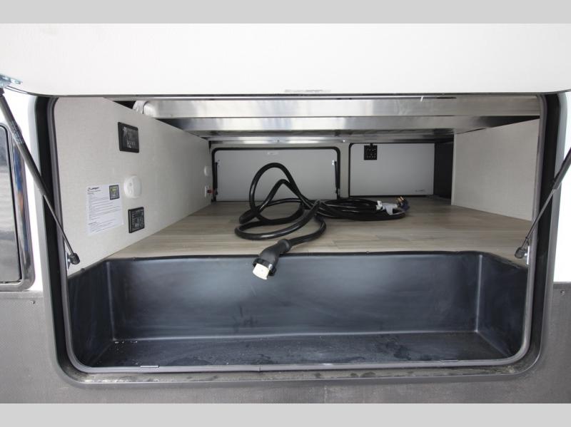 If you're looking to go full-time RVing, this fifth wheel is packed with convenient features! The master bedroom includes a king bed slide out with USB ports on either side of the bed so you both can charge your phones, and there is a dresser for your folded clothes. You will love the front bathroom with dual bath sinks, a shower with a seat, plus a walk-in closet with shelves, rods to hand clothes, and baskets for laundry! There is a unique middle utility room with washer and dryer, Washer and dryer counter and a rod to hang clothes that will make a perfect laundry room, or you can utilize this space for storage! Head to the main living area to relax on the theater seating or hide-a-bed sofa, and if you have guests stay over, they can sleep here. There is also an entertainment center with a 50" flat screen TV, but you might just leave that off if you're working at the desk with a chair that is provided. We've saved the best part for last; the kitchen! Here, you'll find ample counter space to prep home-cooked meals, a three burner high output range with a 22" oven, plus a large counter with barstools where you can enjoy breakfast at each morning. Choosing this fifth wheel is a no-brainer!