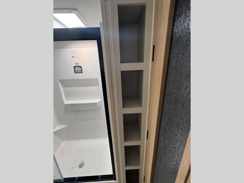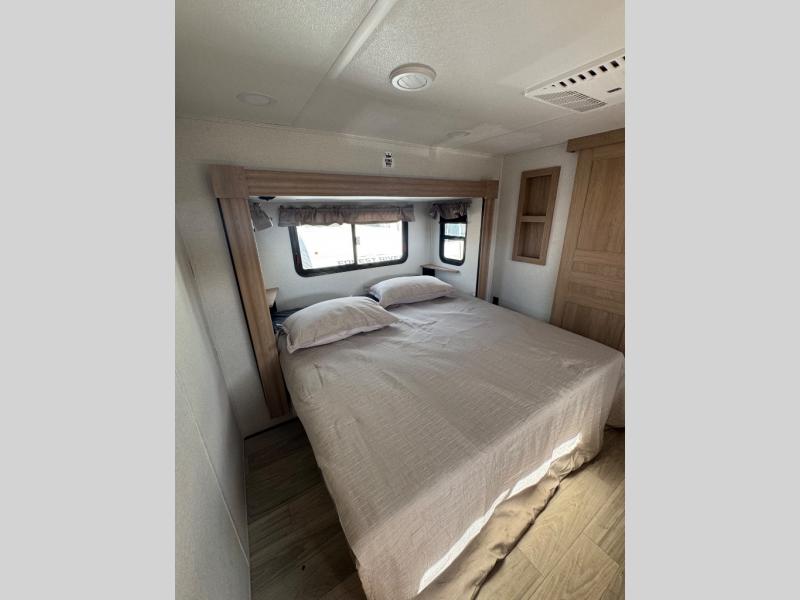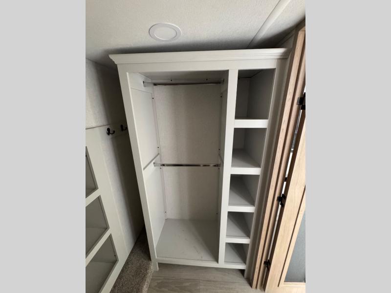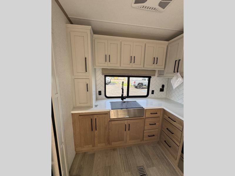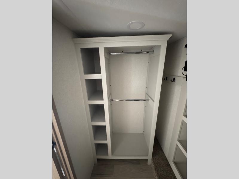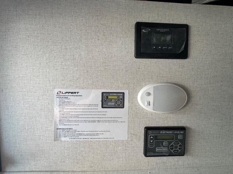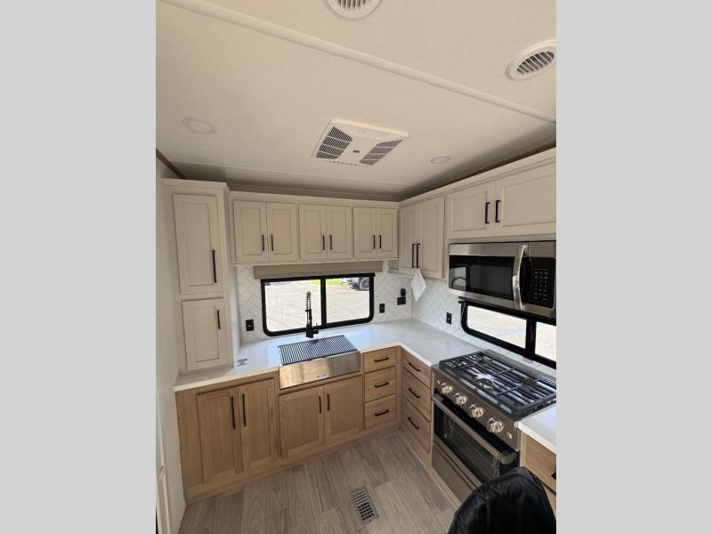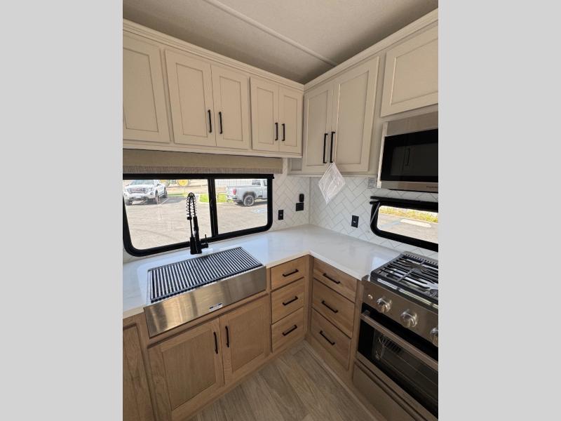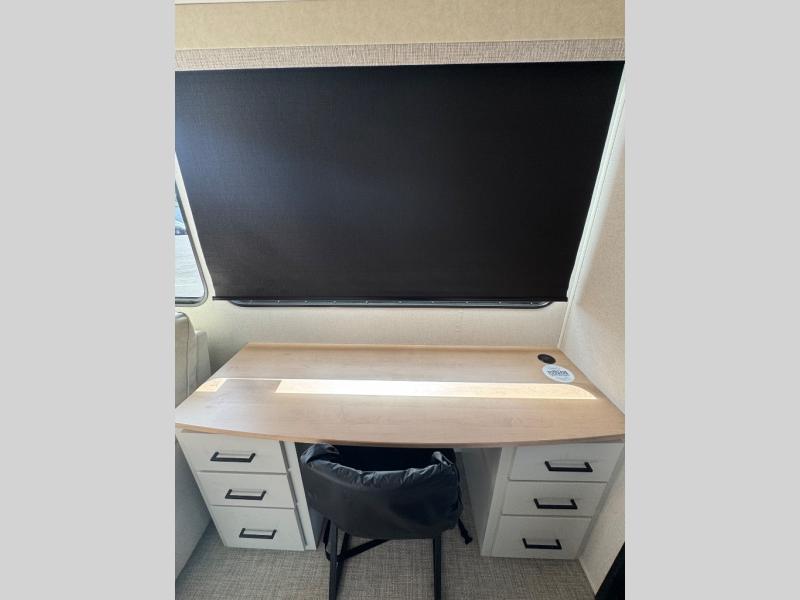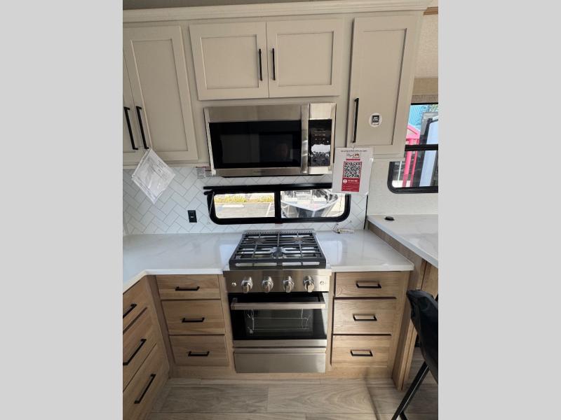 If you're looking to go full-time RVing, this fifth wheel is packed with convenient features! The master bedroom includes a king bed slide out with USB ports on either side of the bed so you both can charge your phones, and there is a dresser for your folded clothes. You will love the front bathroom with dual bath sinks, a shower with a seat, plus a walk-in closet with shelves, rods to hand clothes, and baskets for laundry! There is a unique middle utility room with washer and dryer, Washer and dryer counter and a rod to hang clothes that will make a perfect laundry room, or you can utilize this space for storage! Head to the main living area to relax on the theater seating or hide-a-bed sofa, and if you have guests stay over, they can sleep here. There is also an entertainment center with a 50" flat screen TV, but you might just leave that off if you're working at the desk with a chair that is provided. We've saved the best part for last; the kitchen! Here, you'll find ample counter space to prep home-cooked meals, a three burner high output range with a 22" oven, plus a large counter with barstools where you can enjoy breakfast at each morning. Choosing this fifth wheel is a no-brainer!