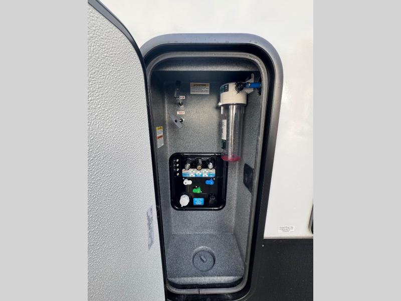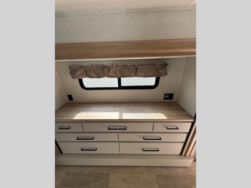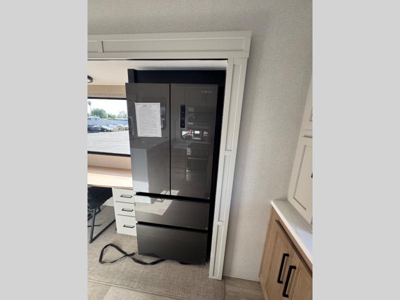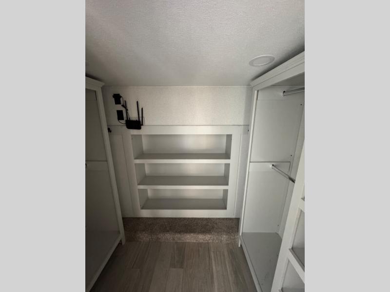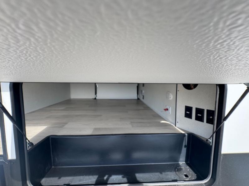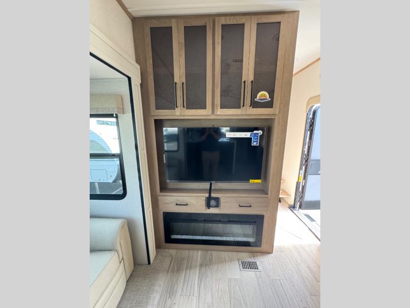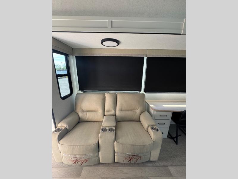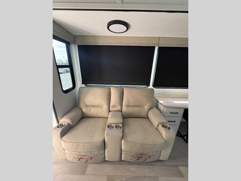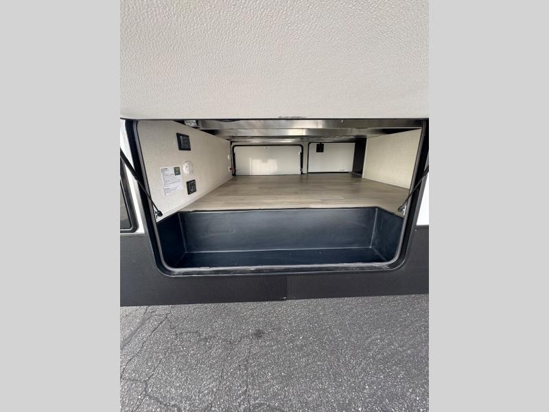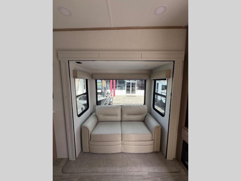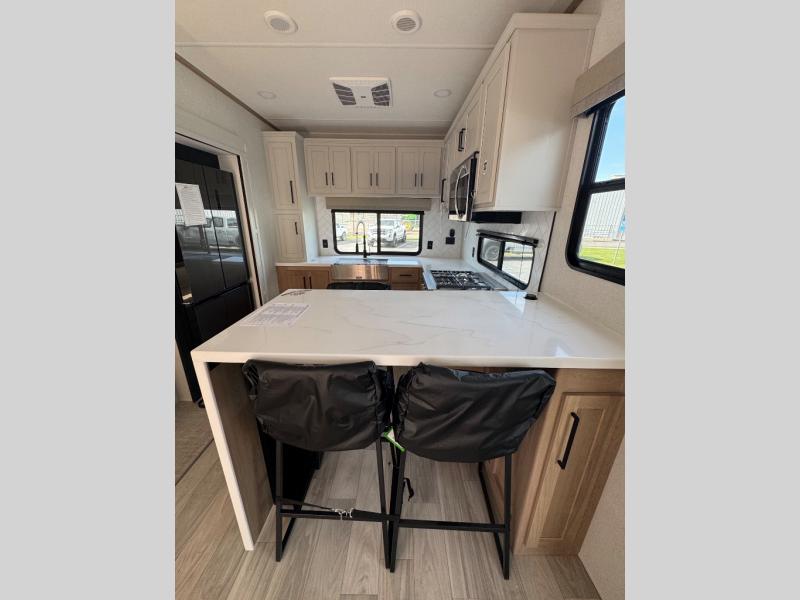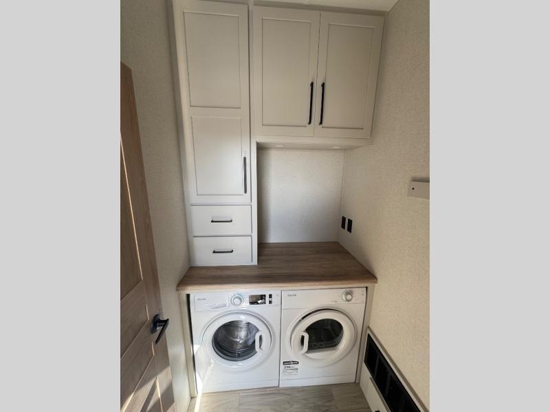 If you're looking to go full-time RVing, this fifth wheel is packed with convenient features! The master bedroom includes a king bed slide out with USB ports on either side of the bed so you both can charge your phones, and there is a dresser for your folded clothes. You will love the front bathroom with dual bath sinks, a shower with a seat, plus a walk-in closet with shelves, rods to hand clothes, and baskets for laundry! There is a unique middle utility room with washer and dryer, Washer and dryer counter and a rod to hang clothes that will make a perfect laundry room, or you can utilize this space for storage! Head to the main living area to relax on the theater seating or hide-a-bed sofa, and if you have guests stay over, they can sleep here. There is also an entertainment center with a 50" flat screen TV, but you might just leave that off if you're working at the desk with a chair that is provided. We've saved the best part for last; the kitchen! Here, you'll find ample counter space to prep home-cooked meals, a three burner high output range with a 22" oven, plus a large counter with barstools where you can enjoy breakfast at each morning. Choosing this fifth wheel is a no-brainer!