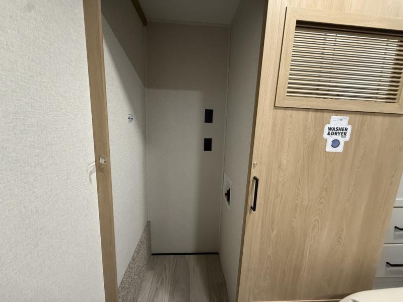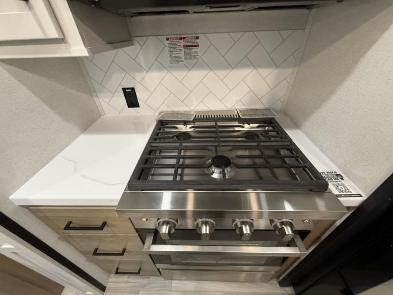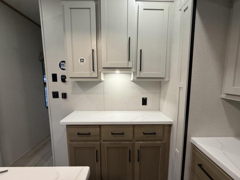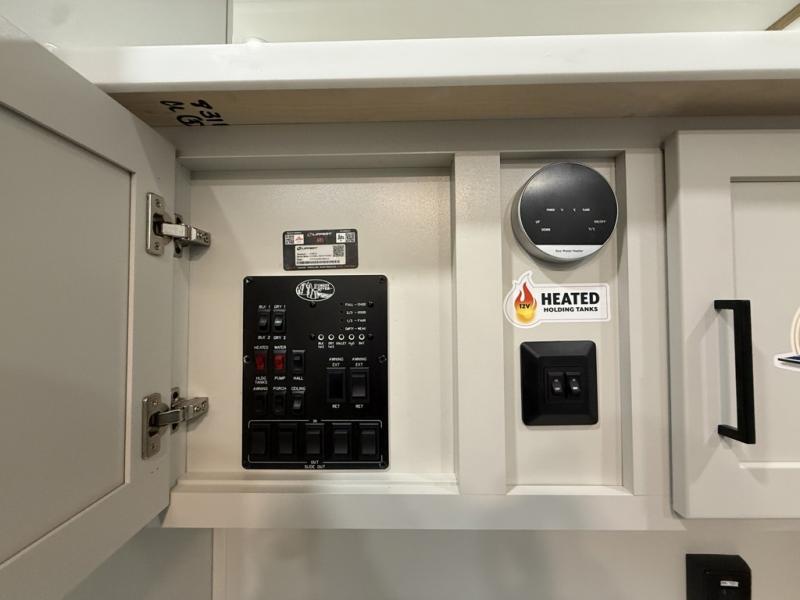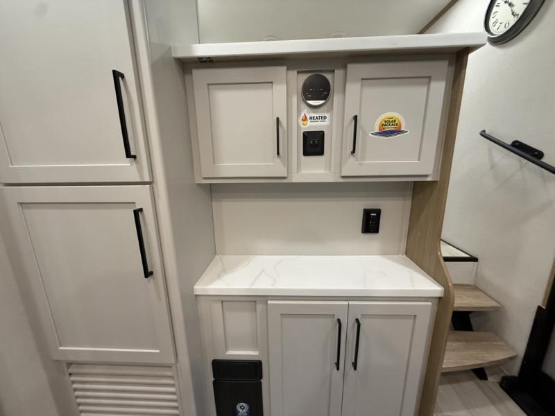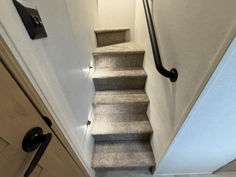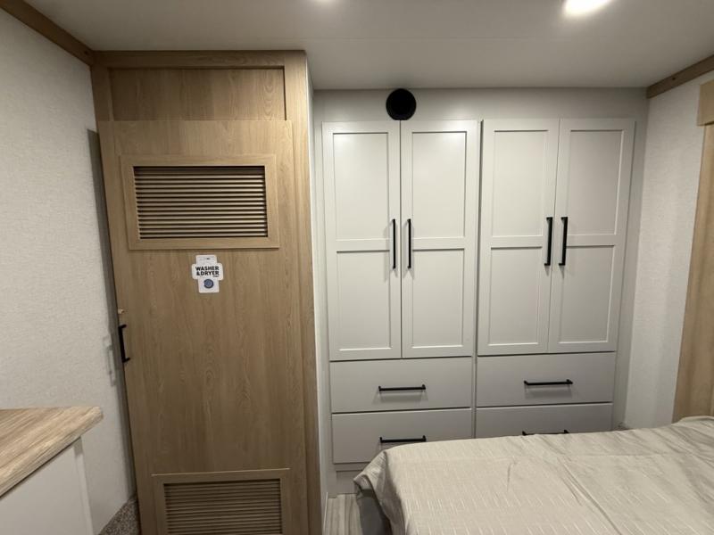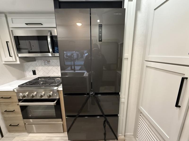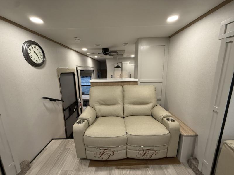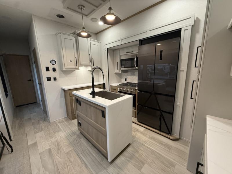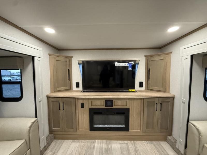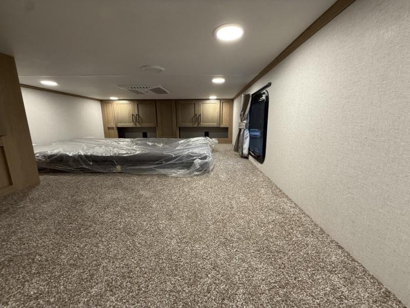 The perfect fifth wheel for a larger family! This unit sleeps eight or more with the full and half lofts above the rear master bedroom and bathroom. In the full loft area there are two 44" x 74" bunk mats for comfort as well as wardrobe/storage at the head of each. The master bedroom features a king size bed that slides out to create more space by the bed. A spacious bath features a walk-in shower for comfort and includes a seat so you can relax while you shower. A spacious kitchen features two slides, a free standing dinette in one, and the 12V refrigerator and stove in the other. There is also a center island with large sink for added food prep space. Head up the steps in front to a dual slide front living area with 50" TV and fireplace beneath the window. There is also theater seating opposite the TV, and a tri-fold hide-a-bed in each slide allowing added sleeping space when needed.