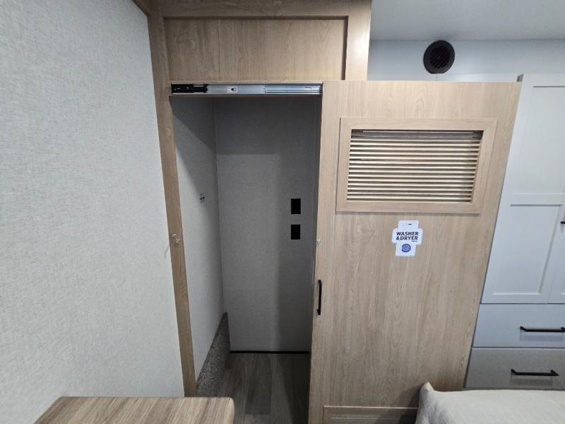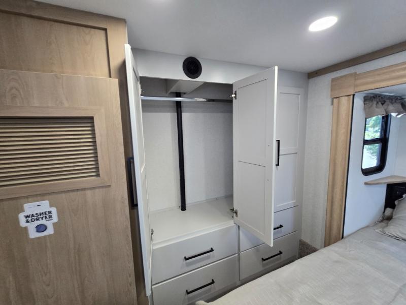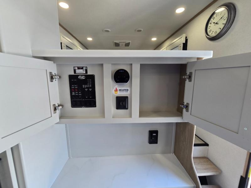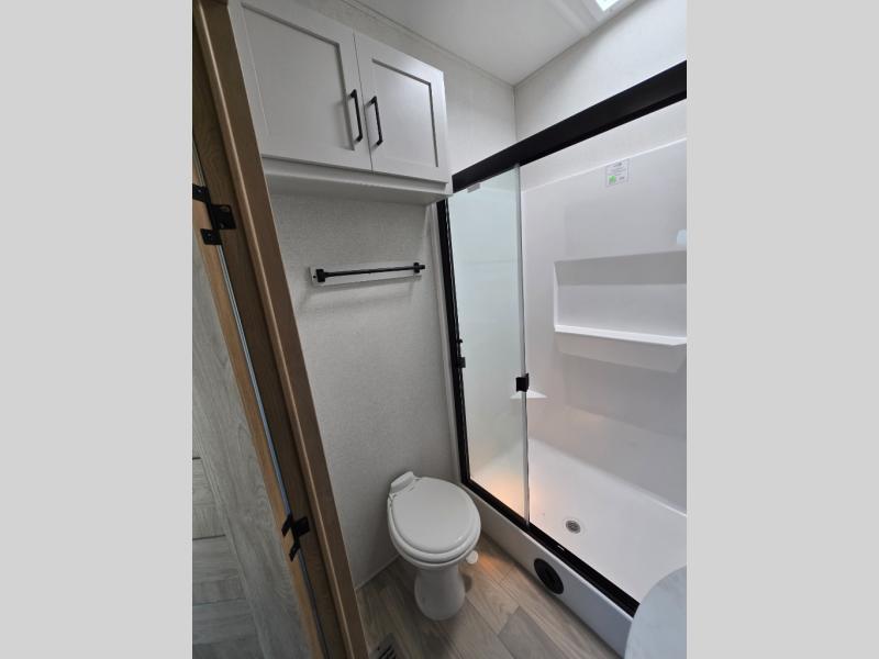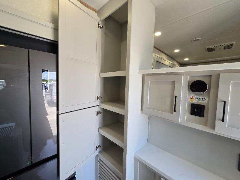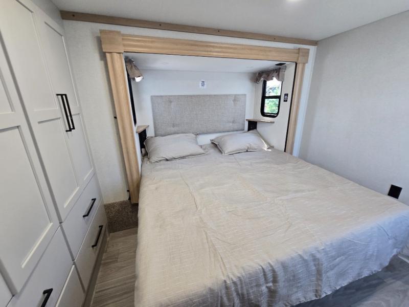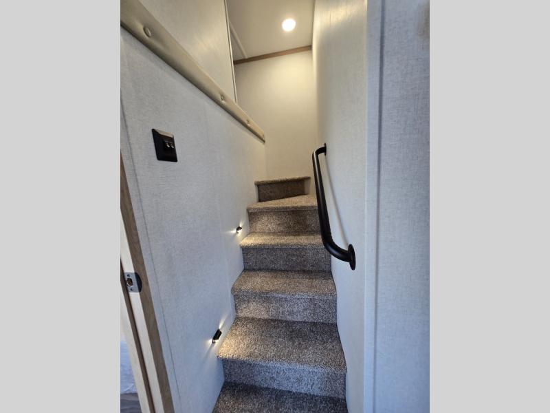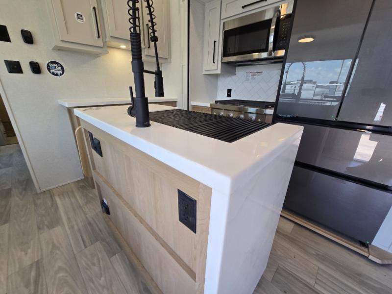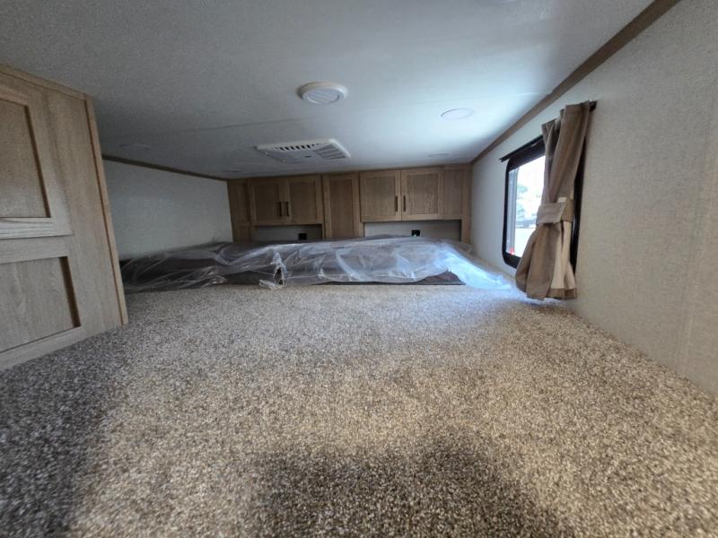 The perfect fifth wheel for a larger family! This unit sleeps eight or more with the full and half lofts above the rear master bedroom and bathroom. In the full loft area there are two 44" x 74" bunk mats for comfort as well as wardrobe/storage at the head of each. The master bedroom features a king size bed that slides out to create more space by the bed. A spacious bath features a walk-in shower for comfort and includes a seat so you can relax while you shower. A spacious kitchen features two slides, a free standing dinette in one, and the 12V refrigerator and stove in the other. There is also a center island with large sink for added food prep space. Head up the steps in front to a dual slide front living area with 50" TV and fireplace beneath the window. There is also theater seating opposite the TV, and a tri-fold hide-a-bed in each slide allowing added sleeping space when needed.