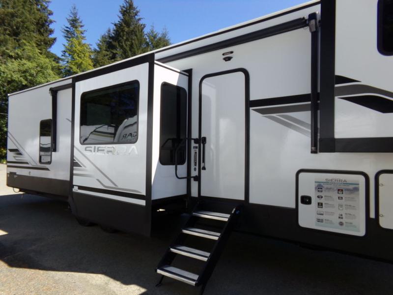 Each one of these Forest River Sierra fifth wheels are equipped with everything you need to make the most of each adventure! The underbelly armor will protect your unit's vitals from road debris and the painted two tone aerodynamic fiberglass front cap has an improved turning radius to make them easier to navigate. With an electric leveling system, you can set your unit up quick and easy then get to having fun faster than ever. The welded aluminum framed, vacuum bonded laminated superstructure will hold up through every adventure and the cambered powder coated frame comes with rust prohibitor to last longer. Each model also includes the Summit Package that comes with a king Wi-Fi extender system and Olympus antenna, a full coach water filter system, Goodyear tires with 7,000 lb. axles, and the list goes on. The interior is just as impressive with rustic wood plank linoleum, recessed residential lighting, a memory foam mattress, and mocha accent crown molding over the kitchen cabinets!