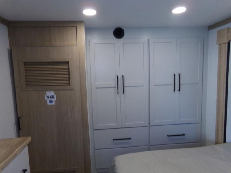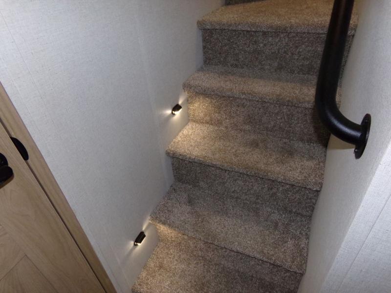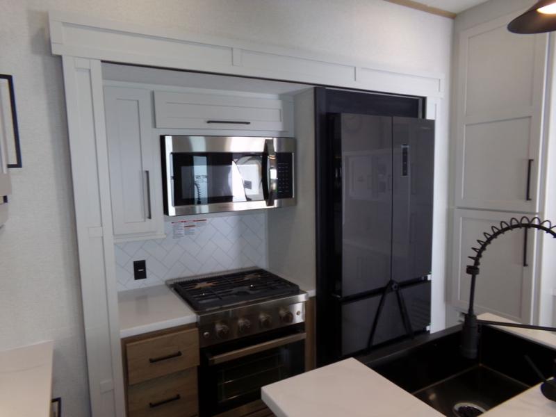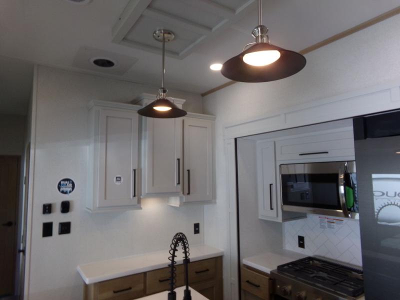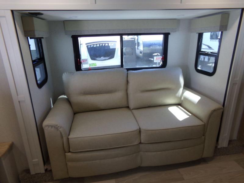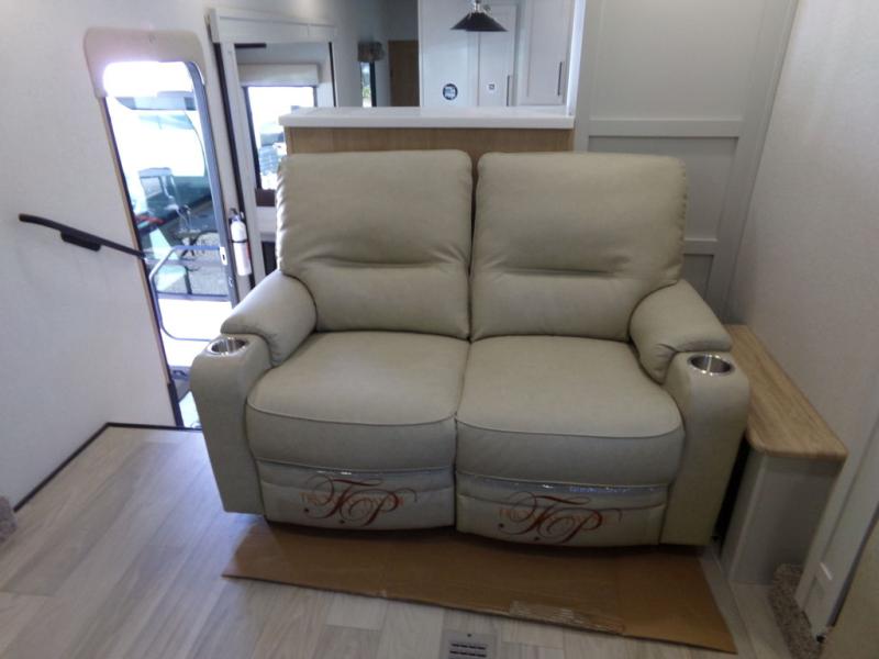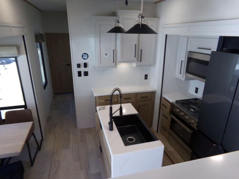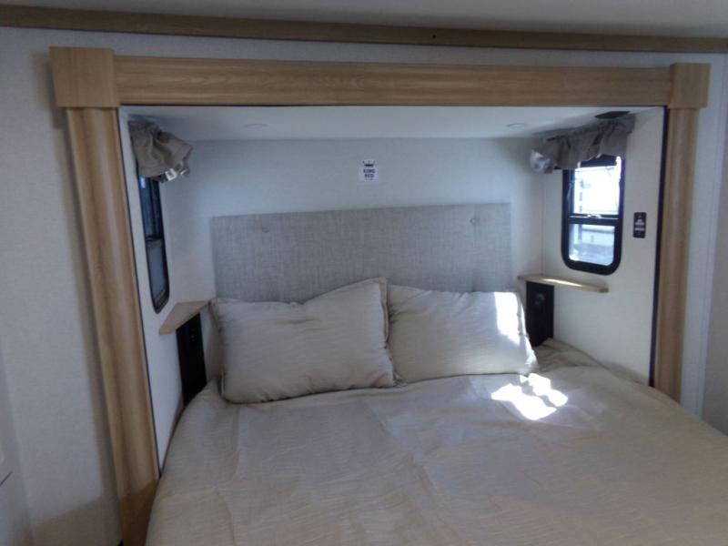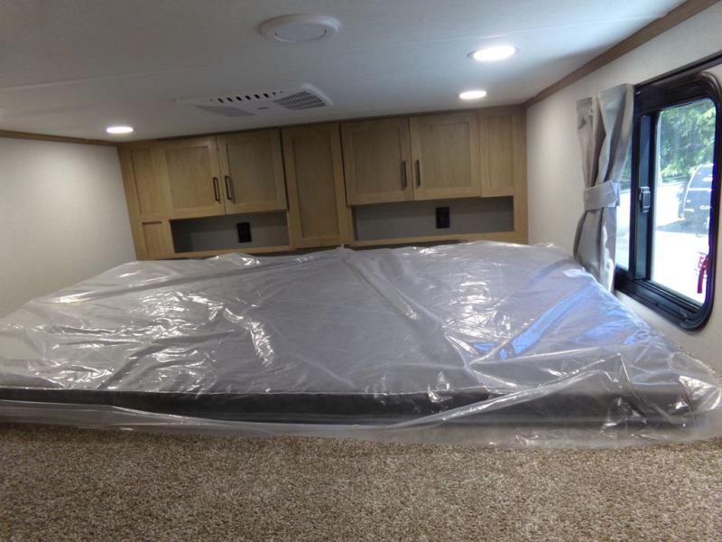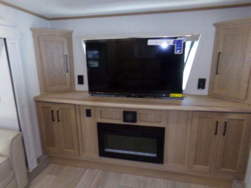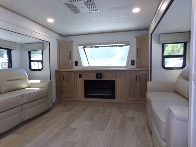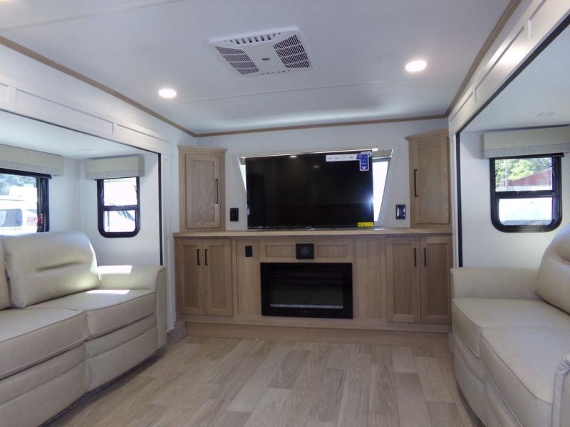 The perfect fifth wheel for a larger family! This unit sleeps eight or more with the full and half lofts above the rear master bedroom and bathroom. In the full loft area there are two 44" x 74" bunk mats for comfort as well as wardrobe/storage at the head of each. The master bedroom features a king size bed that slides out to create more space by the bed. A spacious bath features a walk-in shower for comfort and includes a seat so you can relax while you shower. A spacious kitchen features two slides, a free standing dinette in one, and the 12V refrigerator and stove in the other. There is also a center island with large sink for added food prep space. Head up the steps in front to a dual slide front living area with 50" TV and fireplace beneath the window. There is also theater seating opposite the TV, and a tri-fold hide-a-bed in each slide allowing added sleeping space when needed.