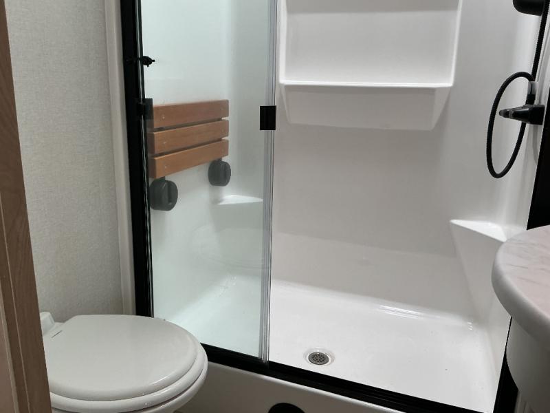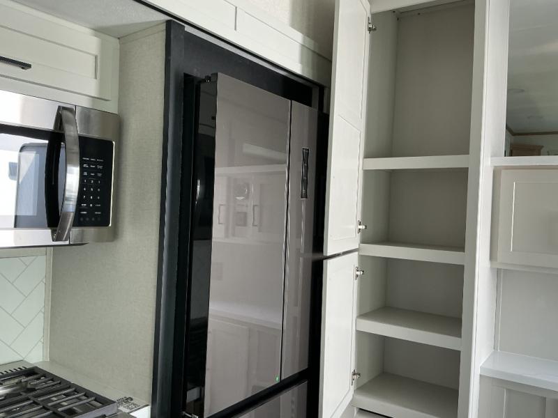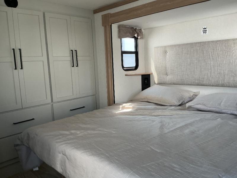The perfect fifth wheel for a larger family! This unit sleeps eight or more with the full and half lofts above the rear master bedroom and bathroom. In the full loft area there are two 44" x 74" bunk mats for comfort as well as wardrobe/storage at the head of each. The master bedroom features a king size bed that slides out to create more space by the bed. A spacious bath features a walk-in shower for comfort and includes a seat so you can relax while you shower. A spacious kitchen features two slides, a free standing dinette in one, and the 12V refrigerator and stove in the other. There is also a center island with large sink for added food prep space. Head up the steps in front to a dual slide front living area with 50" TV and fireplace beneath the window. There is also theater seating opposite the TV, and a tri-fold hide-a-bed in each slide allowing added sleeping space when needed.