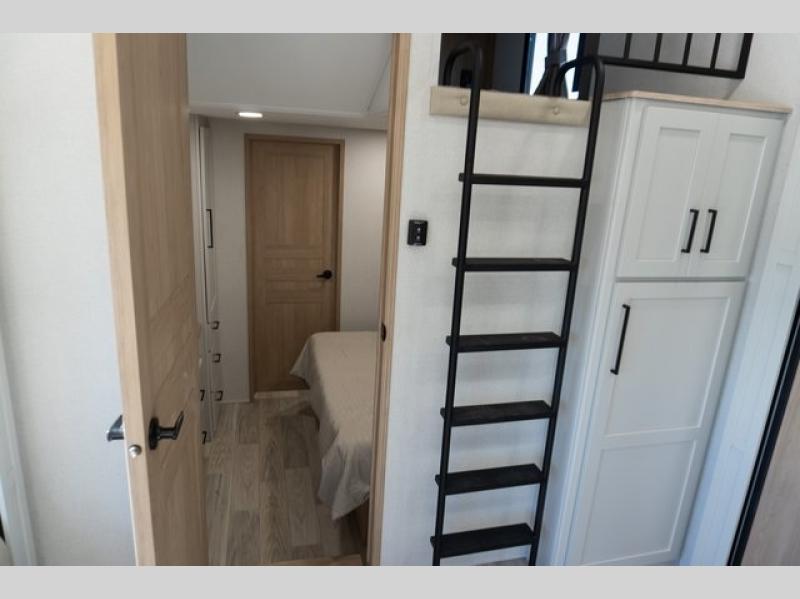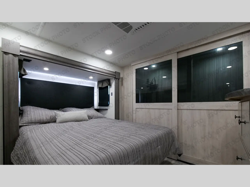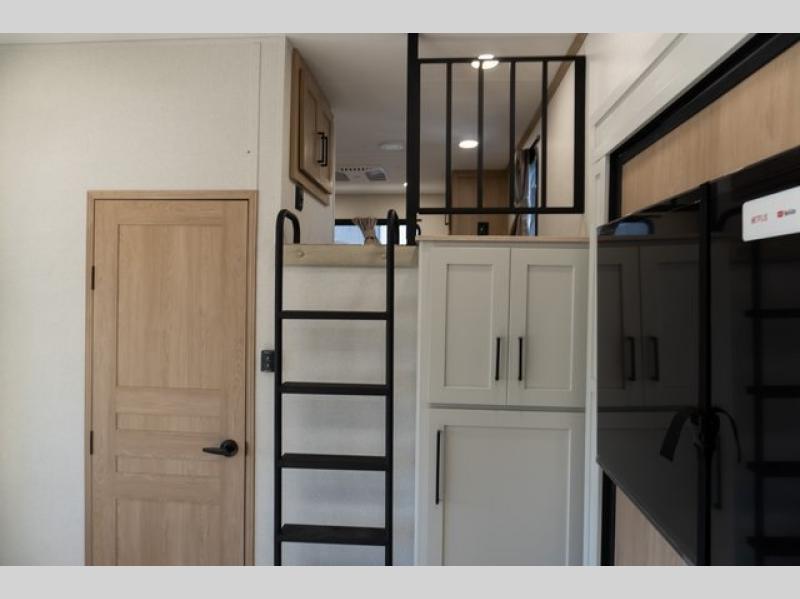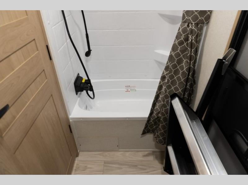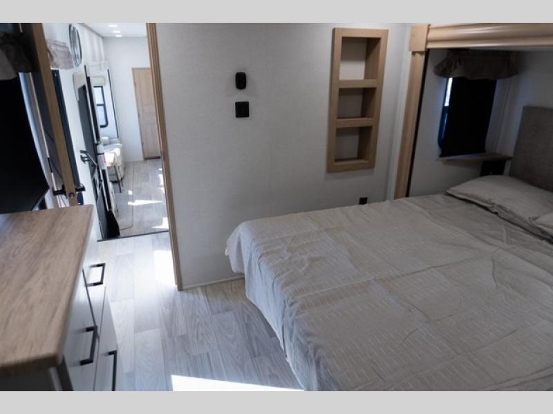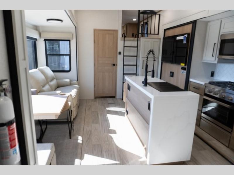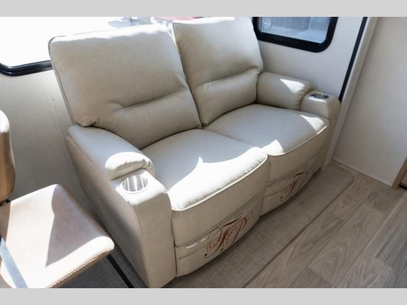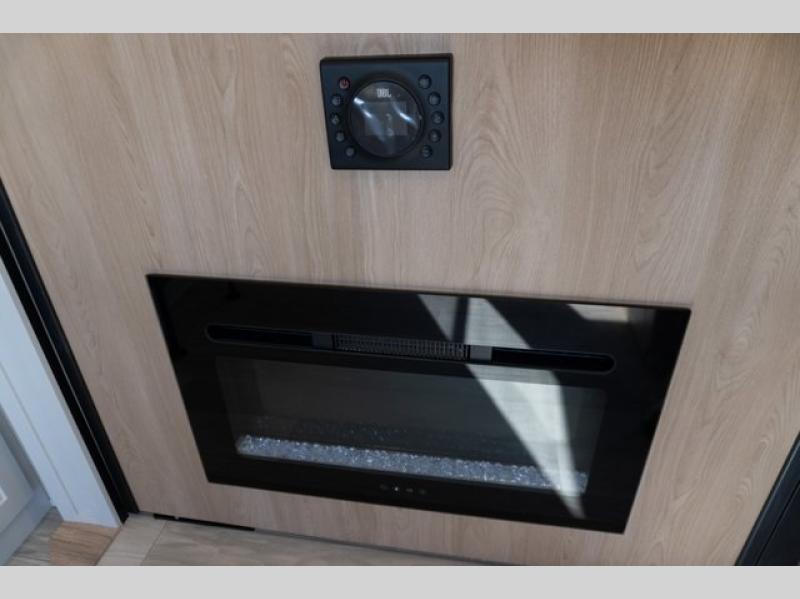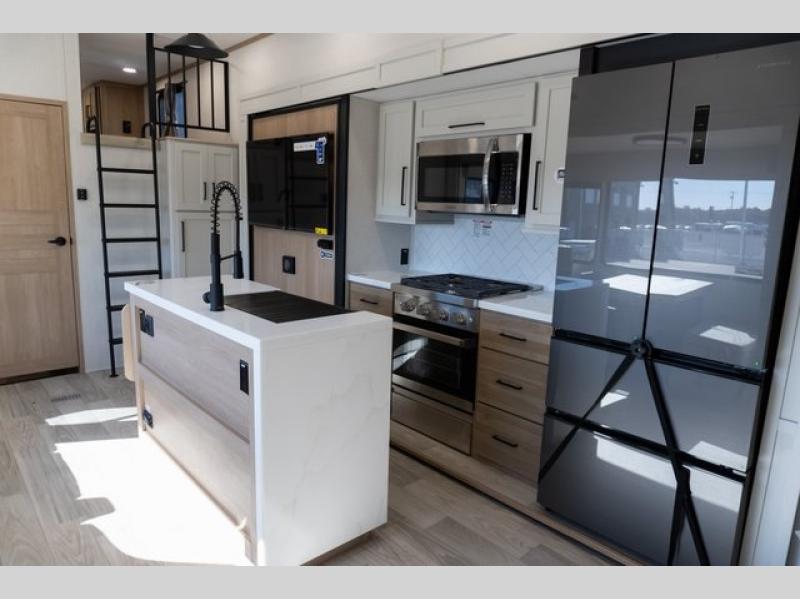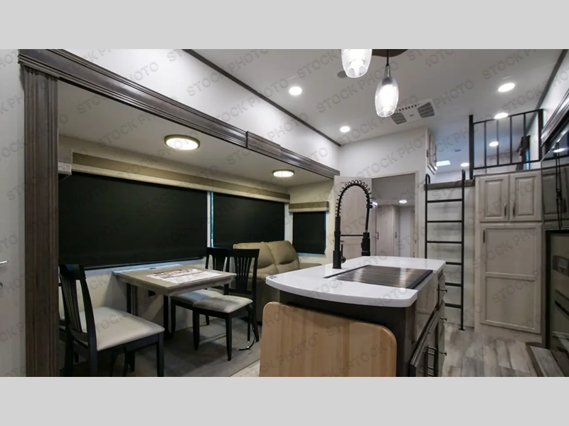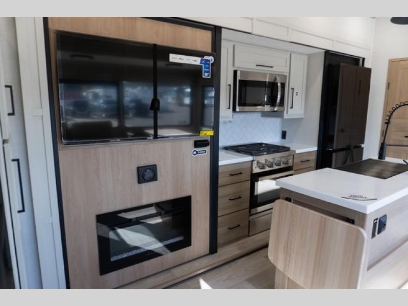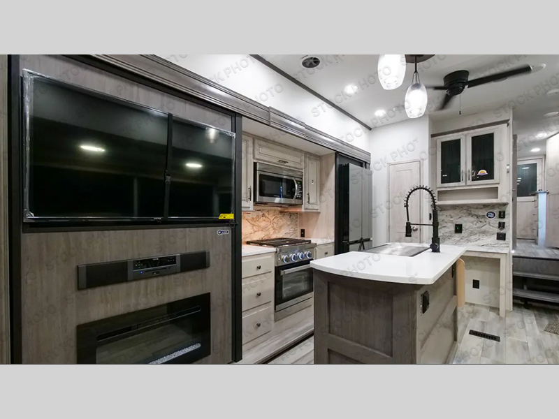 Enjoy a home on wheels with this fifth wheel! There are two bedrooms to choose from plus an upper loft with two 32" x 74" bunk mats, cabinets, and TV prep. The front private bedroom has a queen bed slide across from a dresser and a front wardrobe that is prepped to add an optional washer and dryer. The second bedroom has a queen bed slide across from a dresser with wardrobes on either side, plus it's very own full rear bathroom which has a 36" x 24" tub and a rear entry/exit door to the unit. The second full bathroom has a shower with a seat so everyone can get ready quickly in the morning. Prepare your best home cooked meals with the kitchen island and three burner cooktop then enjoy it at the free standing dinette. Relax in true comfort each night in the theater seating across from the fireplace and 50" TV at the entertainment center!