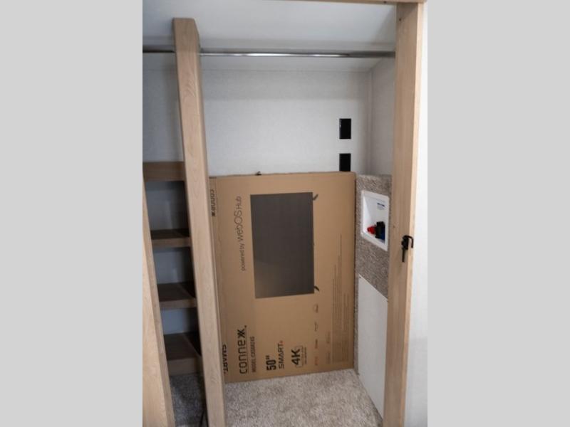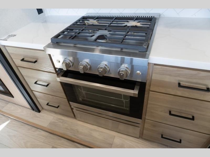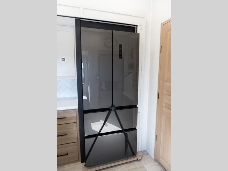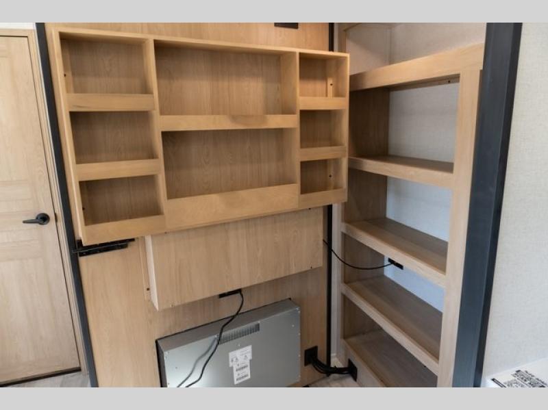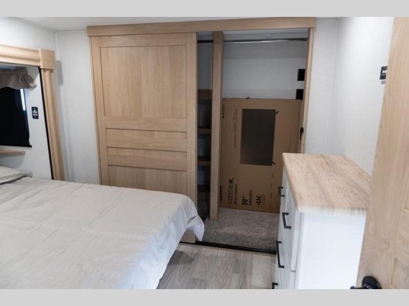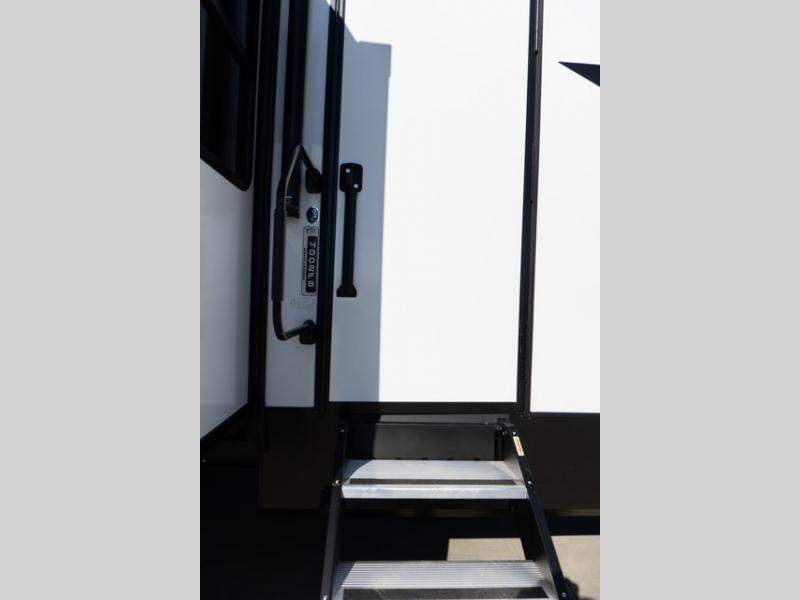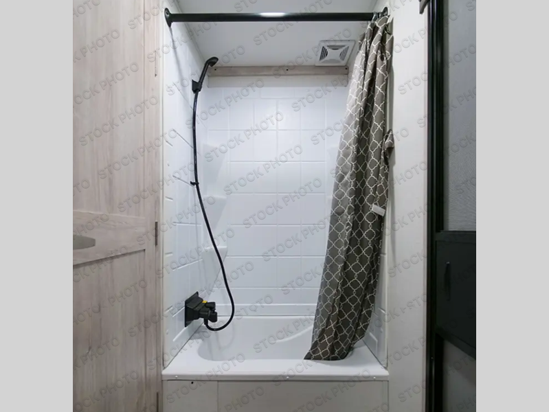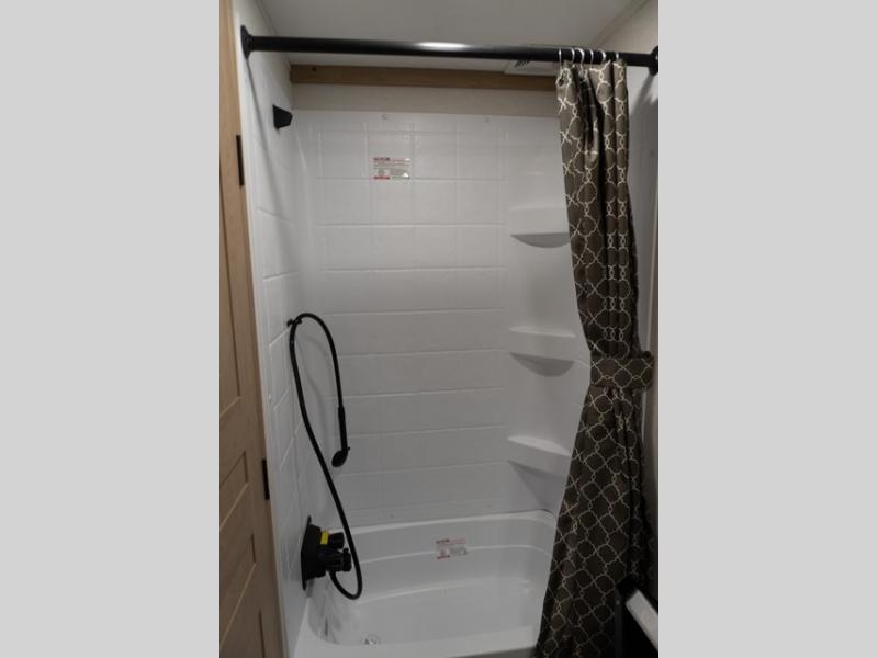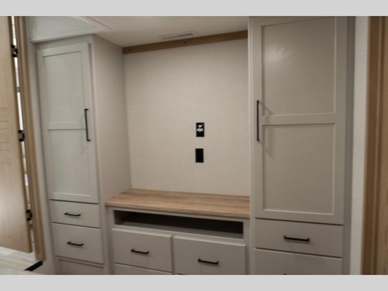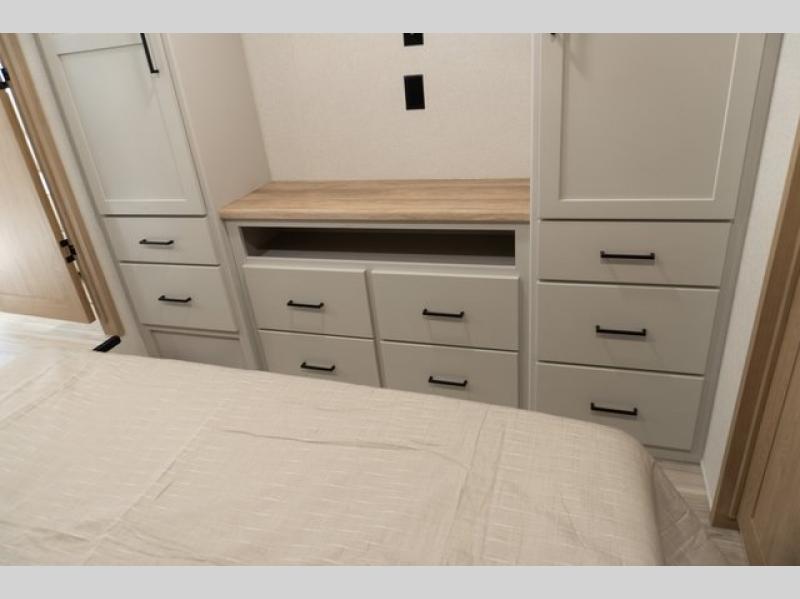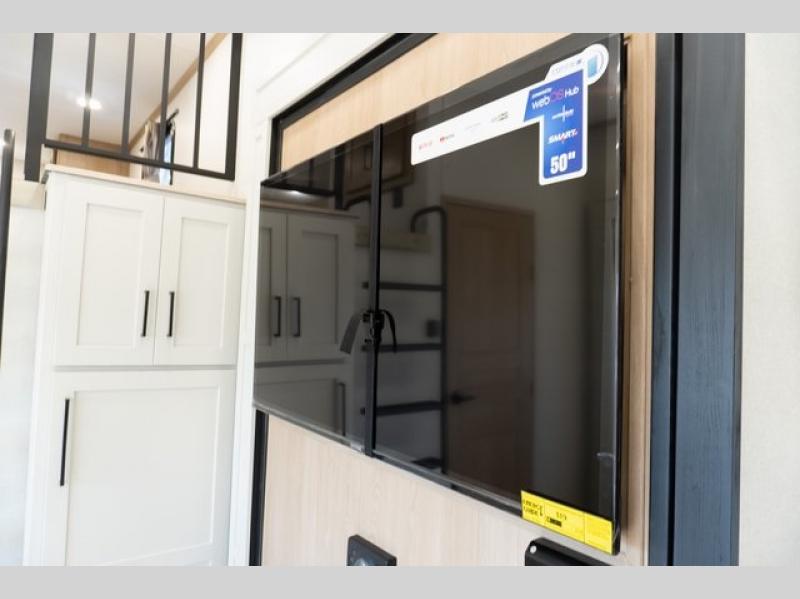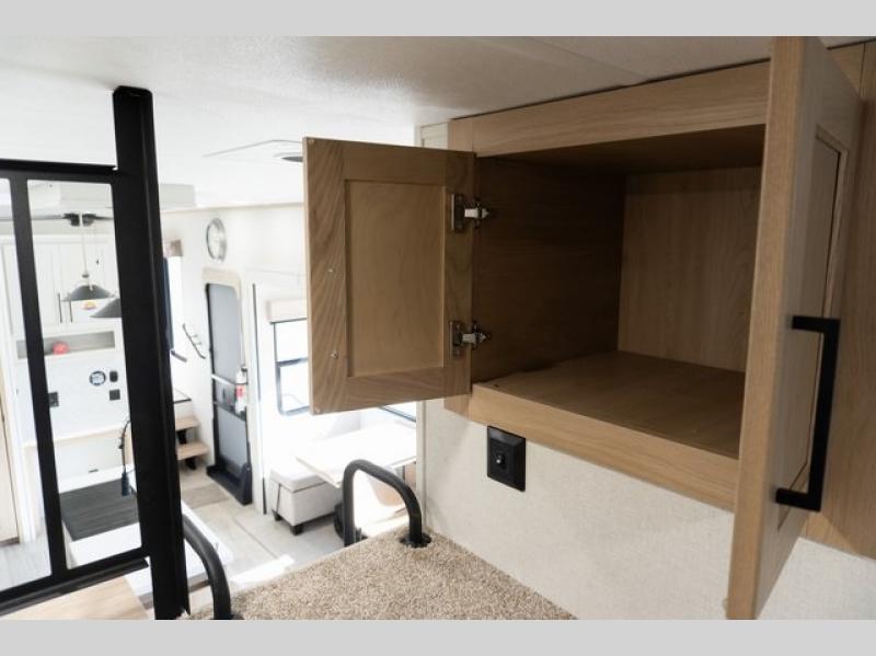 Enjoy a home on wheels with this fifth wheel! There are two bedrooms to choose from plus an upper loft with two 32" x 74" bunk mats, cabinets, and TV prep. The front private bedroom has a queen bed slide across from a dresser and a front wardrobe that is prepped to add an optional washer and dryer. The second bedroom has a queen bed slide across from a dresser with wardrobes on either side, plus it's very own full rear bathroom which has a 36" x 24" tub and a rear entry/exit door to the unit. The second full bathroom has a shower with a seat so everyone can get ready quickly in the morning. Prepare your best home cooked meals with the kitchen island and three burner cooktop then enjoy it at the free standing dinette. Relax in true comfort each night in the theater seating across from the fireplace and 50" TV at the entertainment center!