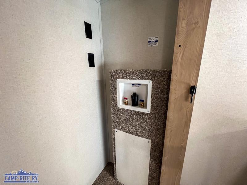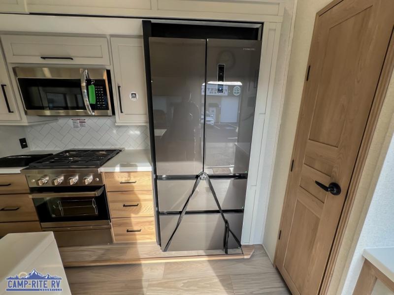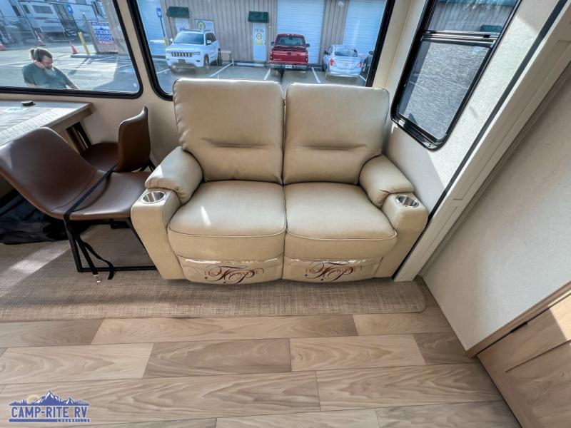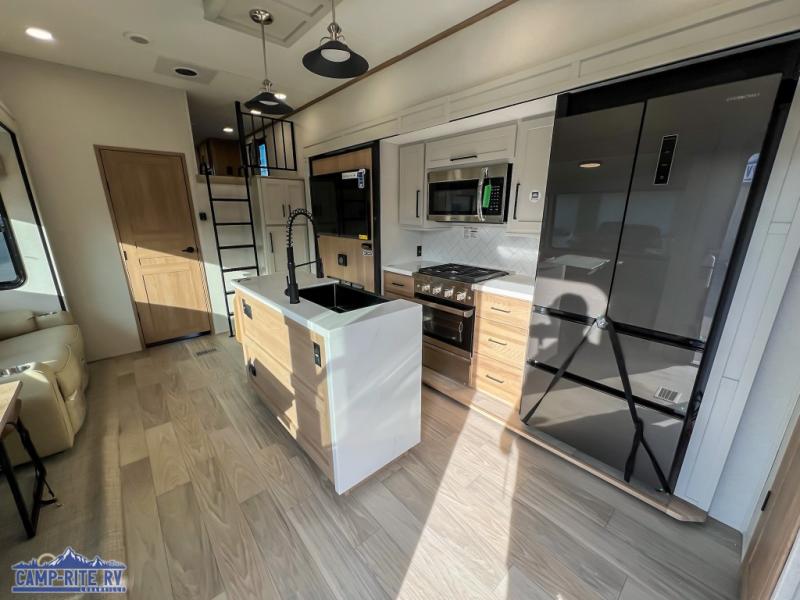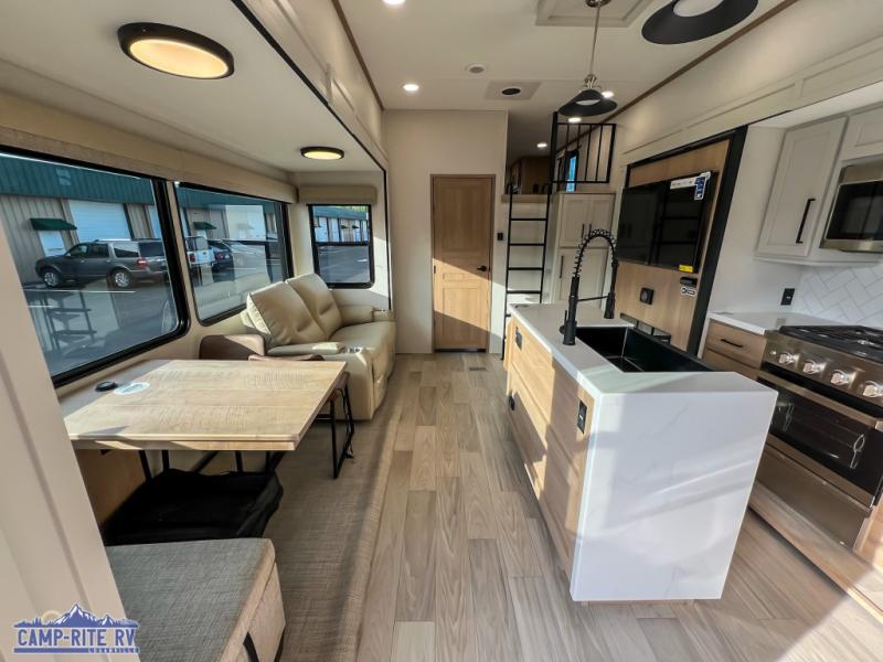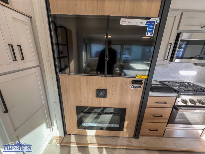 Enjoy a home on wheels with this fifth wheel! There are two bedrooms to choose from plus an upper loft with two 32" x 74" bunk mats, cabinets, and TV prep. The front private bedroom has a queen bed slide across from a dresser and a front wardrobe that is prepped to add an optional washer and dryer. The second bedroom has a queen bed slide across from a dresser with wardrobes on either side, plus it's very own full rear bathroom which has a 36" x 24" tub and a rear entry/exit door to the unit. The second full bathroom has a shower with a seat so everyone can get ready quickly in the morning. Prepare your best home cooked meals with the kitchen island and three burner cooktop then enjoy it at the free standing dinette. Relax in true comfort each night in the theater seating across from the fireplace and 50" TV at the entertainment center!