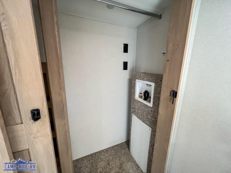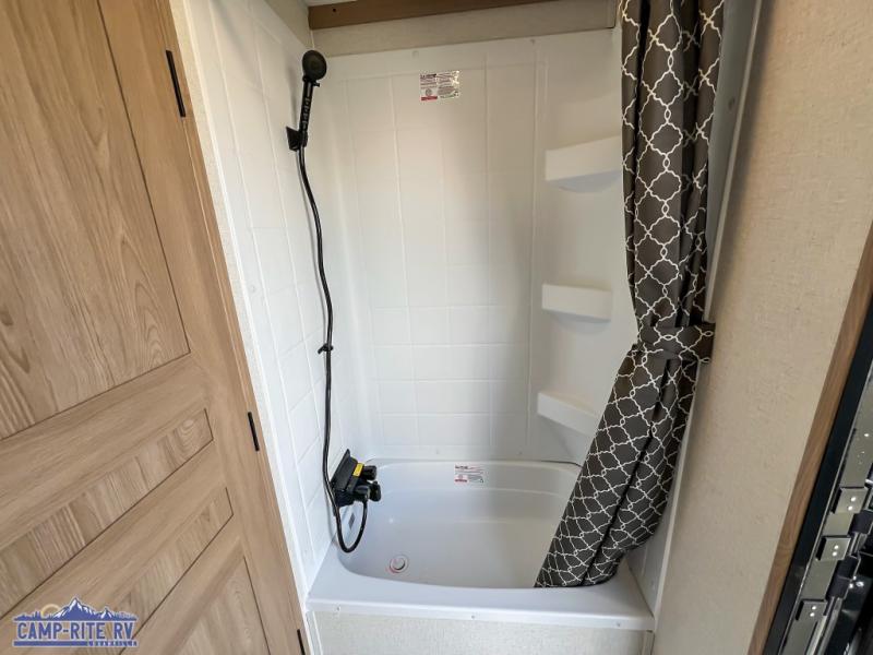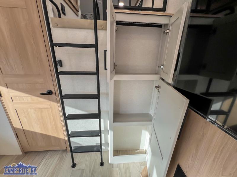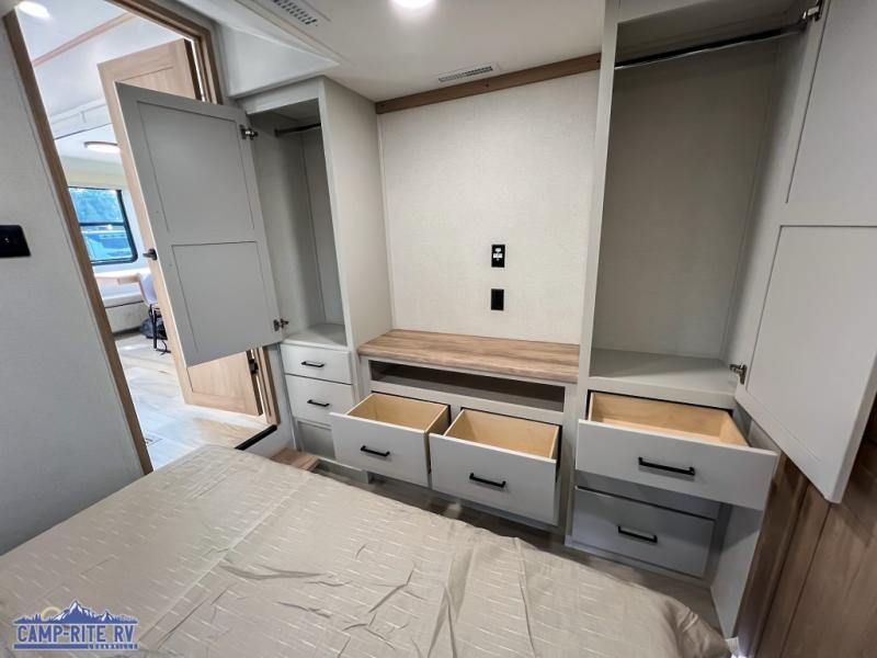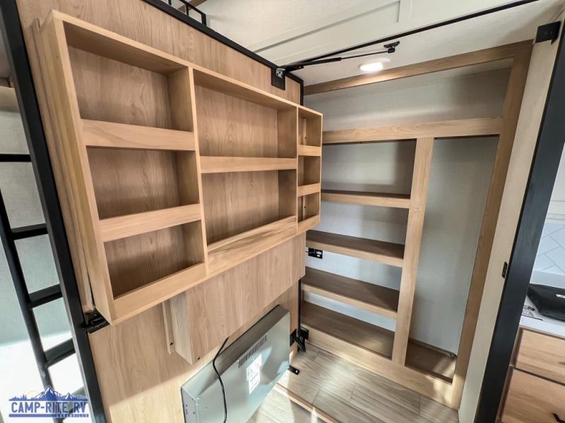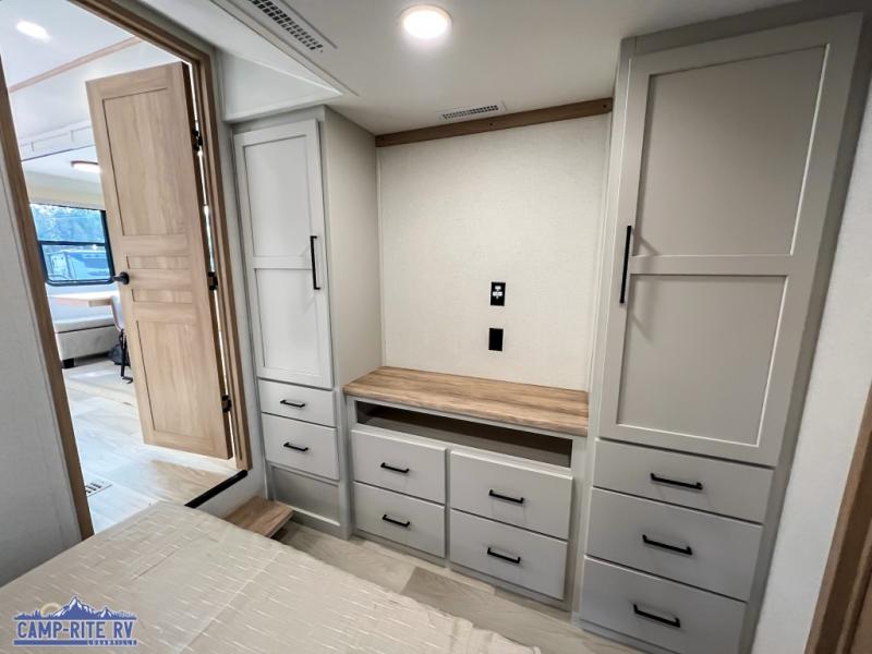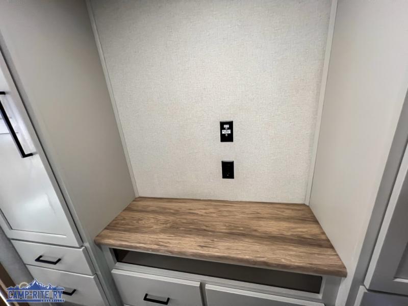 Enjoy a home on wheels with this fifth wheel! There are two bedrooms to choose from plus an upper loft with two 32" x 74" bunk mats, cabinets, and TV prep. The front private bedroom has a queen bed slide across from a dresser and a front wardrobe that is prepped to add an optional washer and dryer. The second bedroom has a queen bed slide across from a dresser with wardrobes on either side, plus it's very own full rear bathroom which has a 36" x 24" tub and a rear entry/exit door to the unit. The second full bathroom has a shower with a seat so everyone can get ready quickly in the morning. Prepare your best home cooked meals with the kitchen island and three burner cooktop then enjoy it at the free standing dinette. Relax in true comfort each night in the theater seating across from the fireplace and 50" TV at the entertainment center!