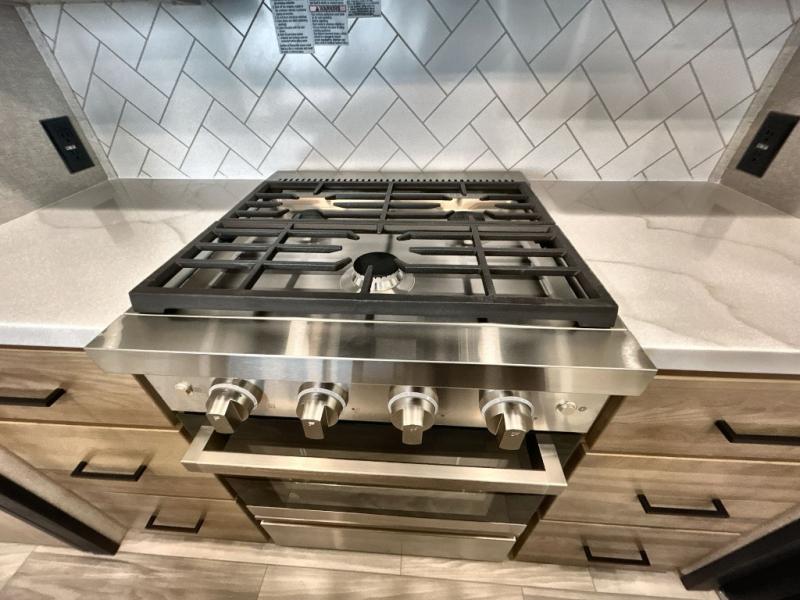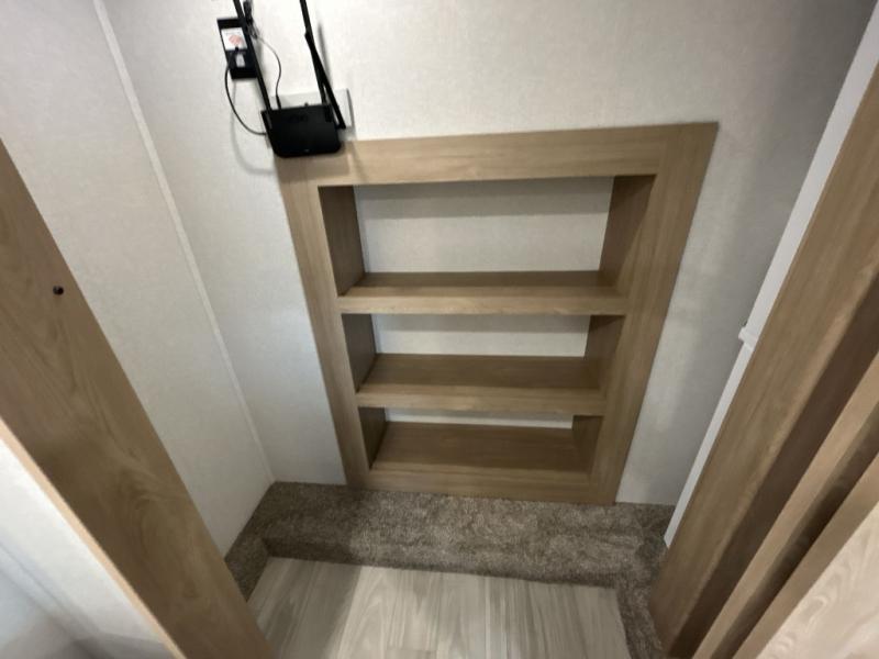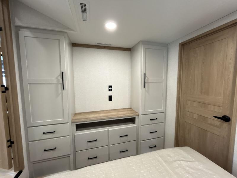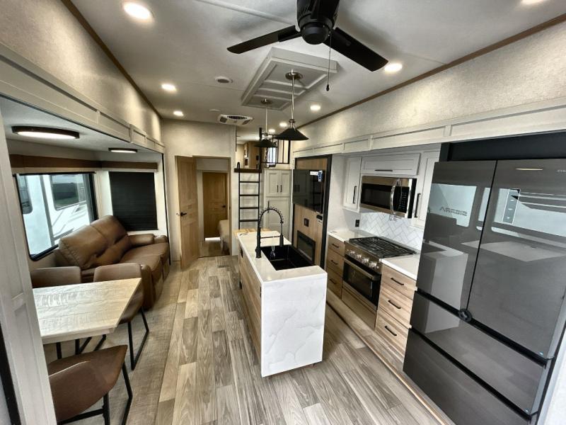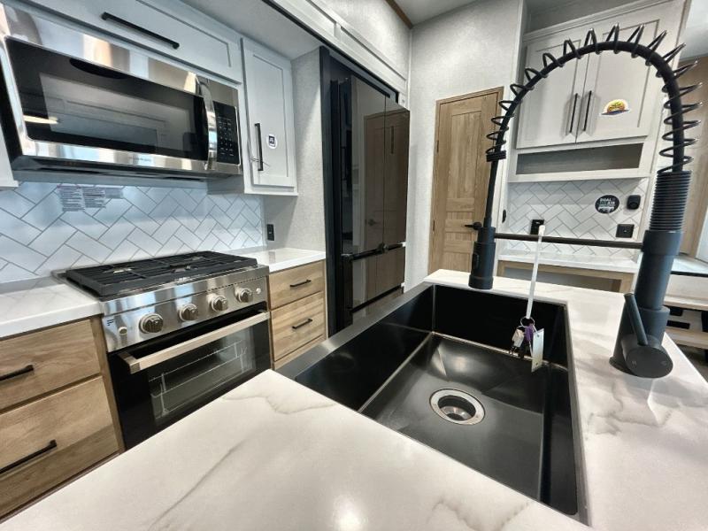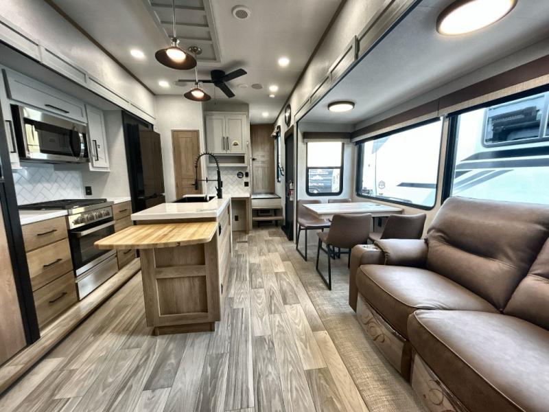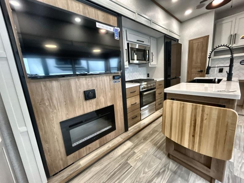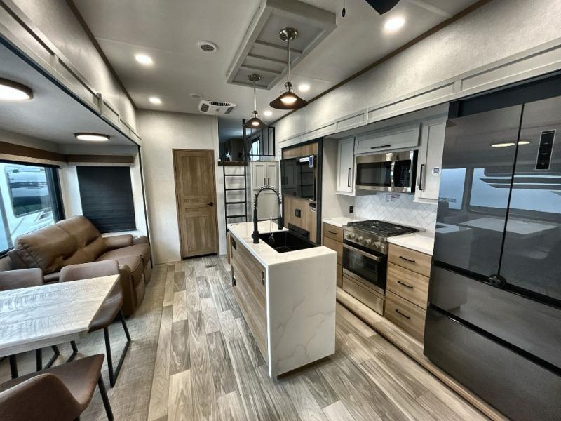 Enjoy a home on wheels with this fifth wheel! There are two bedrooms to choose from plus an upper loft with two 32" x 74" bunk mats, cabinets, and TV prep. The front private bedroom has a queen bed slide across from a dresser and a front wardrobe with washer and dryer. The second bedroom has a queen bed slide across from a dresser with wardrobes on either side, plus it's very own full rear bathroom which has a 36" x 24" tub and a rear entry/exit door to the unit. The second full bathroom has a shower with a seat so everyone can get ready quickly in the morning. Prepare your best home cooked meals with the kitchen island and three burner cooktop then enjoy it at the free standing dinette. Relax in true comfort each night in the theater seating across from the fireplace and 50" TV at the entertainment center!