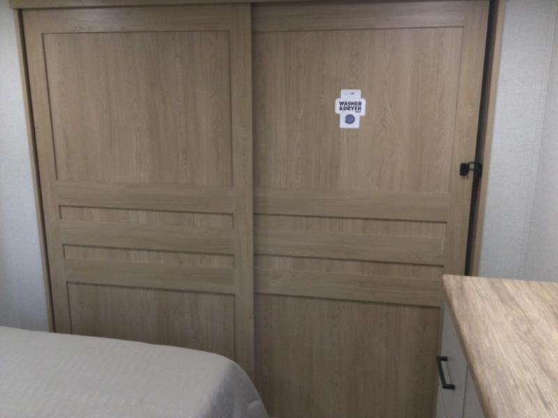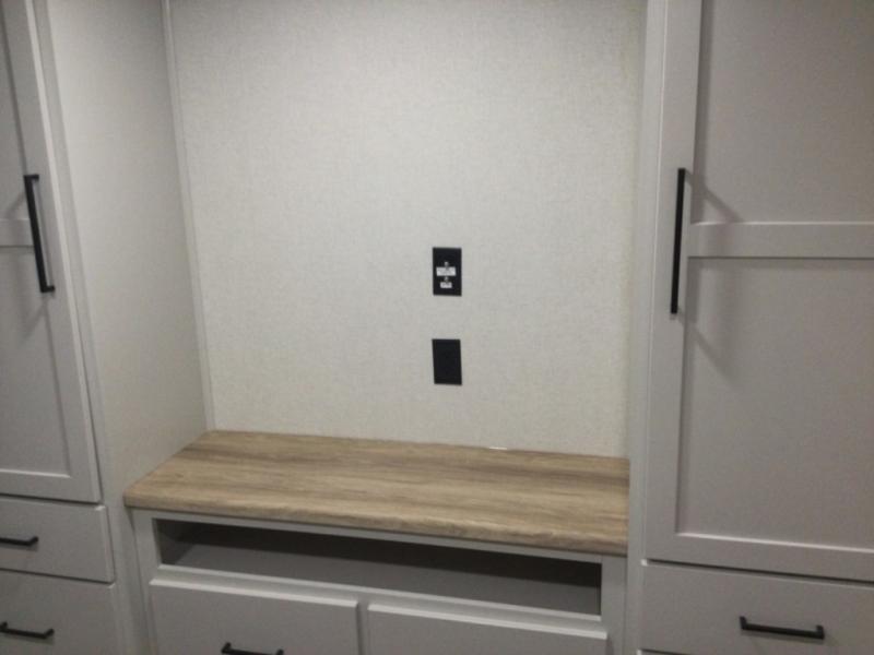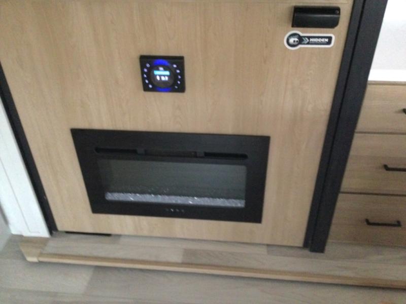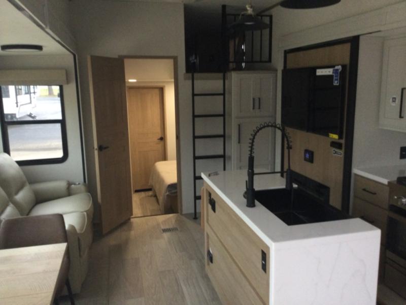 Enjoy a home on wheels with this fifth wheel! There are two bedrooms to choose from plus an upper loft with two 32" x 74" bunk mats, cabinets, and TV prep. The front private bedroom has a queen bed slide across from a dresser and a front wardrobe that is prepped to add an optional washer and dryer. The second bedroom has a queen bed slide across from a dresser with wardrobes on either side, plus it's very own full rear bathroom which has a 36" x 24" tub and a rear entry/exit door to the unit. The second full bathroom has a shower with a seat so everyone can get ready quickly in the morning. Prepare your best home cooked meals with the kitchen island and three burner cooktop then enjoy it at the free standing dinette. Relax in true comfort each night in the theater seating across from the fireplace and 50" TV at the entertainment center!