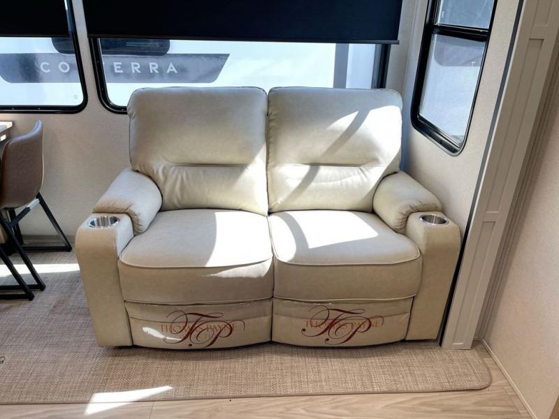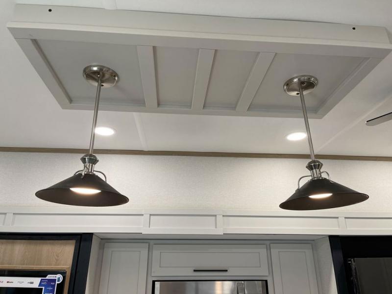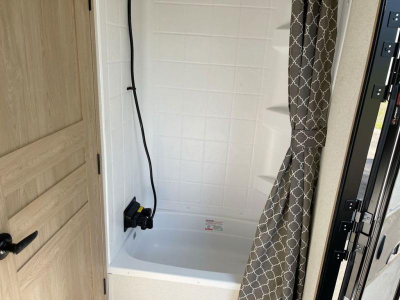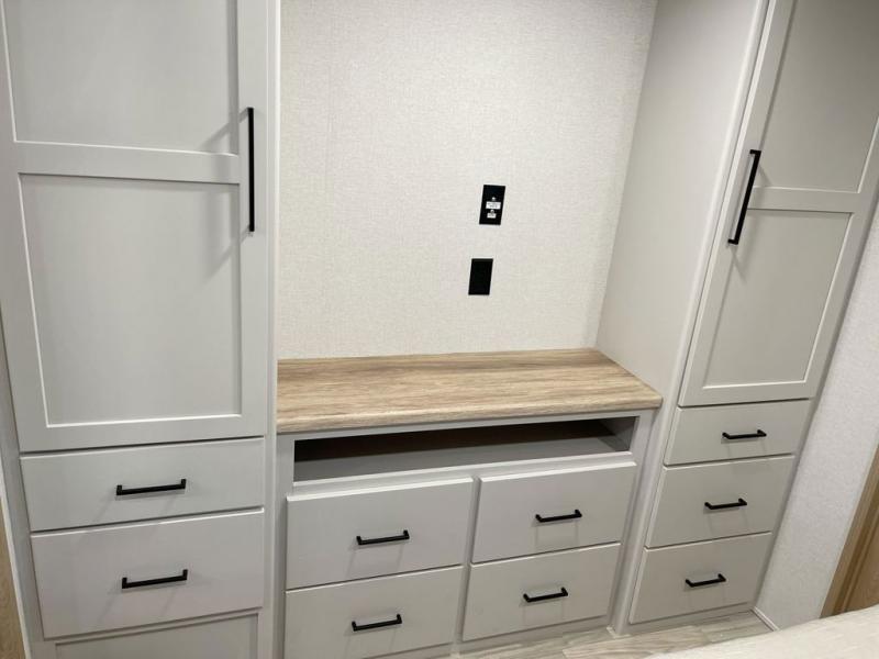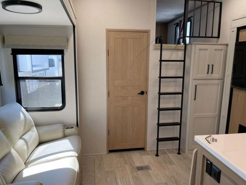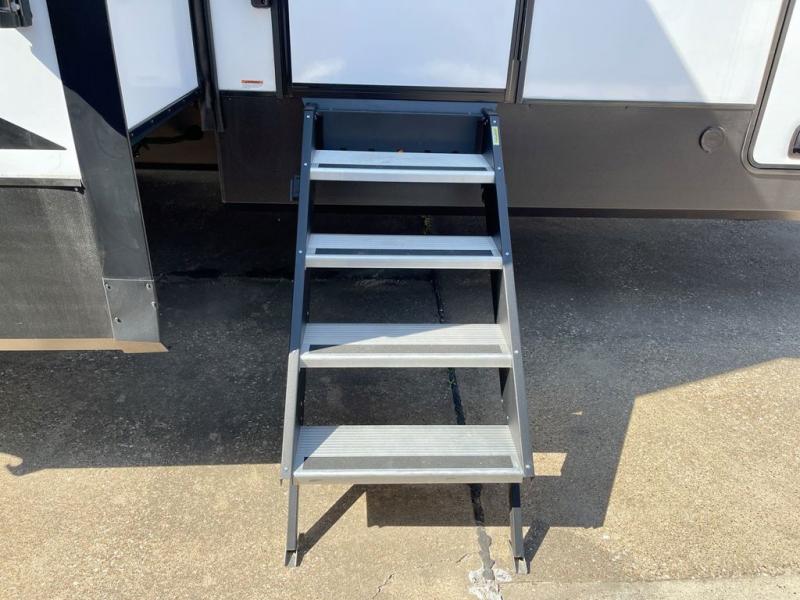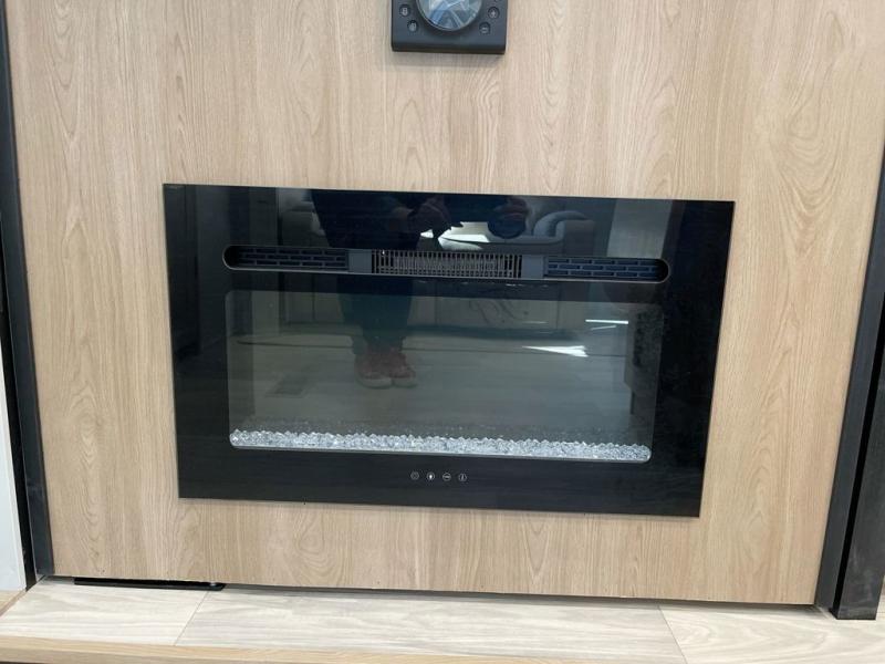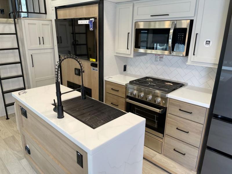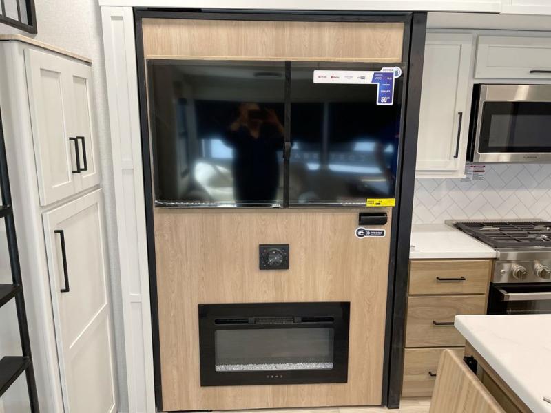 Enjoy a home on wheels with this fifth wheel! There are two bedrooms to choose from plus an upper loft with two 32" x 74" bunk mats, cabinets, and TV prep. The front private bedroom has a queen bed slide across from a dresser and a front wardrobe that is prepped to add an optional washer and dryer. The second bedroom has a queen bed slide across from a dresser with wardrobes on either side, plus it's very own full rear bathroom which has a 36" x 24" tub and a rear entry/exit door to the unit. The second full bathroom has a shower with a seat so everyone can get ready quickly in the morning. Prepare your best home cooked meals with the kitchen island and three burner cooktop then enjoy it at the free standing dinette. Relax in true comfort each night in the theater seating across from the fireplace and 50" TV at the entertainment center!